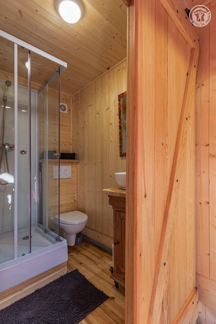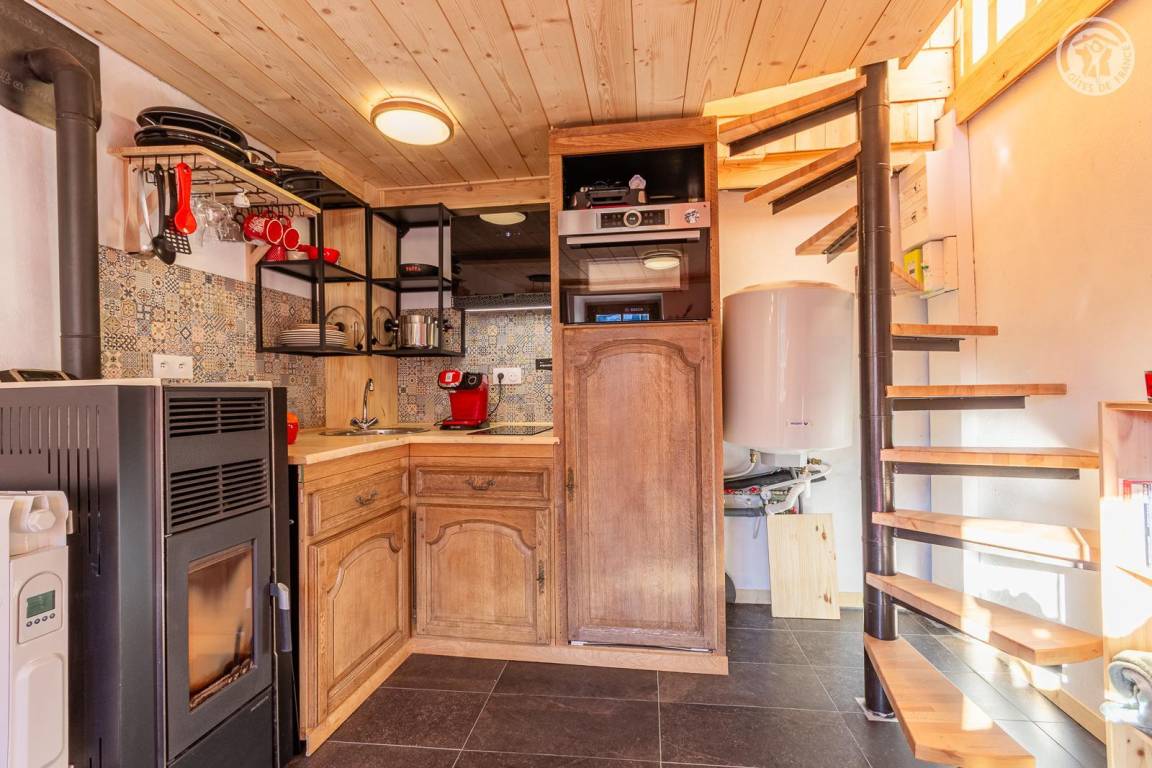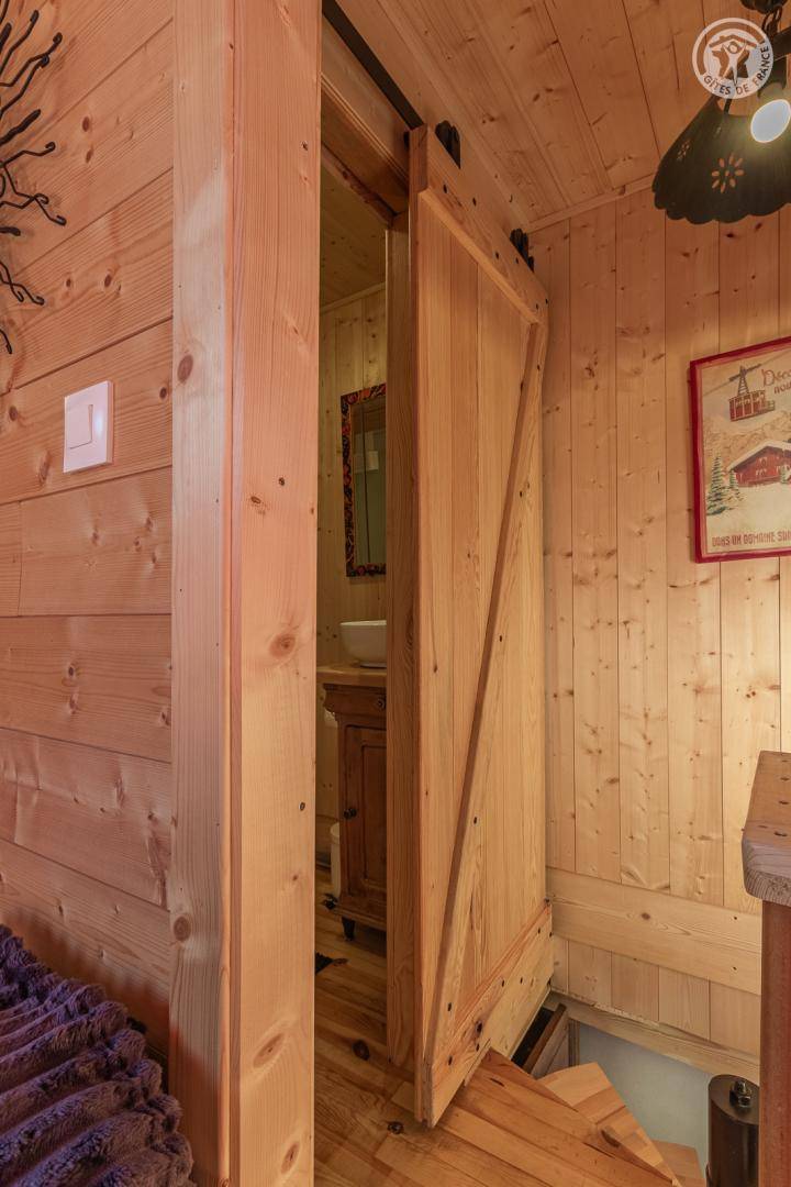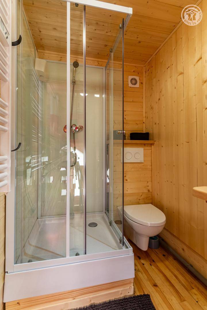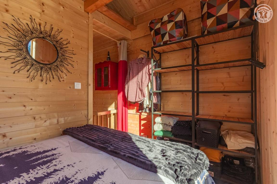 Freistehendes Chalet auf zwei Ebenen. Im Erdgeschoss befinden sich ein Wohn-/Essbereich mit Küche (Kombination aus Mikrowelle und Backofen) und eine Sitzecke (ohne Fernseher). Über eine Wendeltreppe gelangt man in das Obergeschoss mit einem Schlafzimmer (Doppelbett 140 x 190 cm) und eigenem Duschbad (Dusche und WC) sowie Zugang zu einem Balkon (mit Tisch und zwei Stühlen). Das Be- und Entladen ist direkt vor dem Chalet möglich; kostenlose öffentliche Parkplätze stehen 200 m entfernt am Ortseingang zur Verfügung.