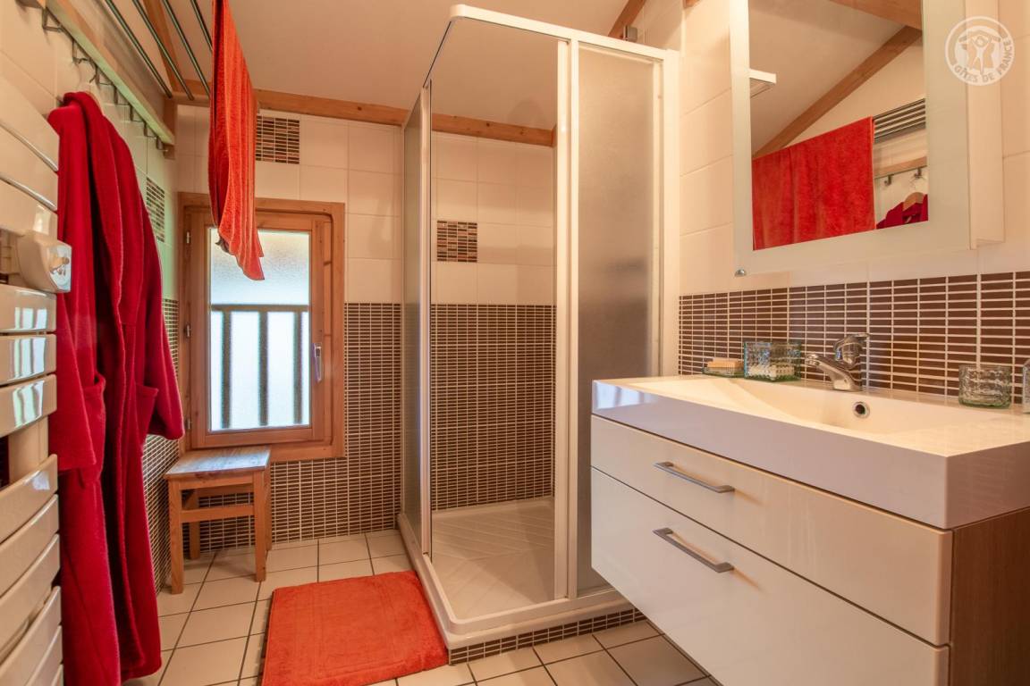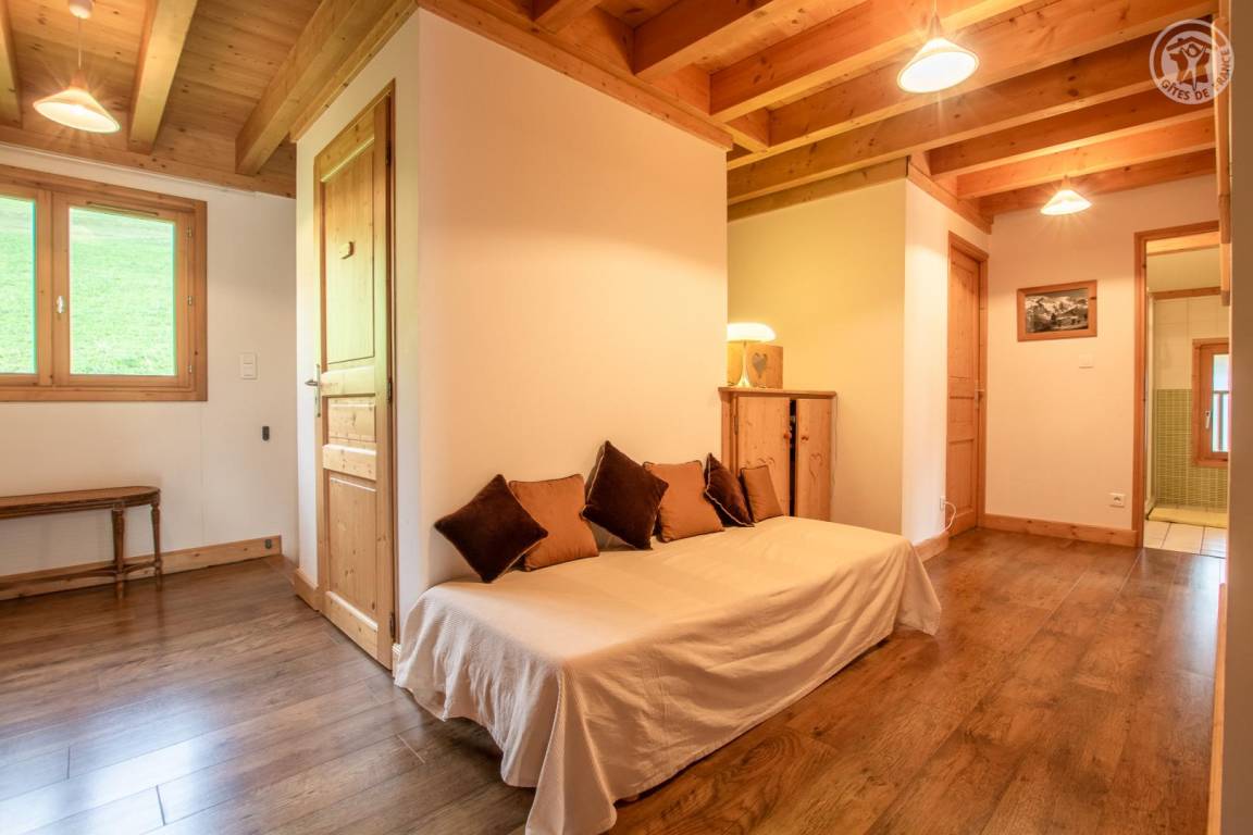 Individuelles Chalet auf 3 Ebenen. Garage 50 Meter unterhalb der Gte, dann Zugang über einen Weg mit leichtem Höhenunterschied. Erdgeschoss: Eingang, 1 Schlafzimmer (2 Einzelbetten 90x190 cm), WC, Waschküche mit Waschmaschine und Trockner, Skiraum, Ruhebereich (Sauna inklusive / Spa mit kostenpflichtigem Zugang: wenden Sie sich an den Eigentümer). 1. Stock: Küche-Wohnzimmer-Esszimmer, WC, Abstellraum. 2. Stock: 4 Schlafzimmer (1 Doppelbett 140x190 cm / 1 Doppelbett 160x190 cm / 1 Doppelbett 140x190 cm / 3 Einzelbetten 90x190 cm, davon 2 Etagenbetten und 1 Ausziehbett), 1 Bergecke mit 1 Einzelbett 90x190 cm, 2 Badezimmer (Dusche) und separates WC. Garage. Uneingezäuntes Hanggrundstück. Abfahrt auf Skiern, wenn die Schneeverhältnisse es erlauben. D