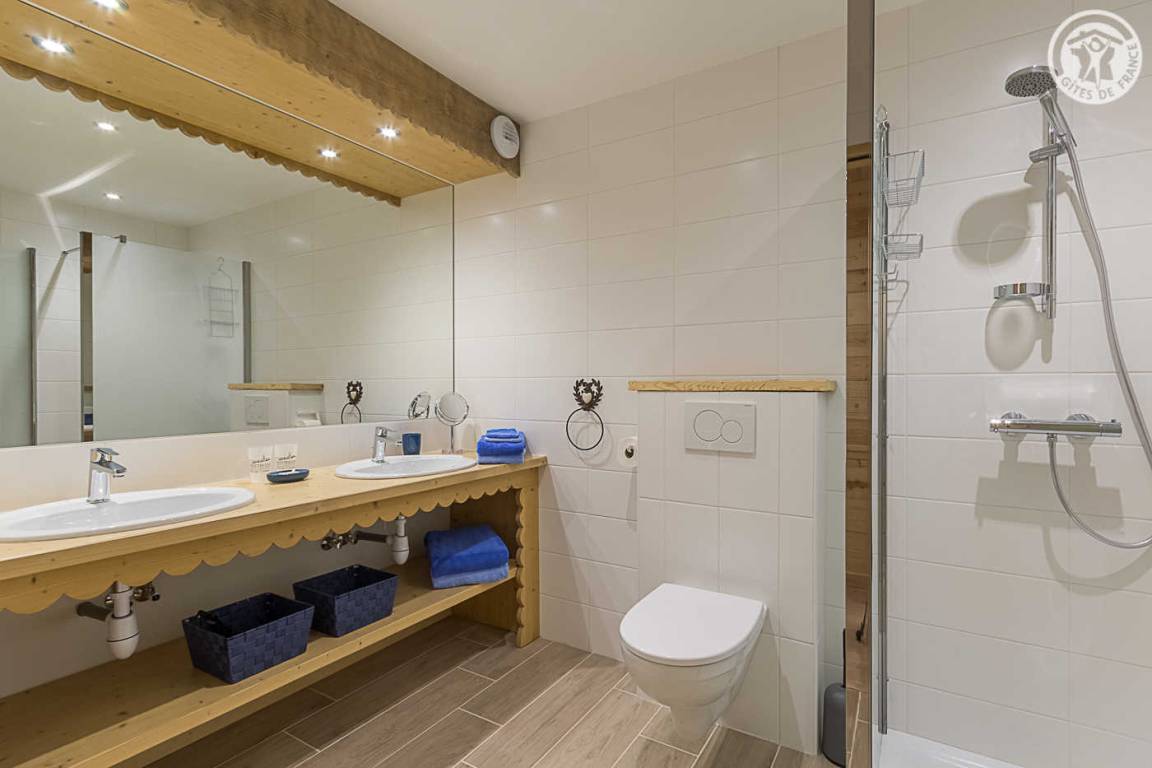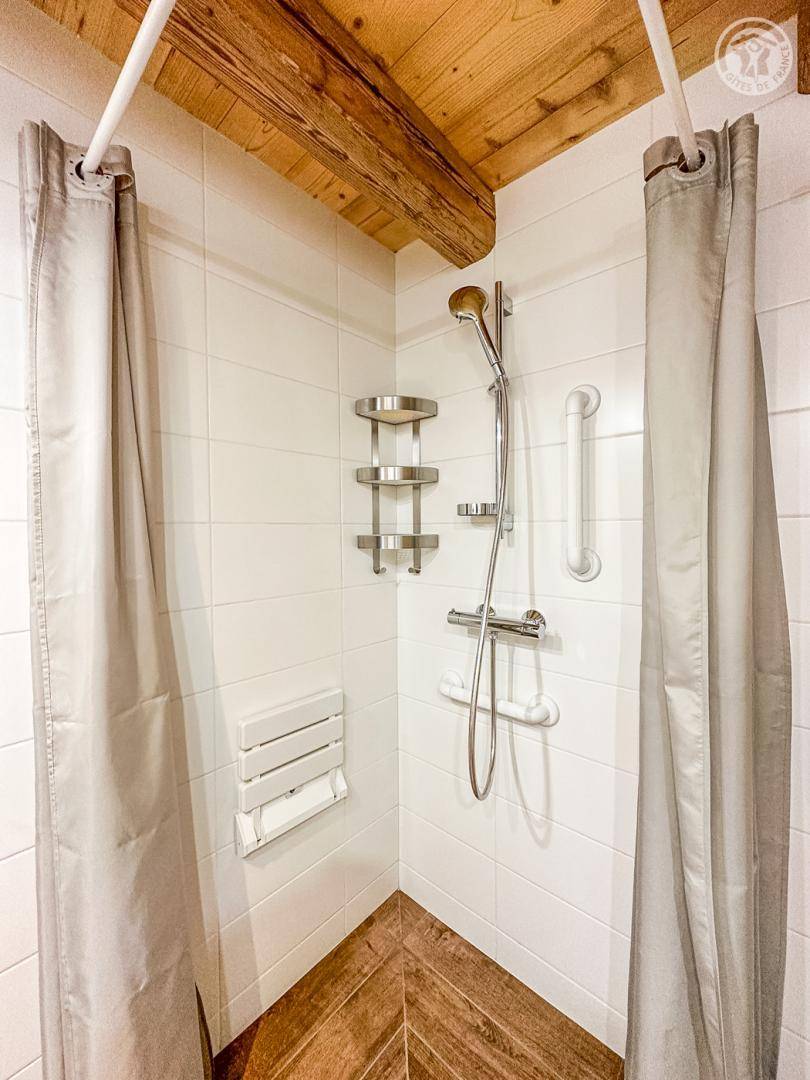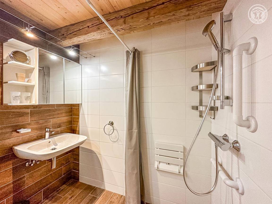 Individuelles Chalet auf 3 Ebenen mit Zugang über eine Außentreppe oder einen Aufzug vom Parkplatz aus. 1. Etage: Wohnbereich mit TV (internationale Kanäle, Bluetooth und WLAN), Wohnzimmer und Küche, ein Schlafzimmer für Personen mit eingeschränkter Mobilität, das mit dem Aufzug von der Terrasse aus erreichbar ist (1 Doppelbett 160 x 200 cm) und ein Badezimmer mit privatem Wasser (Gehweg). -in Dusche und WC mit Bar und Stützstuhl), separates WC. 2. Etage: 2 Schlafzimmer im Untergeschoss (2 Betten 90 x 190 cm mit 1 Ausziehbett 80 x 190 cm) / 3 Betten 80 x 190 cm inklusive Ausziehbett), ein Badezimmer (Dusche und WC). Erdgeschoss: 2 Schlafzimmer mit jeweils 1 180 x 200 cm großen Bett (oder 2 90 x 200 cm großen Betten), eines mit Badezimmer (Dusche und WC) und das andere Badezimmer (Badewanne und WC), eine Waschküche. Terrasse und Balkon. Beheiztes Hallenbad mit Sauna, Dusche und WC (Badetücher und Plastiksandalen vorhanden). Bettwäsche, Handtücher und Endreinigung inklusive.