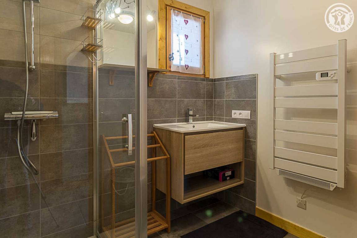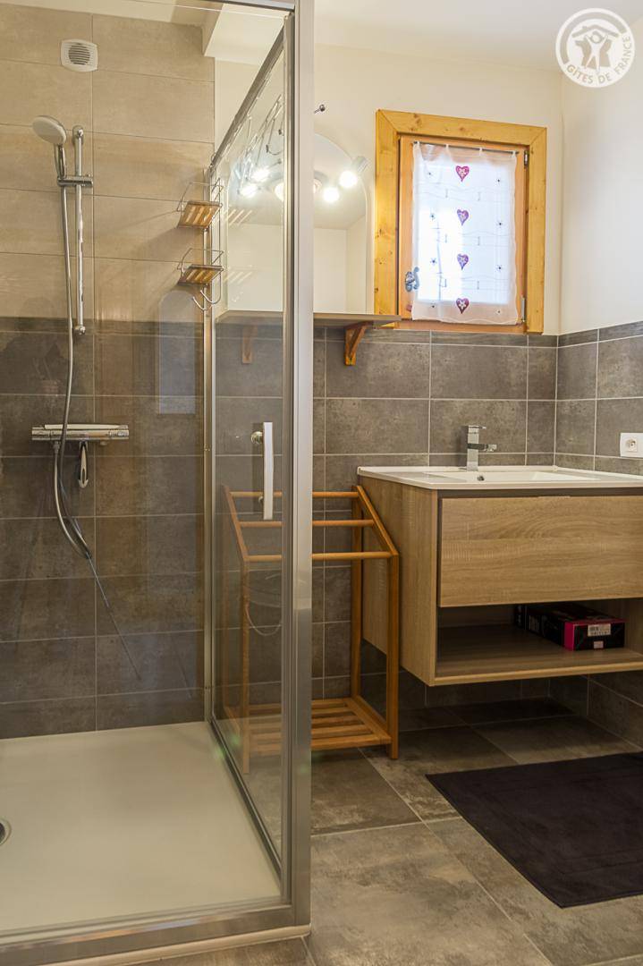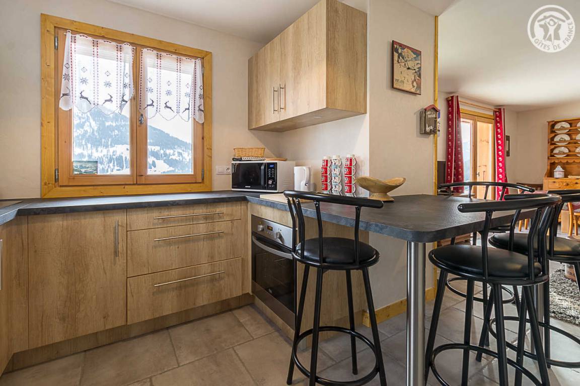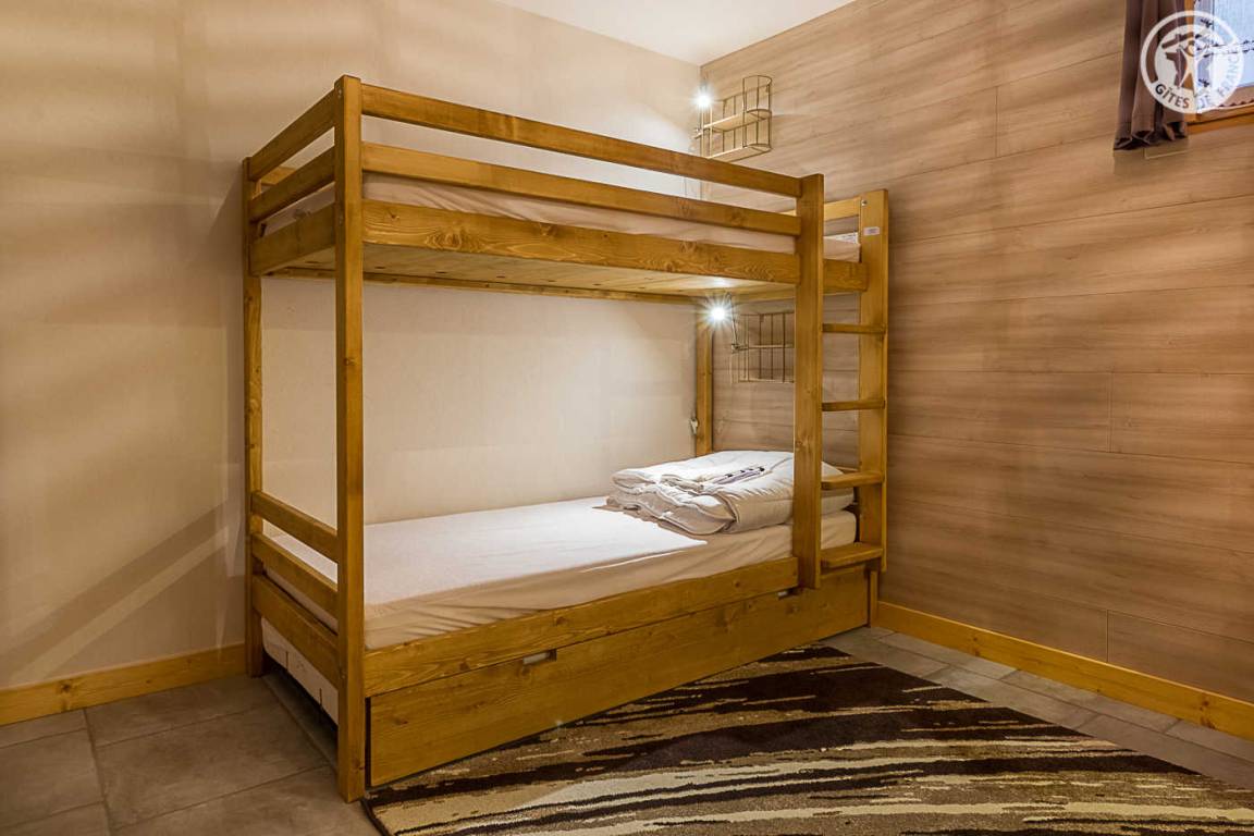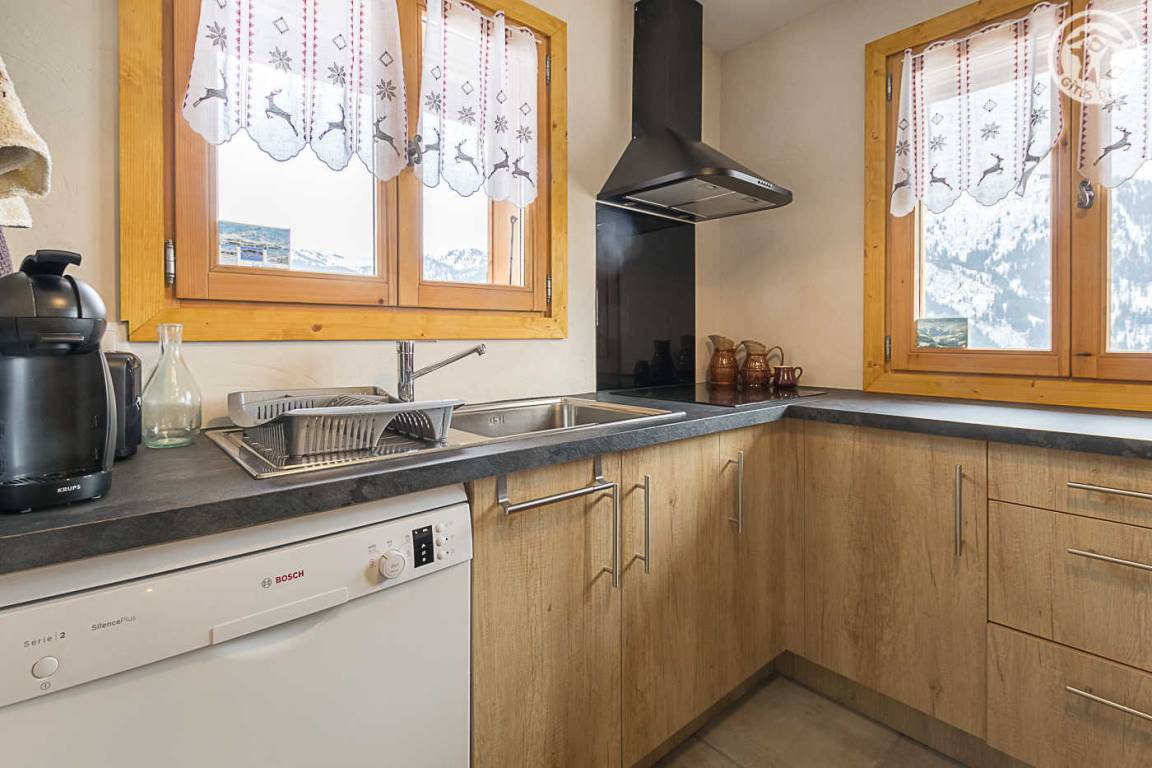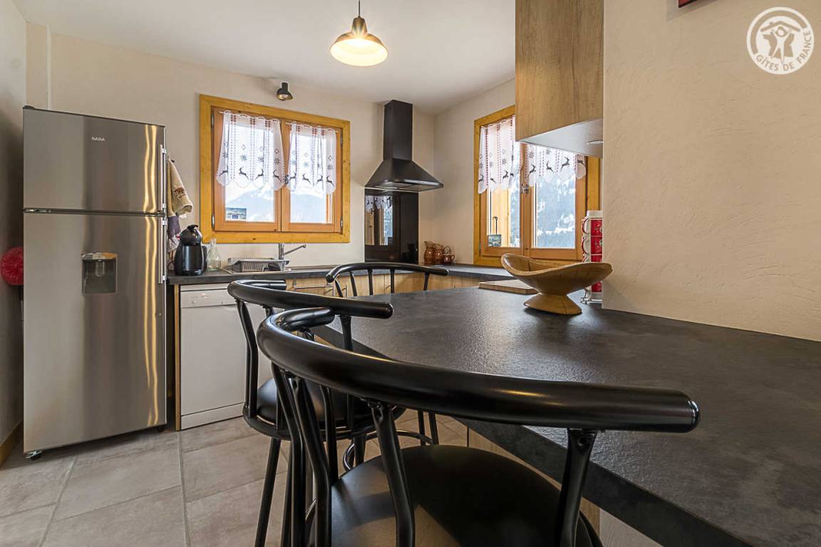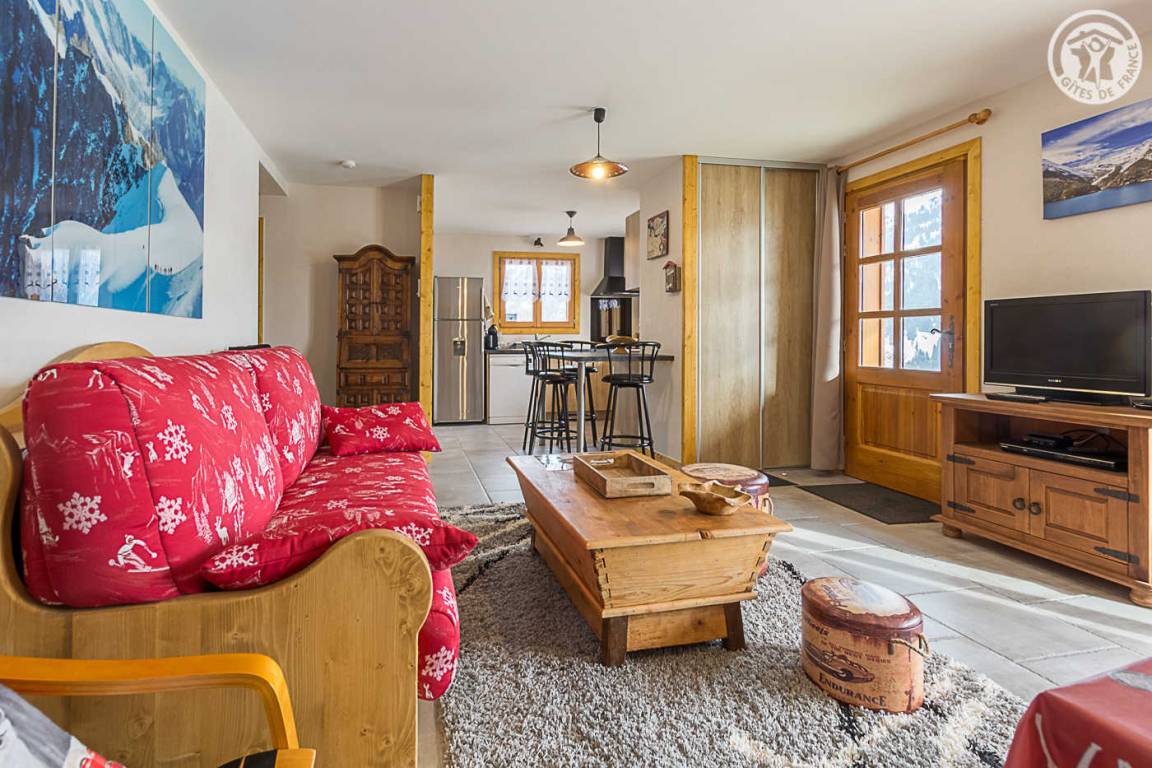 Gîte im Erdgeschoss eines Chalets. Bodengleiches Gehäuse. Wohnküche (Sofa umwandelbar in ein 160x200cm Bett) mit Holzofen (Holz inklusive). 2 Schlafzimmer (1 Schlafzimmer 1 Doppelbett 160x200cm / 1 Schlafzimmer 1 Doppelbett 140x190cm + 2 Etagenbetten + 1 Einzelausziehbett). 1 Badezimmer (Dusche mit Thermostathahn). Separates WC mit Waschbecken. Waschküche (Waschbecken + Waschmaschine kombiniert mit Trockner). Stauraum für Outdoor-Ausrüstung (Ski, Fahrräder, etc.). Bettwäsche inklusive + Betten bei Ankunft gemacht. Handtuchverleih. Bluetooth Lautsprecher. Private geschlossene Garage. Südterrasse.