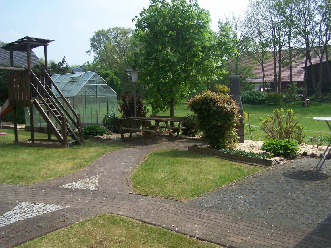 Der Garten: Groß und kinderfreundlich mit Schaukeln, Rutschen, Sandkasten, Wippen, Federenten und Klettergeräten, Spielhaus mit Kicker und Tischtennisplatte mit Zubehör und ein Basketballfeld mit Korb.