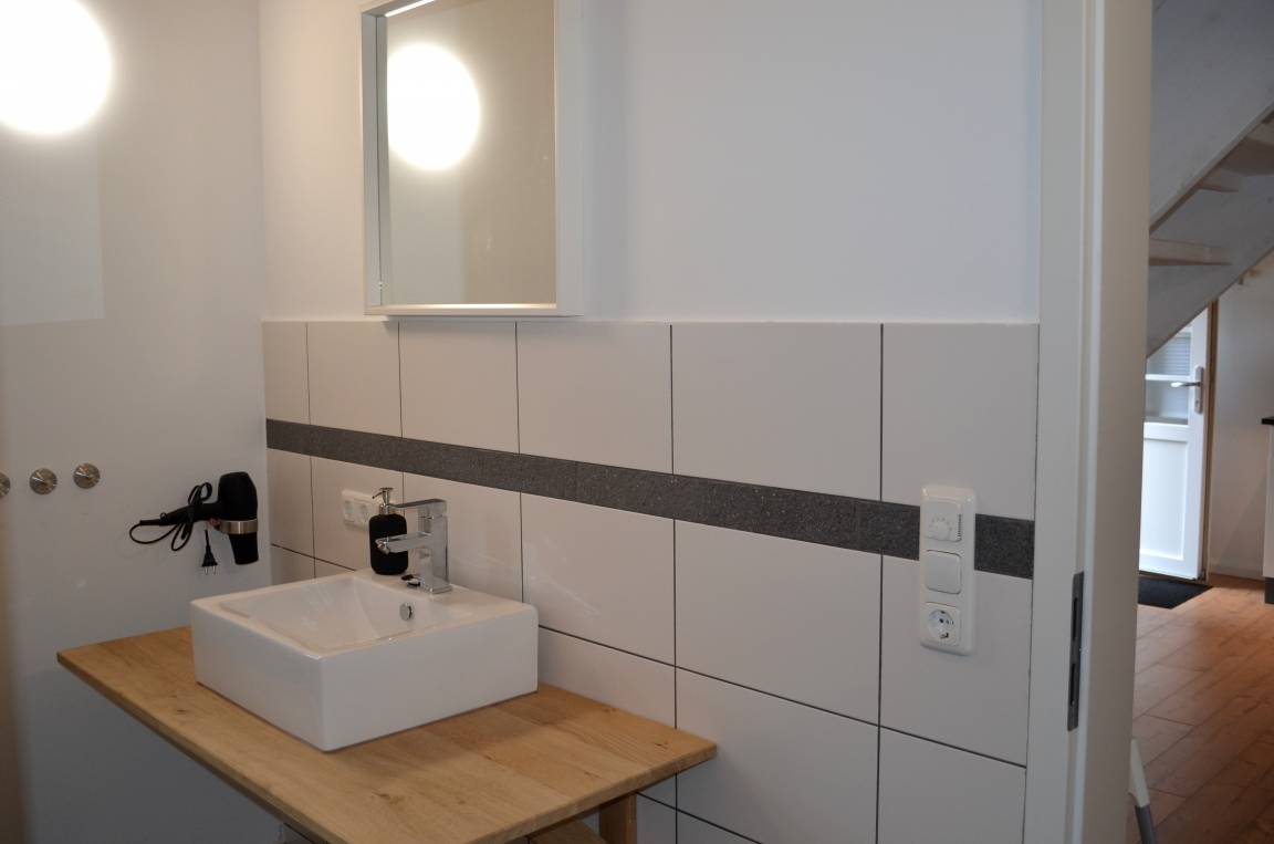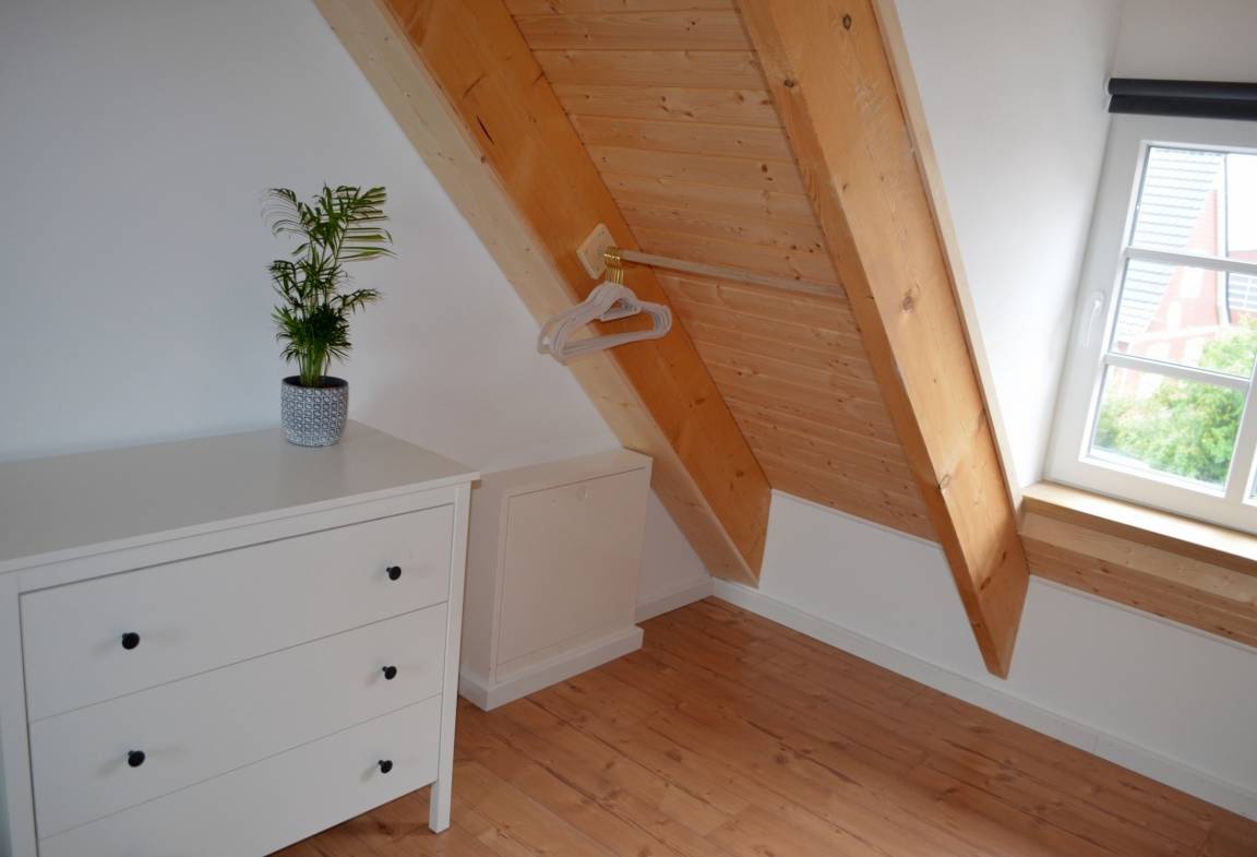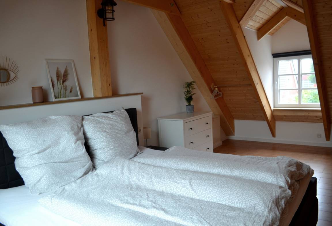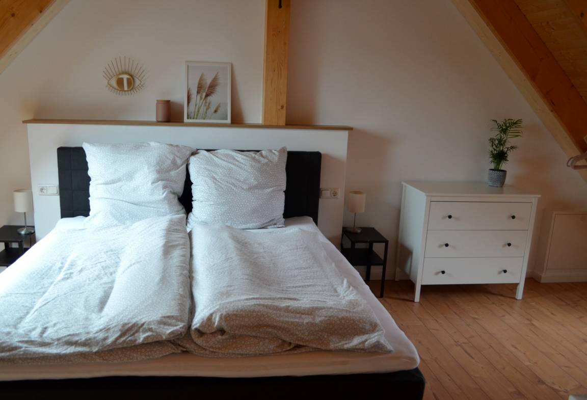Der gemütliche Wohn- und Essbereich in dieser Ferienwohnung ist bis zur Dachspitze hin nach oben offen; die sichtbare Balkenlage macht es unheimlich wohnlich. Zwei Schlafzimmer bieten bis zu vier Personen einen gemütlichen Schlafplatz. Im ca. 12m² großen Badezimmer wird unter der ebenerdigen Rainshower-Dusche relaxt und entspannt.