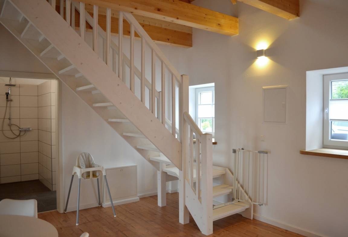 Die Ferienwohnung befindet sich im kernsanierten Stallgebäude und verfügt über eine angrenzende Terasse inkl. Grill und Feuerschale.