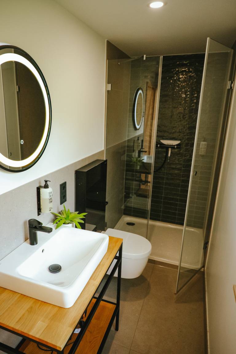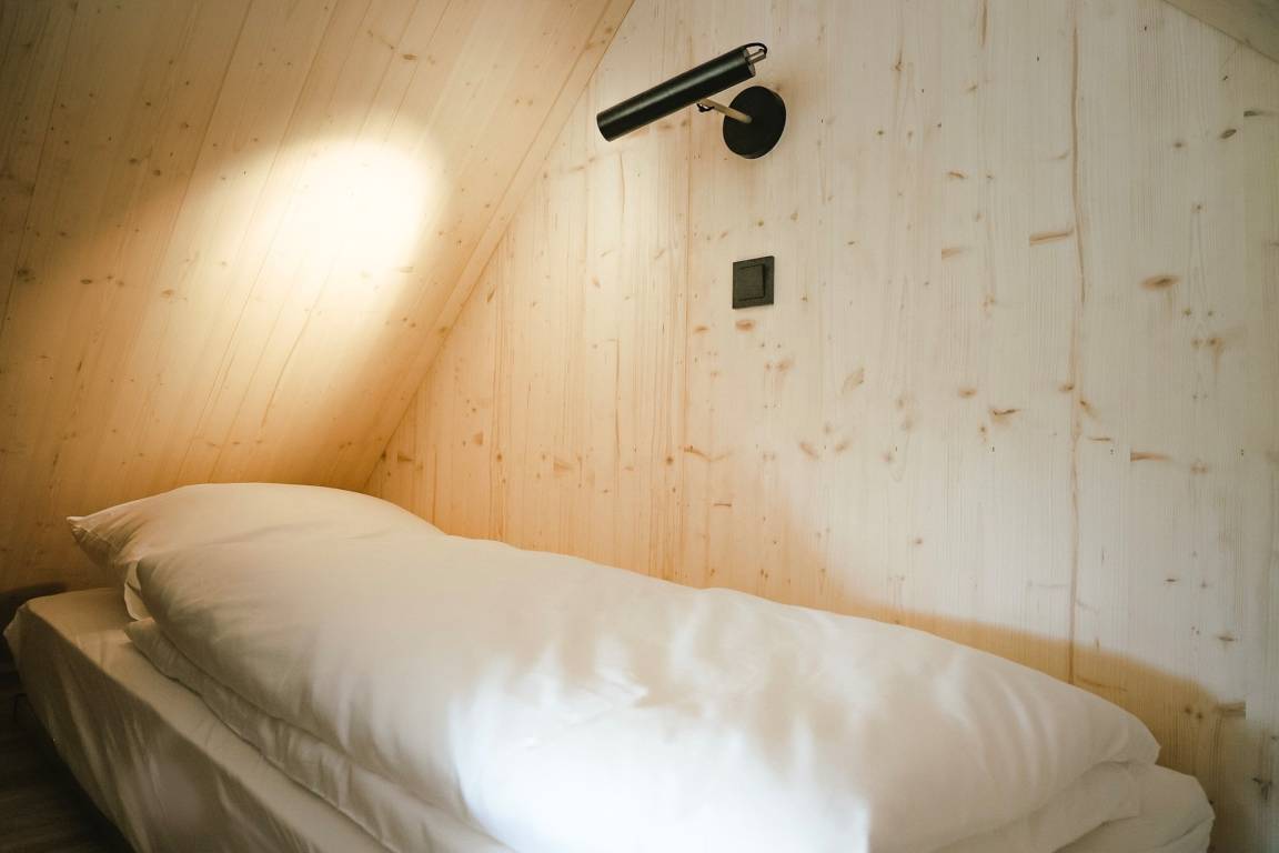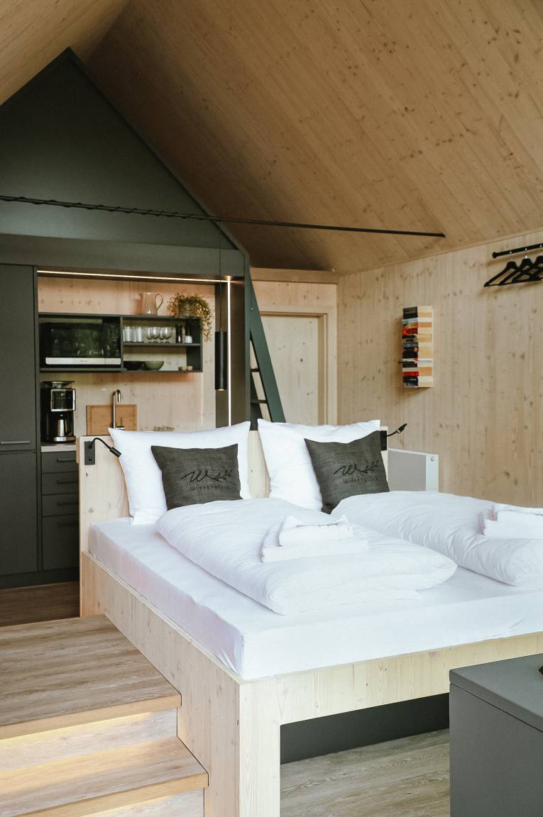 Genießen Sie, neben den wunderschönen Terrassen, die nachhaltig und bewusst reduzierte Einrichtung unserer TinyLodges. Zum Standard gehört ein großes Bett inkl. Bettwäsche, weitere Schlafmöglichkeit in der Empore, Bad mit WC, Dusche und Handtücher, Highspeed-Internet und eine Küche.