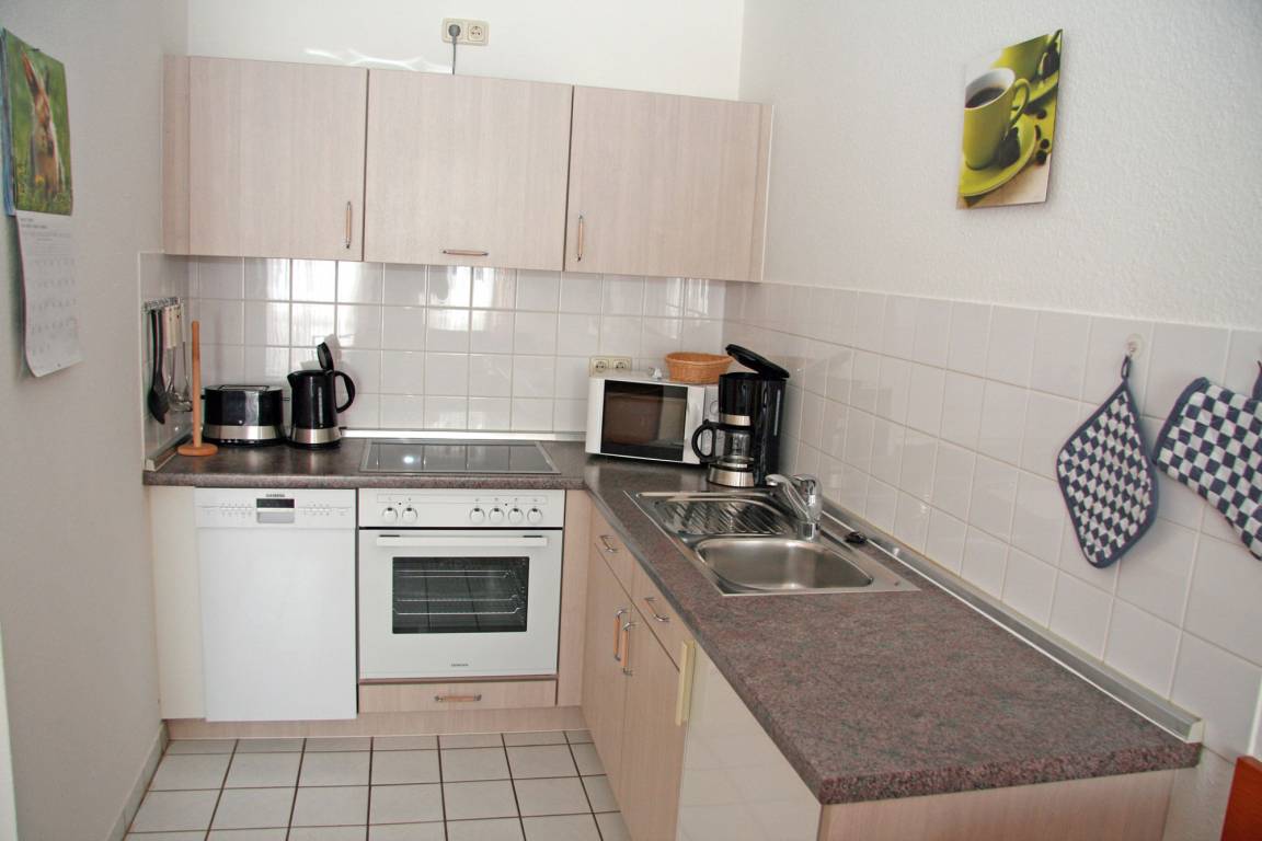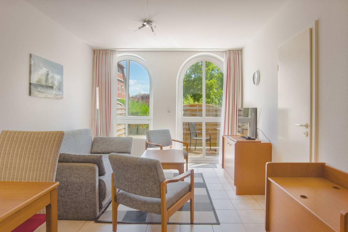 Das Apartment 3 im Erdgeschoss bietet auf etwa 40 Quadratmetern ausreichend Platz für bis zu vier Personen. Das Schlafzimmer ist mit zwei Einzelbetten und einem großen Kleiderschrank ausgestattet. Im Wohnbereich sorgt eine großzügige Schlafcouch für zwei weitere Personen für erholsame Nächte.