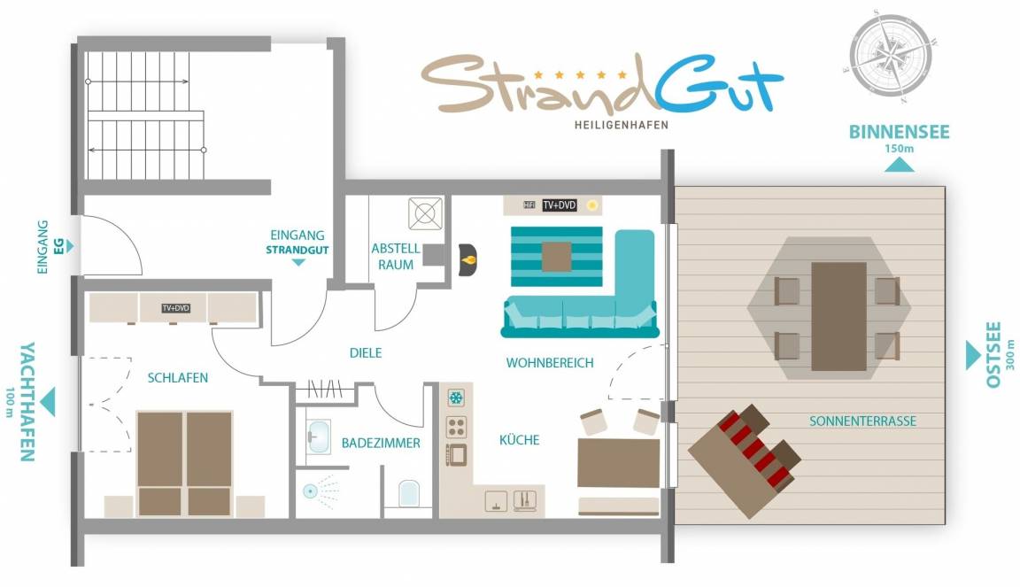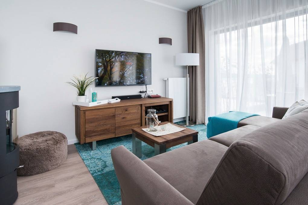 The modern and comfortable furnished 5-star holiday apartment is located in a prime location at the Marina Strand Resort, embedded between the Baltic Sea coast at the nature reserve "Graswerder", Marina and a lake. The apartment comes along with an about 30 m² large south-west facing terrace with a beautiful lake view providing a restful atmosphere for you to relax, sunbathe in a wicker beach chair and have barbecues.