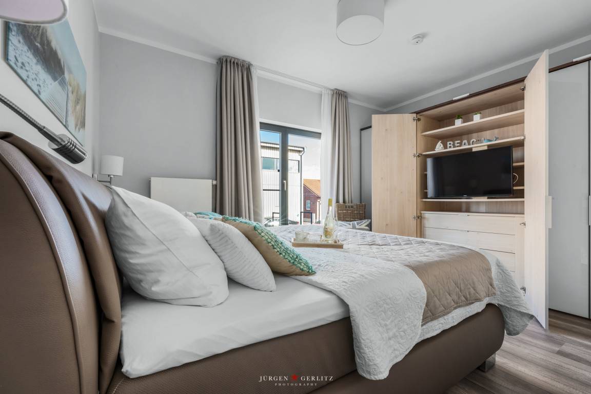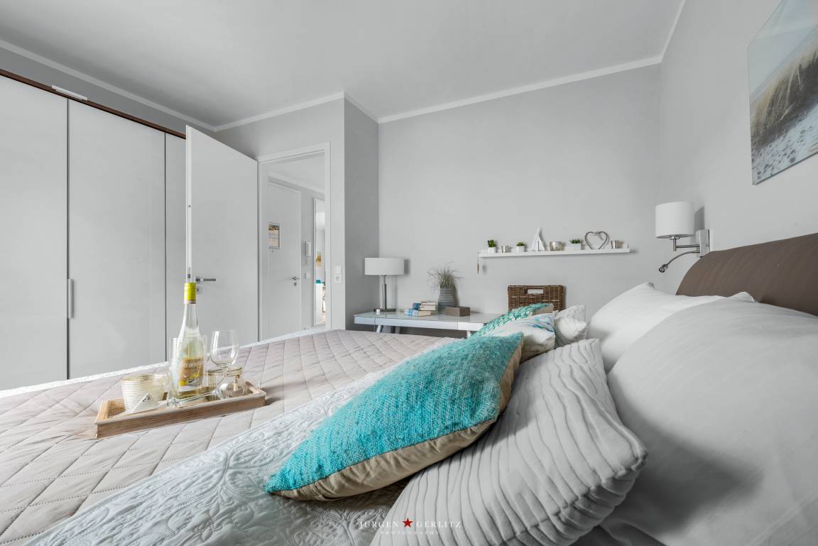 Das nach Osten gelegenen Schlafzimmer verfügt über ein Boxspring-Doppelbett für besten Schlafkomfort. In der Einbauschrankwand ist ein Fernseher integriert. Ein kleiner Schreibtisch rundet die hochwertige Ausstattung des Raumes ab. Für einen ungestörten Schlaf hängen Verdunklungsschals an den Fenstern.