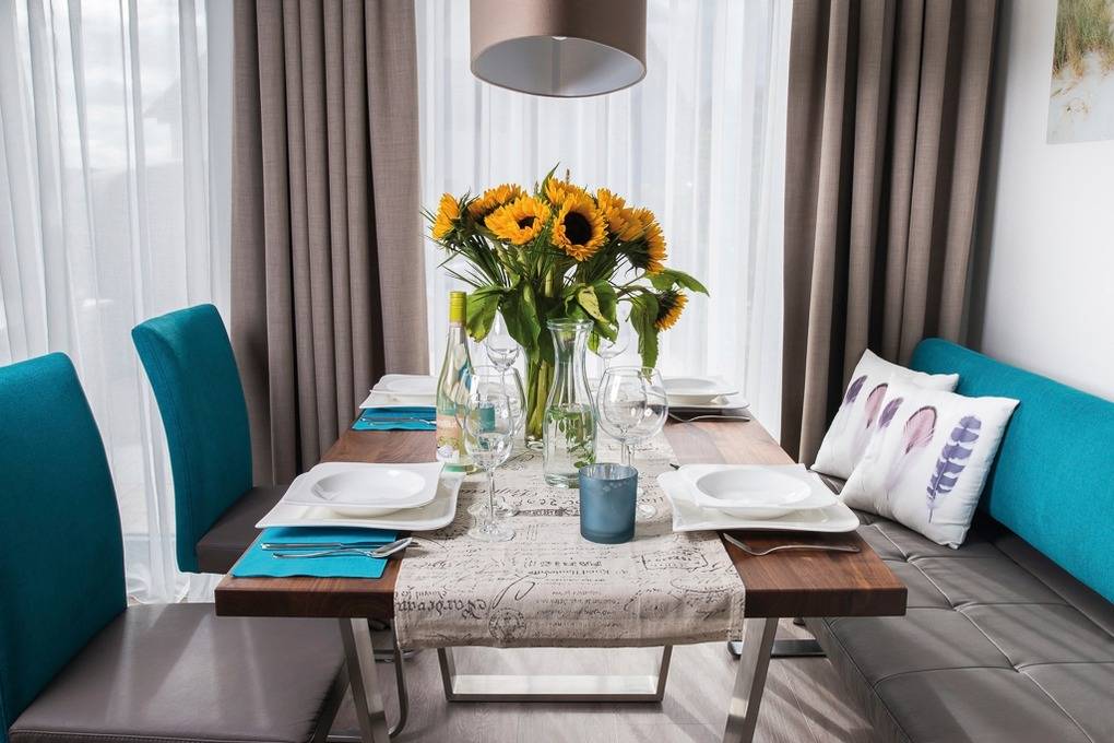 This beautiful and in detail tastefully furnished apartment has a well-equipped open-plan kitchen linked to the dining area with a solid wood table, bench and chairs.