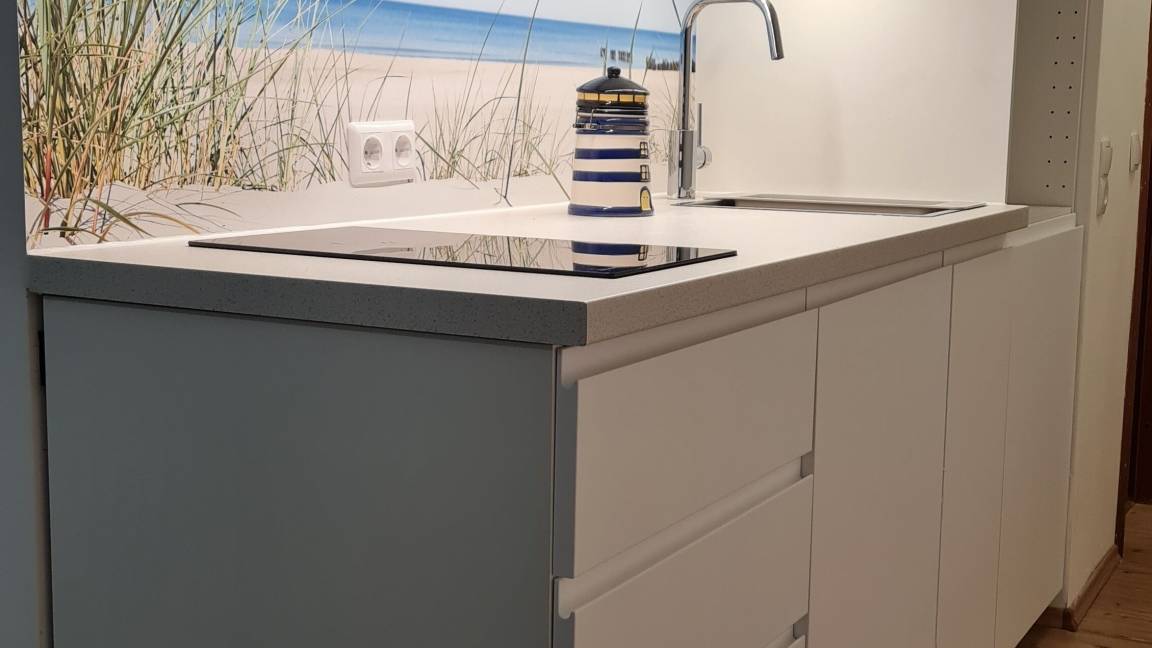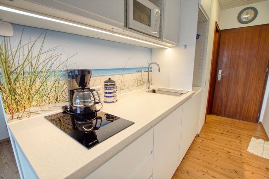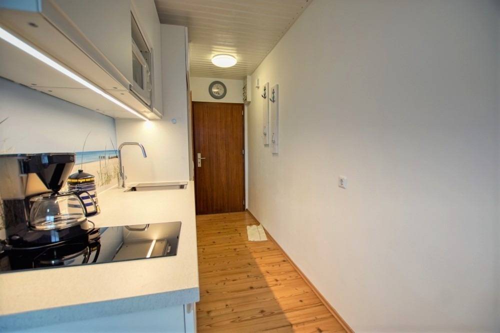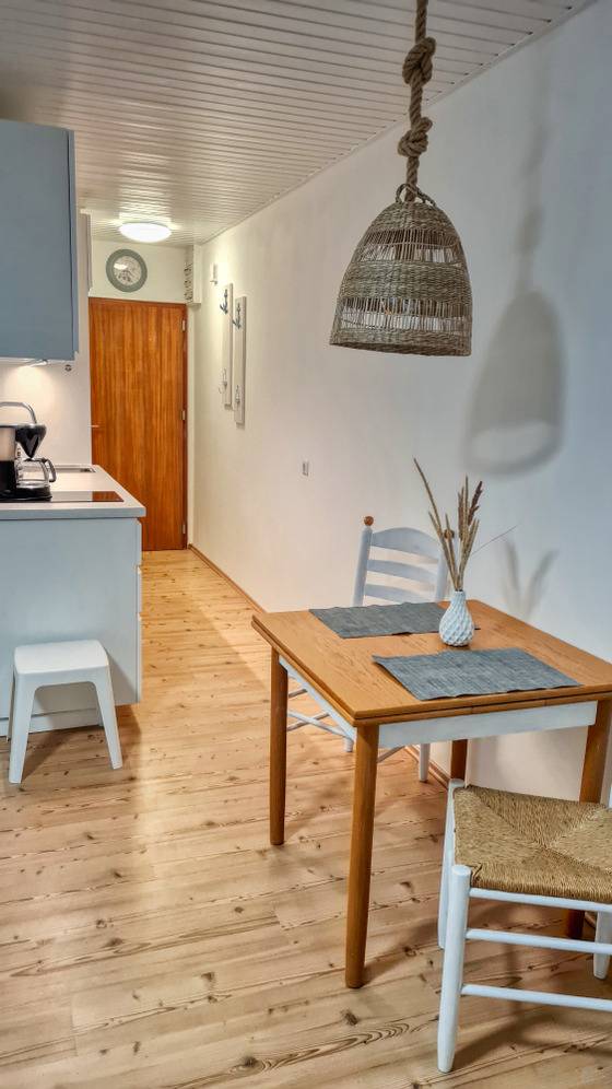 Die kleine, gut ausgestattete Küche verfügt über Mikrowelle, Kühlschrank, Wasserkocher und Toaster und eignet sich für einfache Mahlzeiten. Ein moderner Laminatboden sorgt für eine angenehme Wohnatmosphäre. Ihr Hund ist herzlich willkommen.