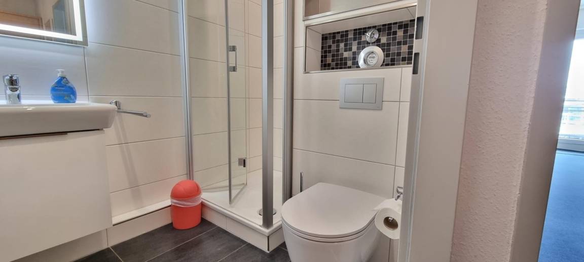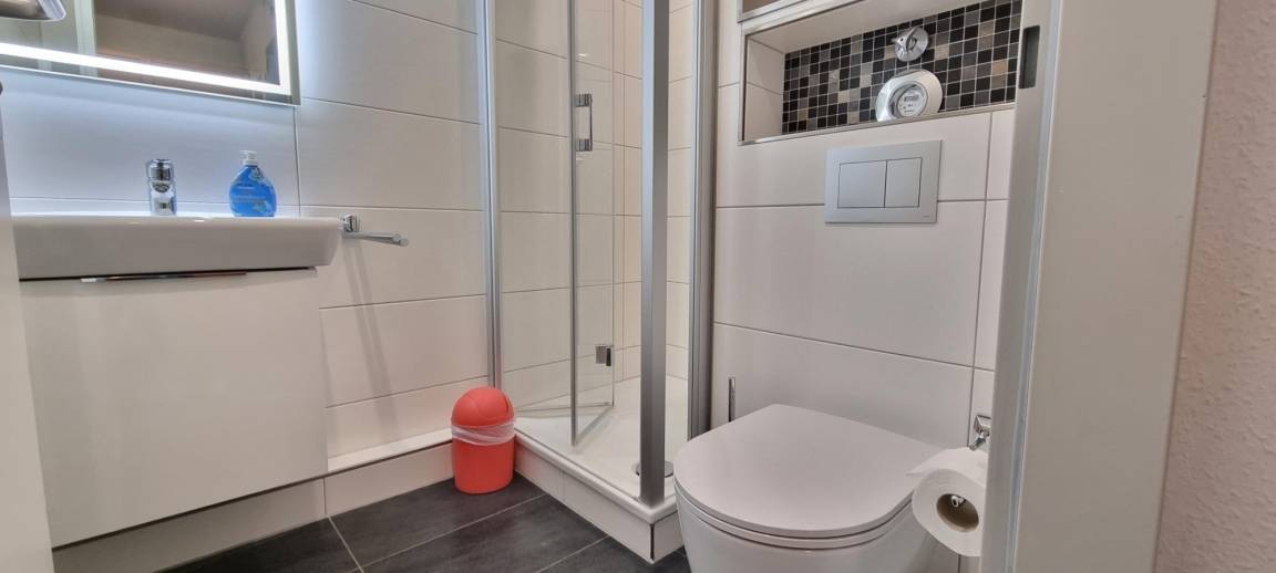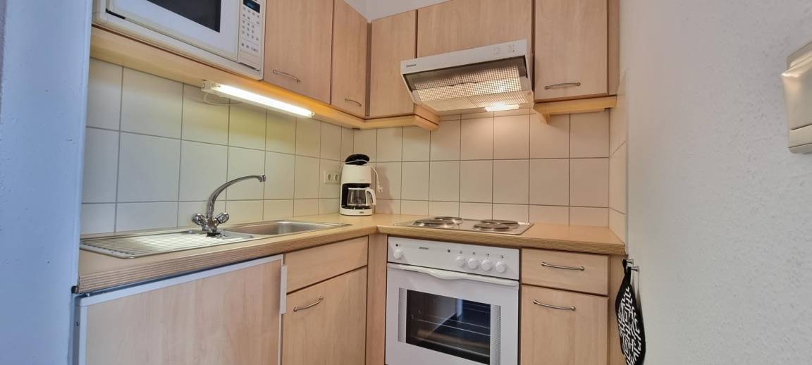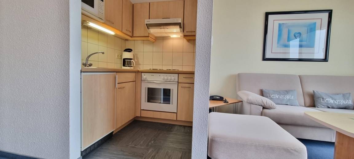 Die integrierte Küchenzeile ist platzsparend und funktional ausgestattet – ideal für eine unkomplizierte Selbstverpflegung im Urlaub. Das innenliegende Duschbad befindet sich im Vorflur und rundet die Ausstattung ab.