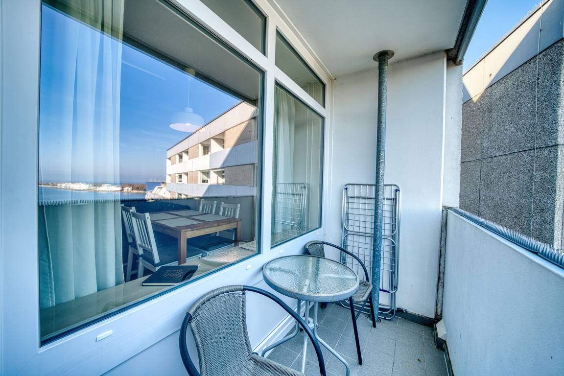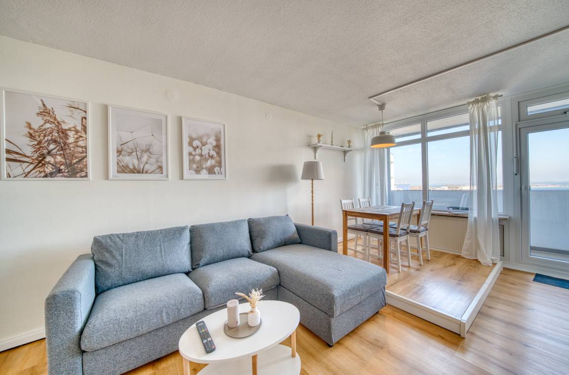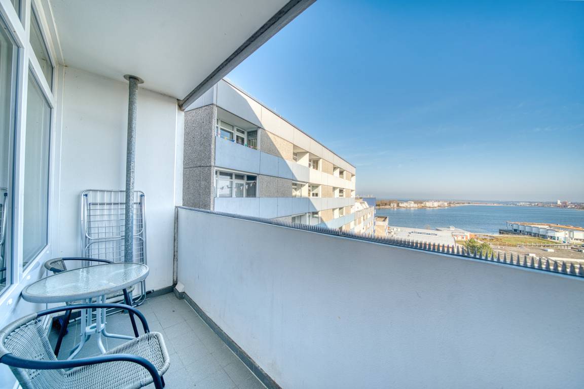 Die Ferienwohnung im Haus E, 11. Etage, mit Balkon, bietet viel Platz und einen traumhaften Blick auf die Ostsee sowie den großen Binnensee. Genießen Sie Ihr Frühstück mit Sonnenaufgängen oder den Abend durch ein buntes Farbenspiel rund um den Binnensee.