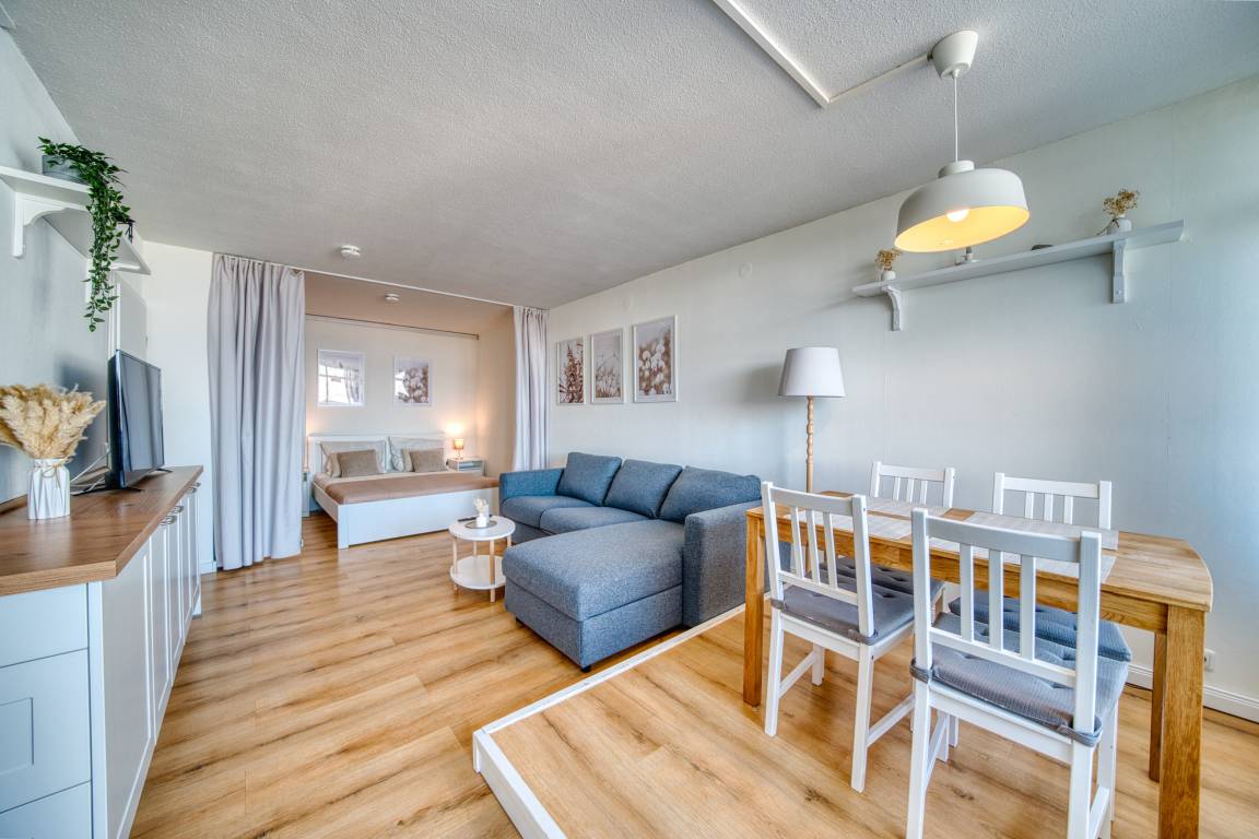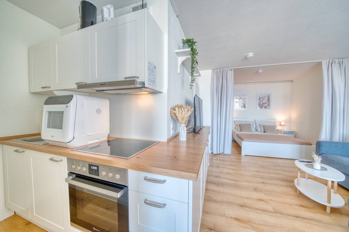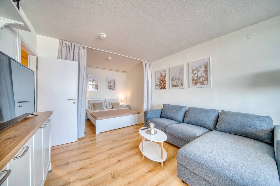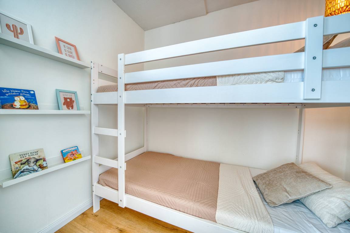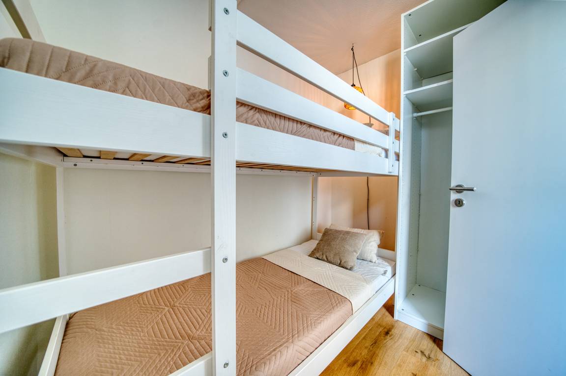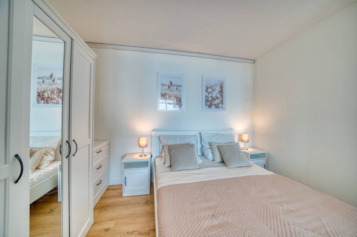Wohnfläche 45 qm. Offener Wohnbereich mit Couch, Flachbild-Smart-TV und Essplatz für 4. Elternschlafbereich mit Doppelbett, Kinderzimmer mit Etagenbett. Moderne Küche mit Ceranfeld, Backofen, Mikrowelle, Kühlschrank mit Gefrierfach, Kaffeemaschine, Toaster, Wasserkocher. Bad mit Dusche. Hochstuhl vorhanden. Bonus: WLAN und Kinderspielweltkarte. Nichtraucher, keine Haustiere, max. 4 Personen, Fahrstuhl, Fahrradräume, Strand ca. 300 m, kostenfreier Parkplatz. Ferienpark mit Schwimmbad, Sauna, Wellness, Läden und Kinderspielwelt.