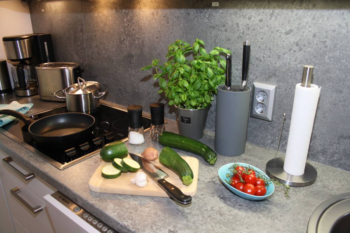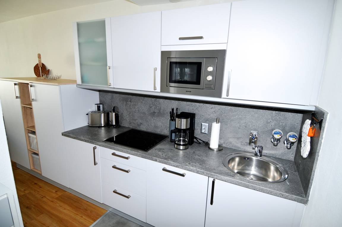 Die Küche ist funktional ausgestattet und ermöglicht eine unkomplizierte Selbstversorgung während Ihres Aufenthaltes. Neben einer Mikrowelle und einer Kaffeemaschine finden Sie hier alles, was Sie für kleine Mahlzeiten oder ein gemütliches Frühstück benötigen.