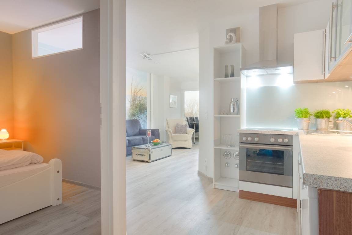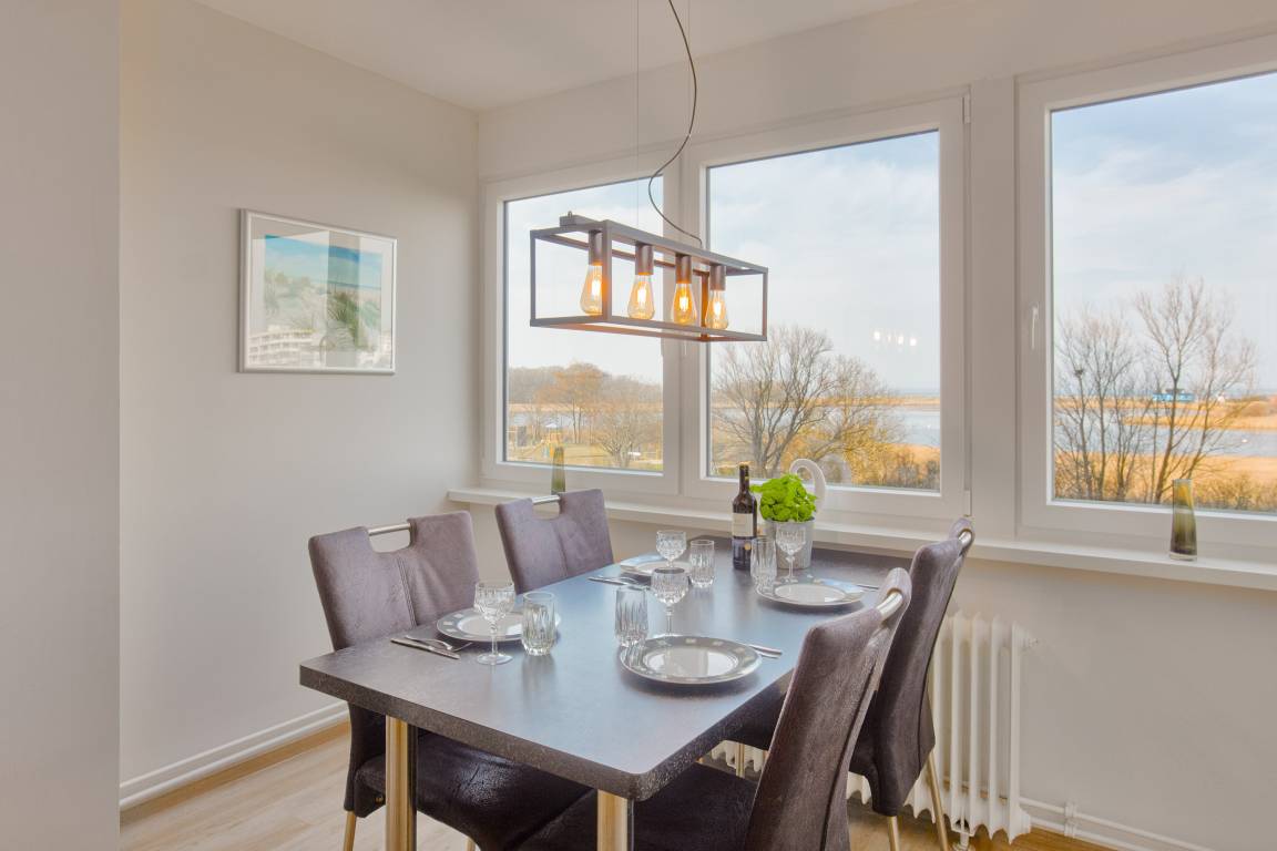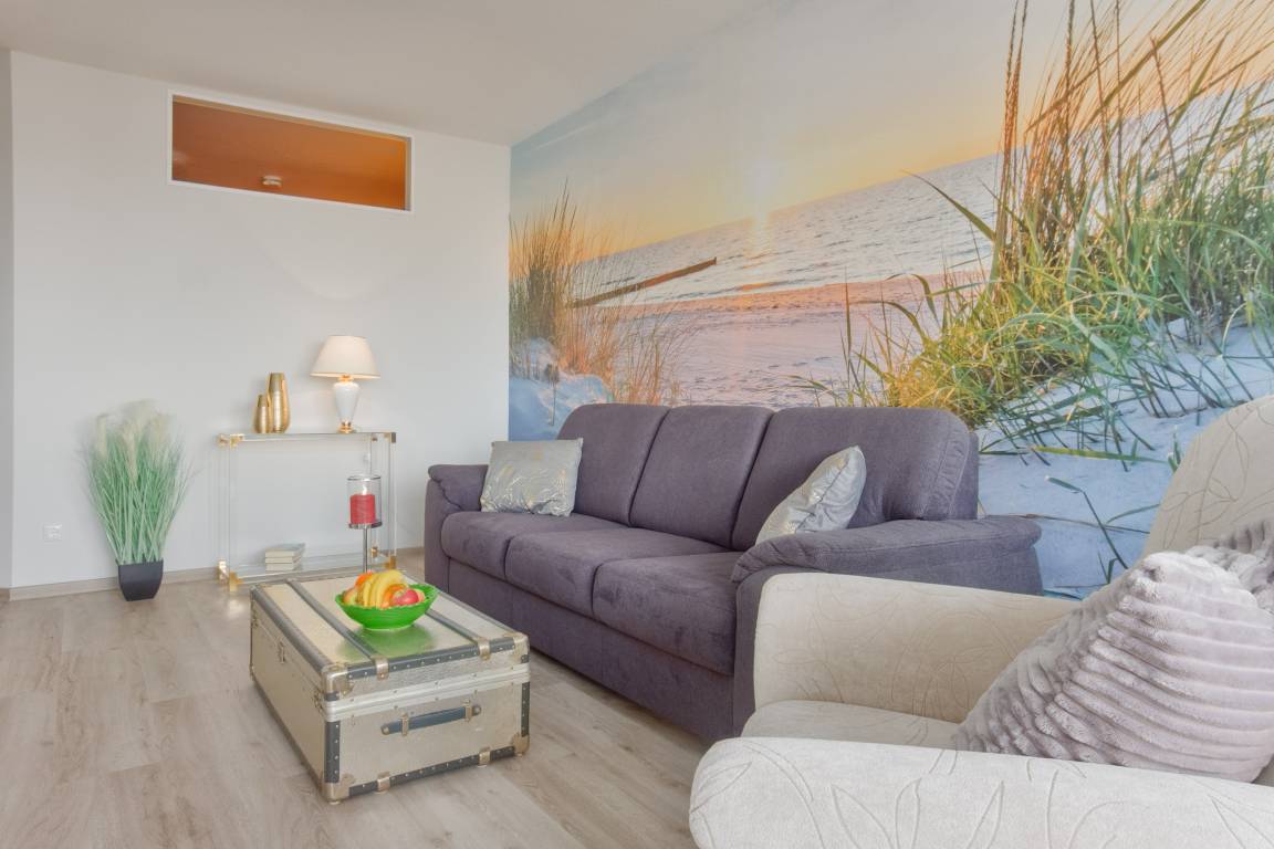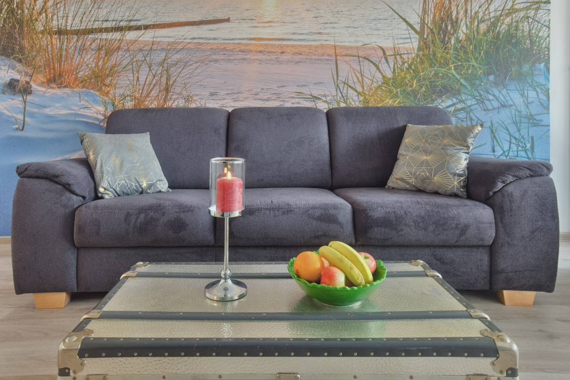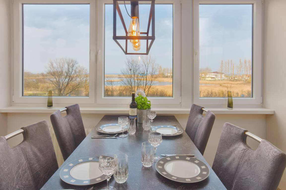 Herzstück ist der einladende Wohn- und Essbereich. Hier kann auf der gemütlichen Couch entspannt werden oder Sie genießen gesellige Stunden am Esstisch. Naturtöne und mit viel Geschick ausgewählte Dekorationen sorgen für ein wunderbar wohnliches Gefühl. Smart-TV zum Streamen und WLAN sind selbstverständlich. Die großen Fenster bringen hierbei viel Licht in die Unterkunft und zudem haben Sie jederzeit einen tollen Blick auf die Ostsee.