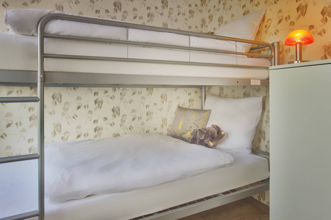 Ebenso komfortabel geht es in den zwei Schlafzimmern der Wohnung weiter. Einmal mit einem bequemen Doppelbett (180x200) und großem Kleiderschrank und im anderen Schlafzimmer ein Etagenbett, welches auch für Erwachsene geeignet ist. Für Verdunklung sorgen Plissees bzw. Rollo.