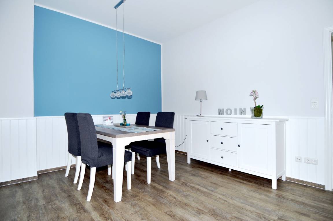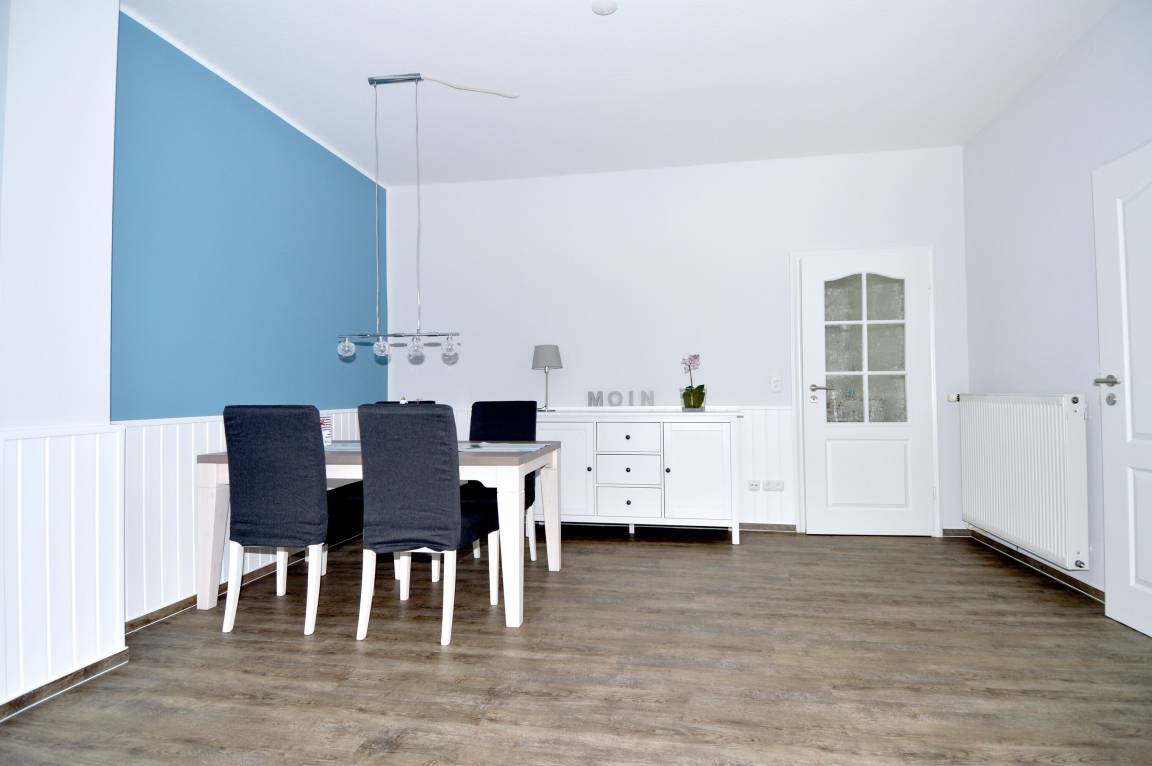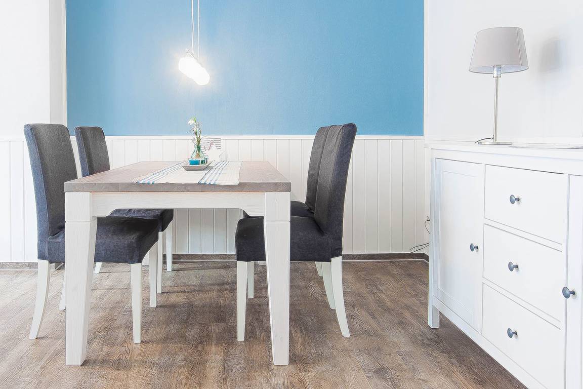 Herzstück des Hauses ist der großzügige Wohn- und Essbereich, der viel Raum für gemeinsame Stunden bietet. Ob entspanntes Verweilen auf dem Sofa oder geselliges Beisammensein am Esstisch – hier lässt sich der Urlaub in vollen Zügen genießen. Große Fenster sorgen für viel Tageslicht und schaffen eine freundliche, einladende Atmosphäre. TV sowie WLAN stehen zur Verfügung, sodass Sie auch im Urlaub bestens unterhalten und vernetzt sind.