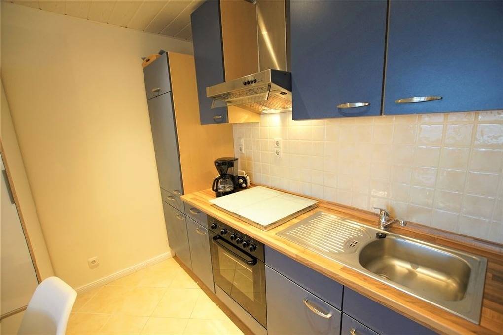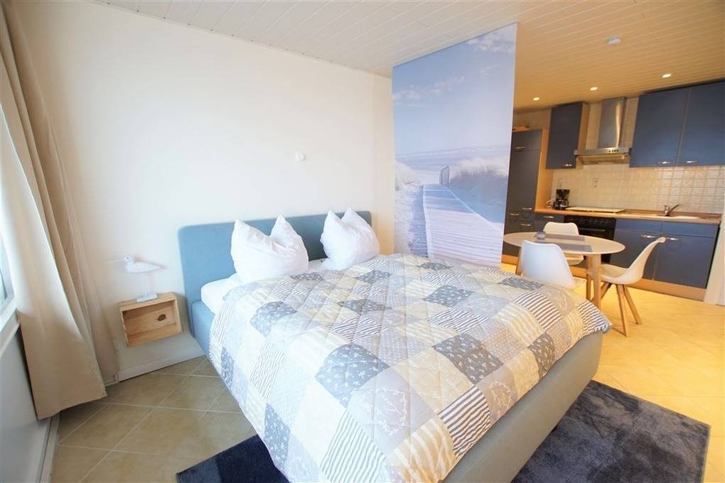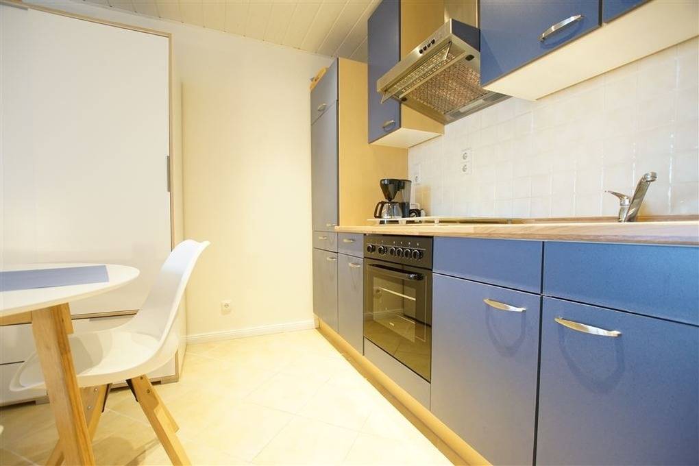 Der Wohn-/Schlafraum ist mit Doppelbett ausgestattet. Die Pantryküche verfügt über Ceranfeld, Backofen, Kühlschrank und Mikrowelle. Modernes Bad mit Dusche und WC, TV für gemütliche Abende. Fahrstuhl, gemeinschaftlicher Fahrradkeller und eigener Pkw-Stellplatz vorhanden.