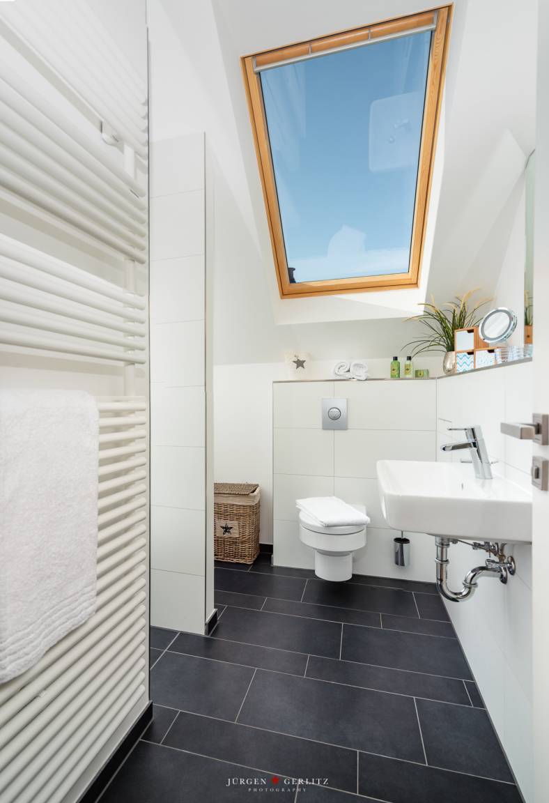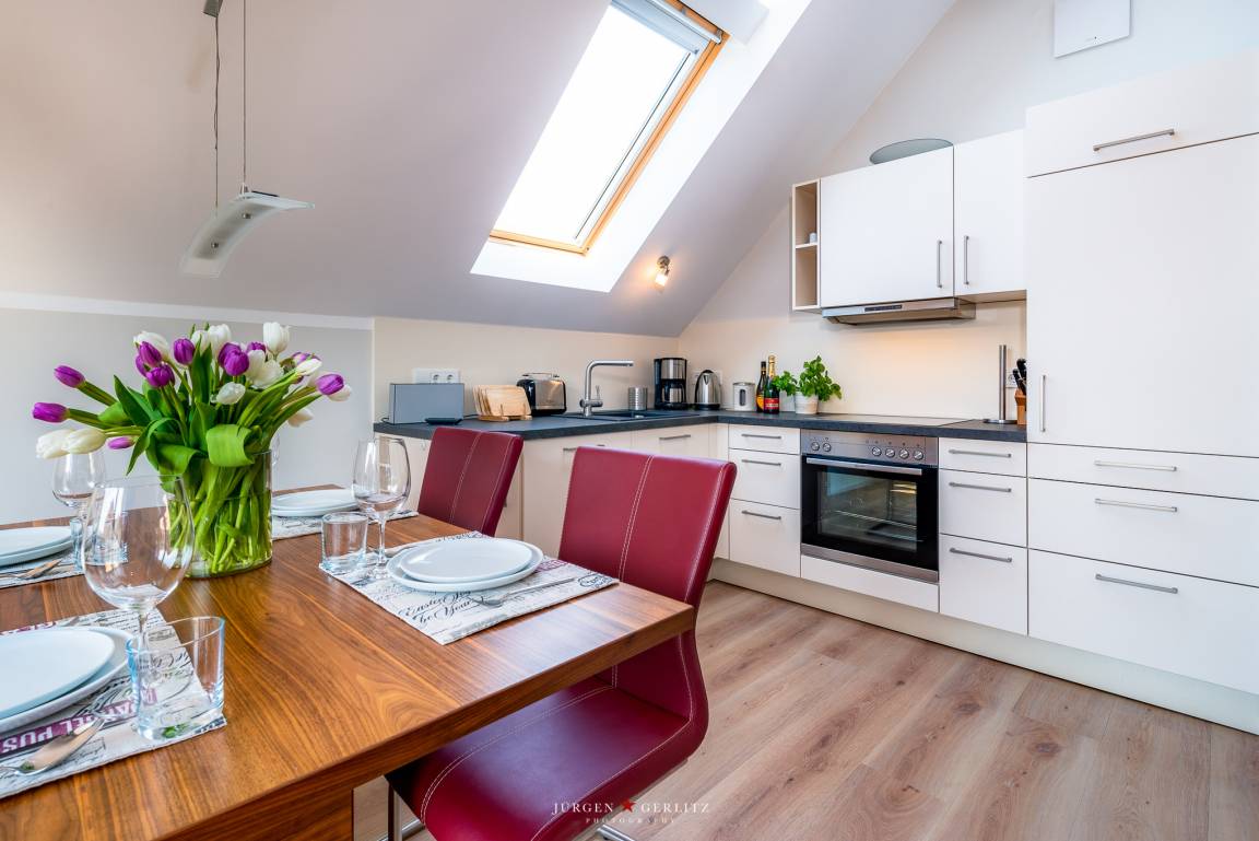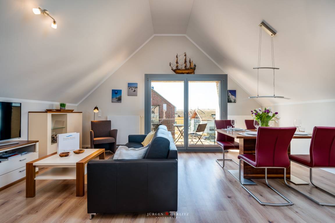 Im Wohnbereich gibt es außerdem ein modernes Sofa, welches sich in ein Schlafsofa für weitere 2 Personen verwandeln läßt, einen Kaminofen und einen Fernseher mit DVD-Player. Von einem 2. Balkon blicken Sie hier auf die Strandpromenade in Richtung Seebrücke und können bei schönem Wetter wunderschöne Sonnenuntergänge genießen.