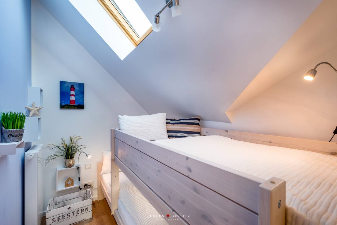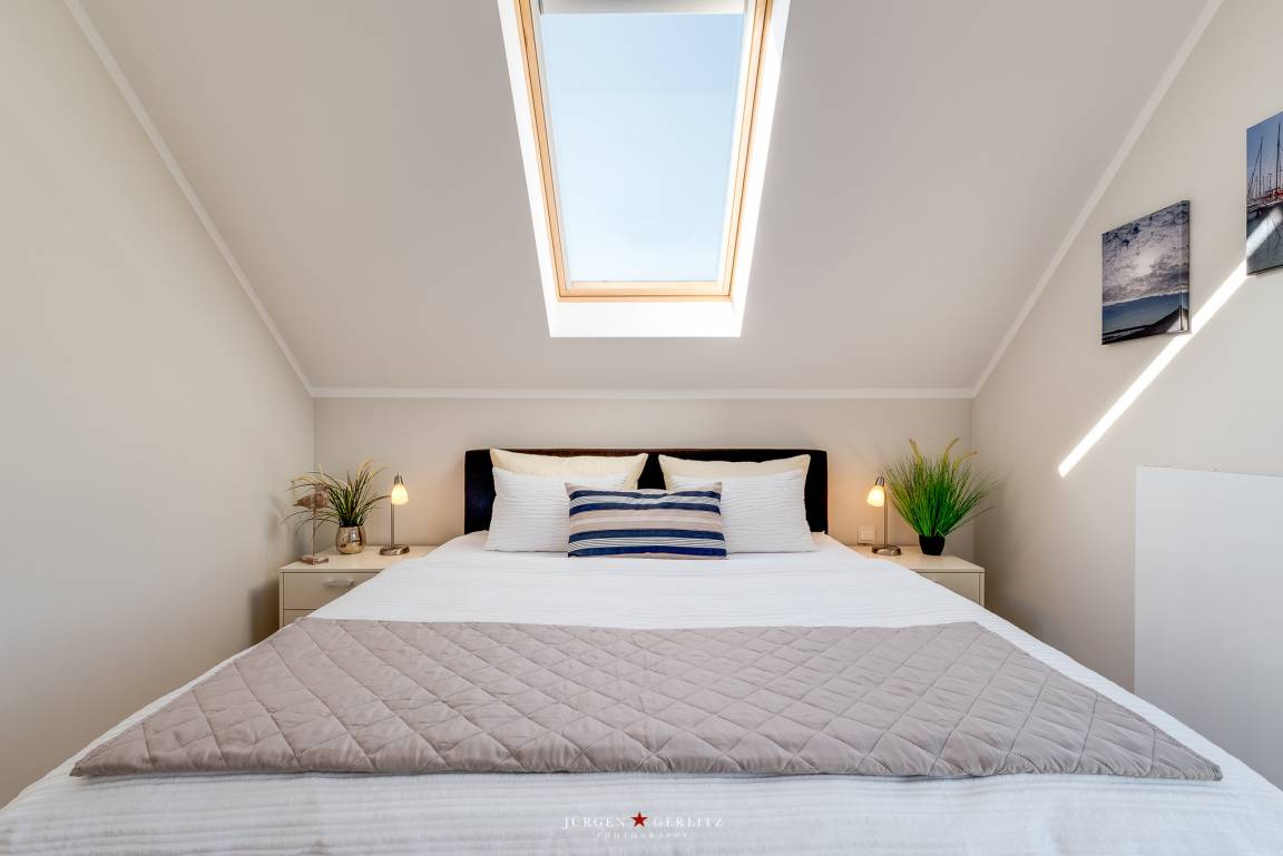 Das Schlafzimmer ist mit einem modernen Boxspringbett ausgestattet. Es verfügt über einen Balkon. Von hier blicken Sie in Richtung Graswarder und Yachthafen. Nebenan finden Sie ein zweites Schlafzimmer mit einem Etagenbett, besonders geeignet für Kinder.
