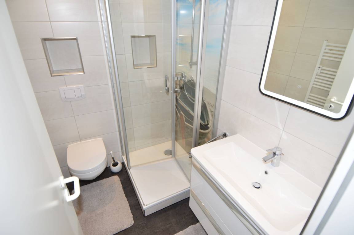 Das Badezimmer ist mit Dusche, Waschbecken und WC ausgestattet und ergänzt den komfortablen Gesamteindruck der Wohnung. Pflegeleichte Böden sowie eine durchdachte Raumaufteilung sorgen für ein angenehmes Wohngefühl.