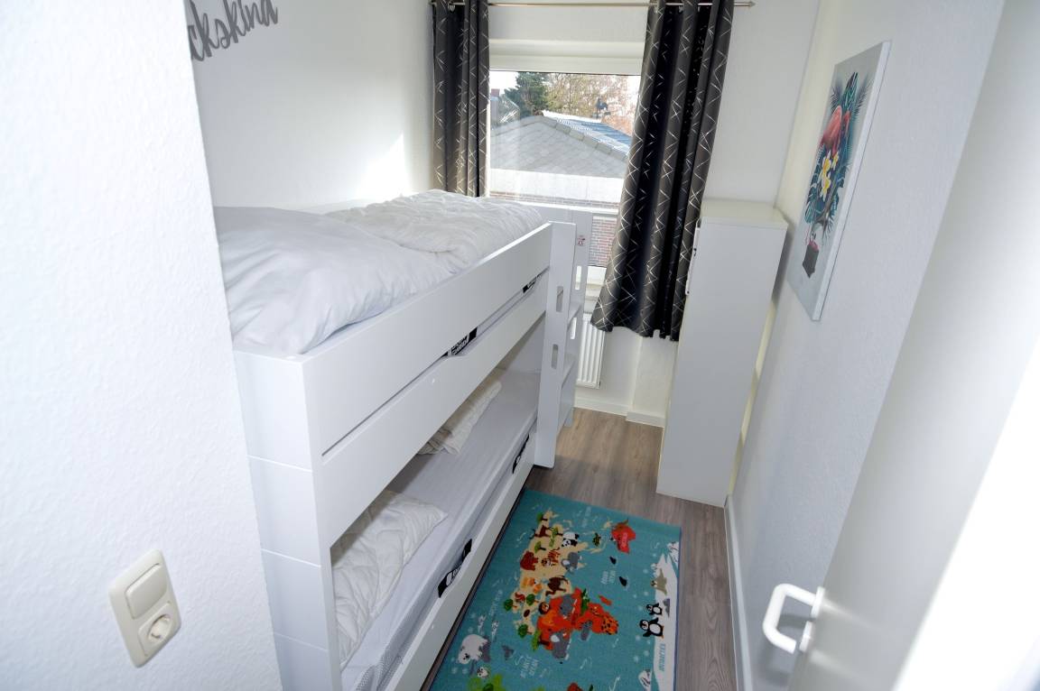 Das Elternschlafzimmer ist mit einem großen Doppelbett (1,80 x 2,00 m) ausgestattet und bietet angenehmen Schlafkomfort. Im zweiten Schlafzimmer steht ein Etagenbett, das sich besonders für Kinder eignet (belastbar bis 60 kg). Verdunklungsmöglichkeiten mit Plissees und Vorhängen sorgen in beiden Schlafräumen für erholsame Nächte.