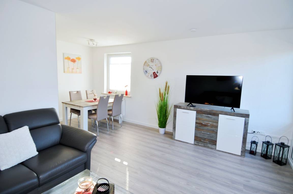 Der Wohnbereich ist gemütlich eingerichtet und verfügt über ein Sofa sowie einen Esstisch für gemeinsame Mahlzeiten. Zur Unterhaltung stehen ein TV, eine Musik[-]anlage mit CD-Player sowie WLAN zur Verfügung. Die angrenzende Küche ist funktional und gut ausgestattet mit Cerankochfeld, Backofen, Kühlschrank mit Gefrierfach, Mikrowelle, Kaffeemaschine, Toaster und Wasserkocher und bietet alles, was für die Selbstversorgung benötigt wird.