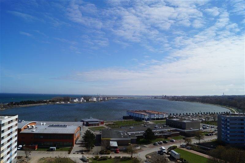 Die Ferienwohnung im Haus E, 12. Etage, mit Balkon zur Ostseite, bietet einen herrlichen Blick auf die Ostsee mit Fehmarnsundbrücke sowie den Binnensee mit Stadt und Yachthafen.