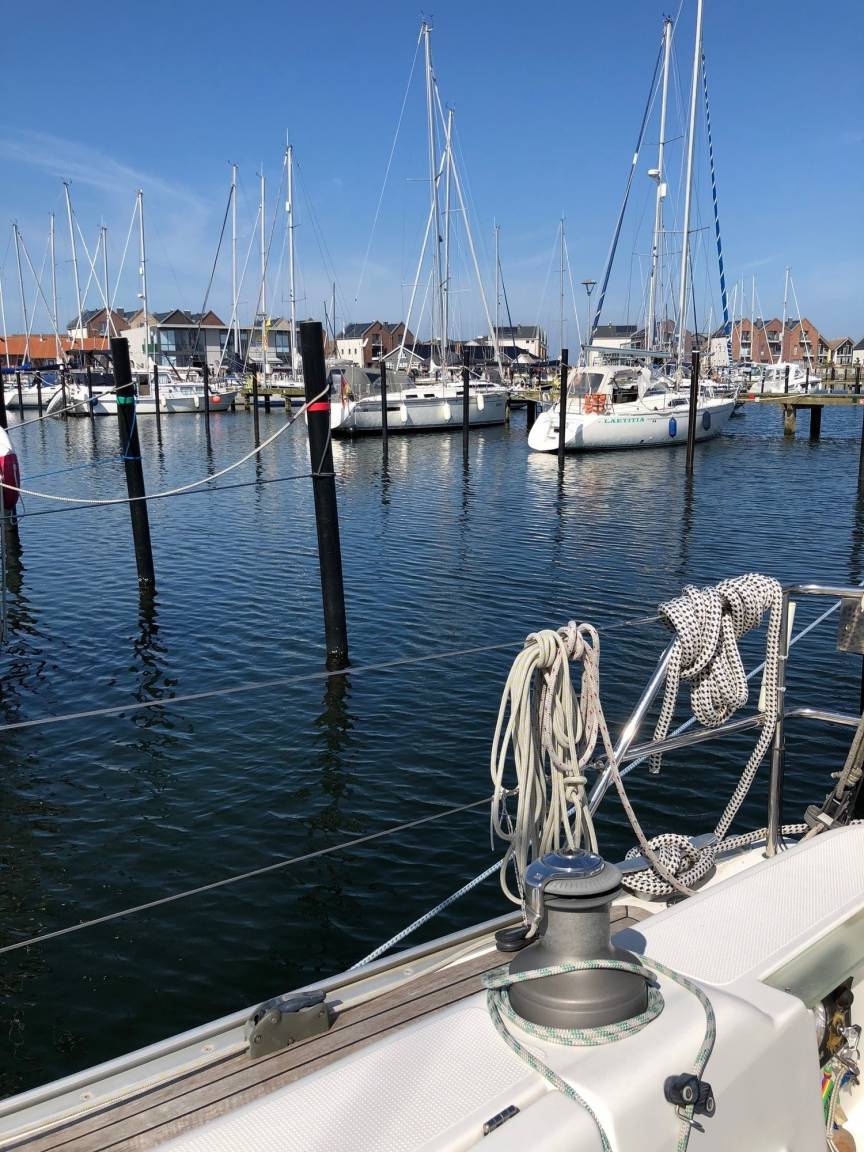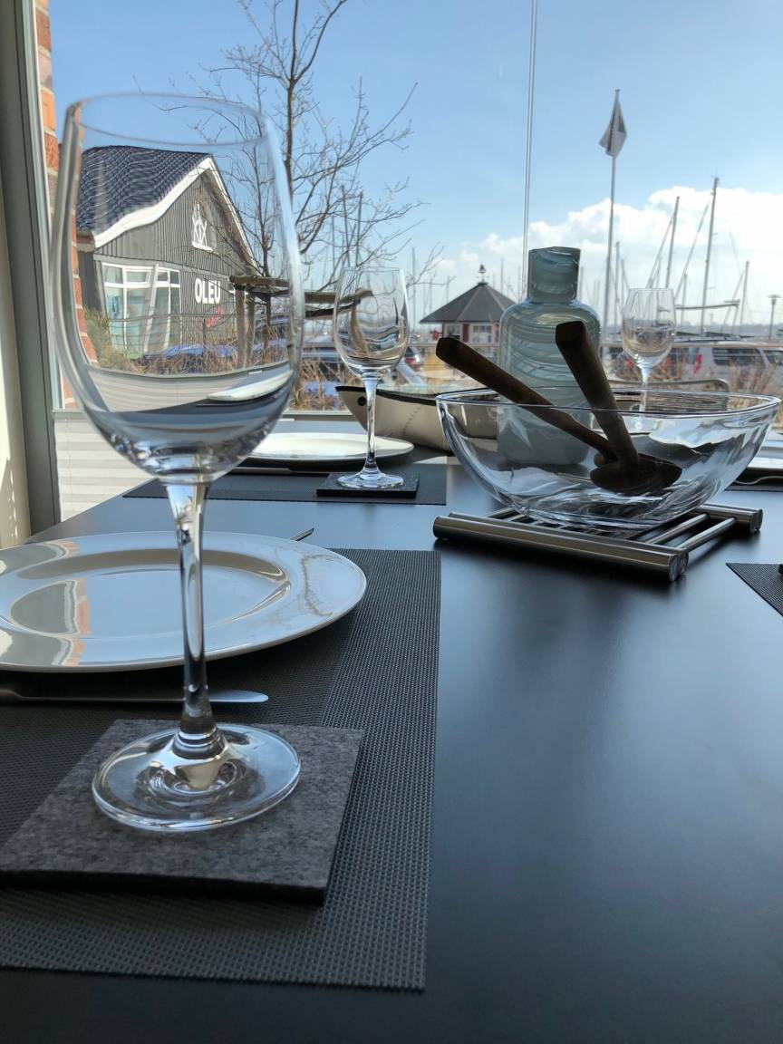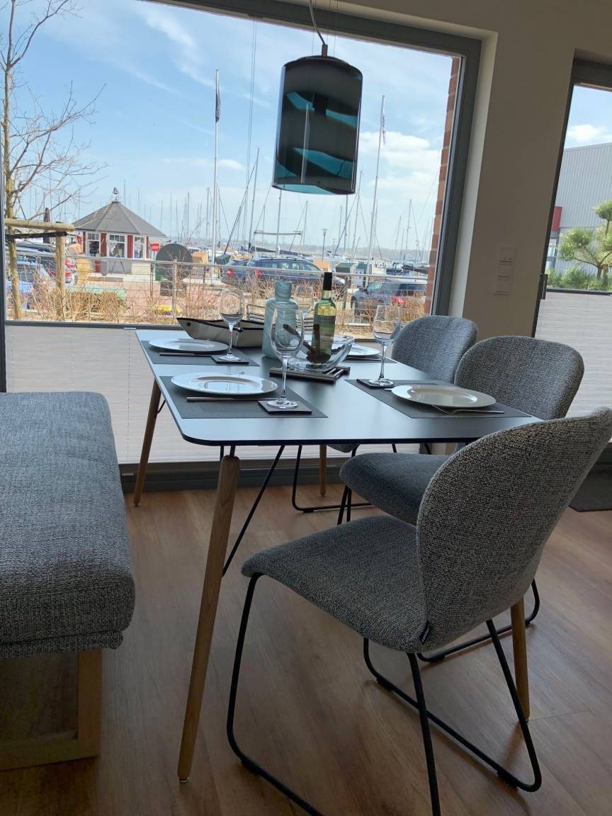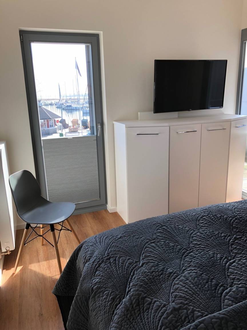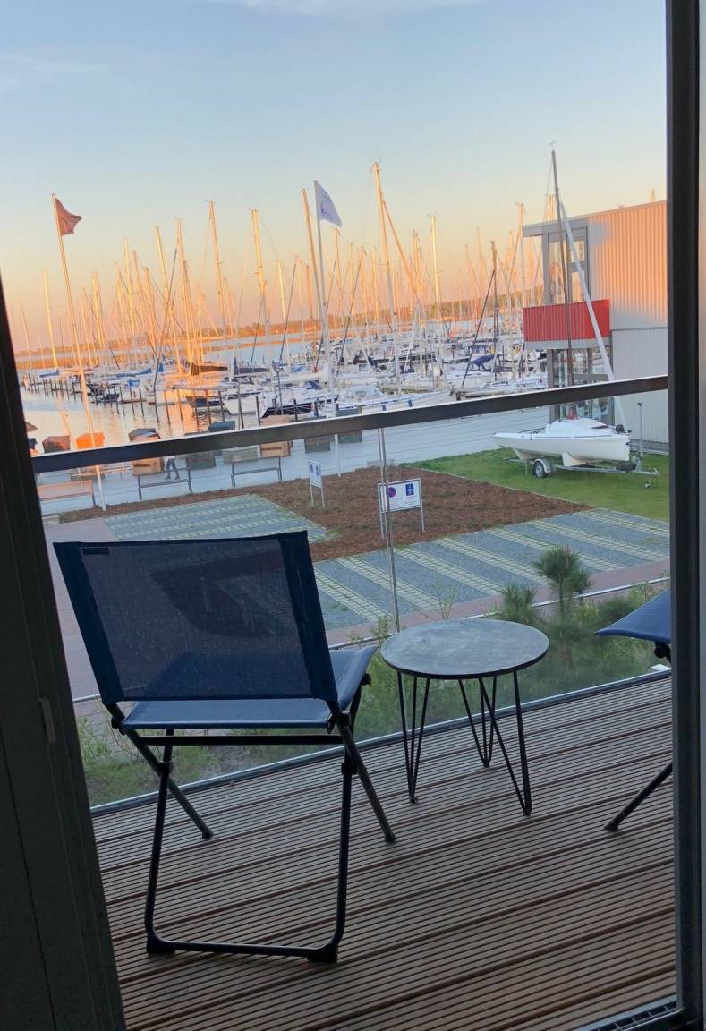 Ausblick: Der Blick von der Terrasse geht auf den Yachthafen. Im Obergeschoss geht der Blick aus zwei Schlafräumen oder dem geschützten Innenbalkon ebenfalls auf bzw. über den Yachthafen bis zum Graswarder. Vom Schlafzimmer/Balkon auf der anderen Seite geht der Blick auf den Binnensee.