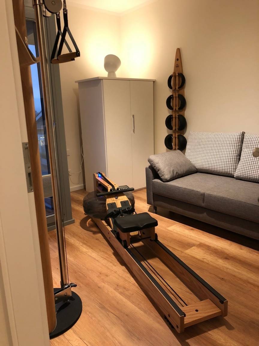 Für Fitnessfans ist ein Zimmer mit hochwertigen Trainigsgeräten ausgestattet (Waterrrower, Slimbeam, Kurzhanteln).