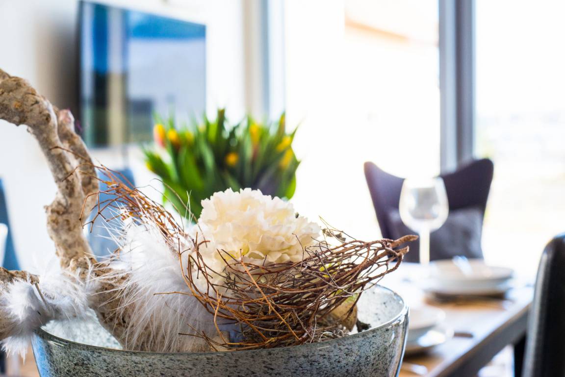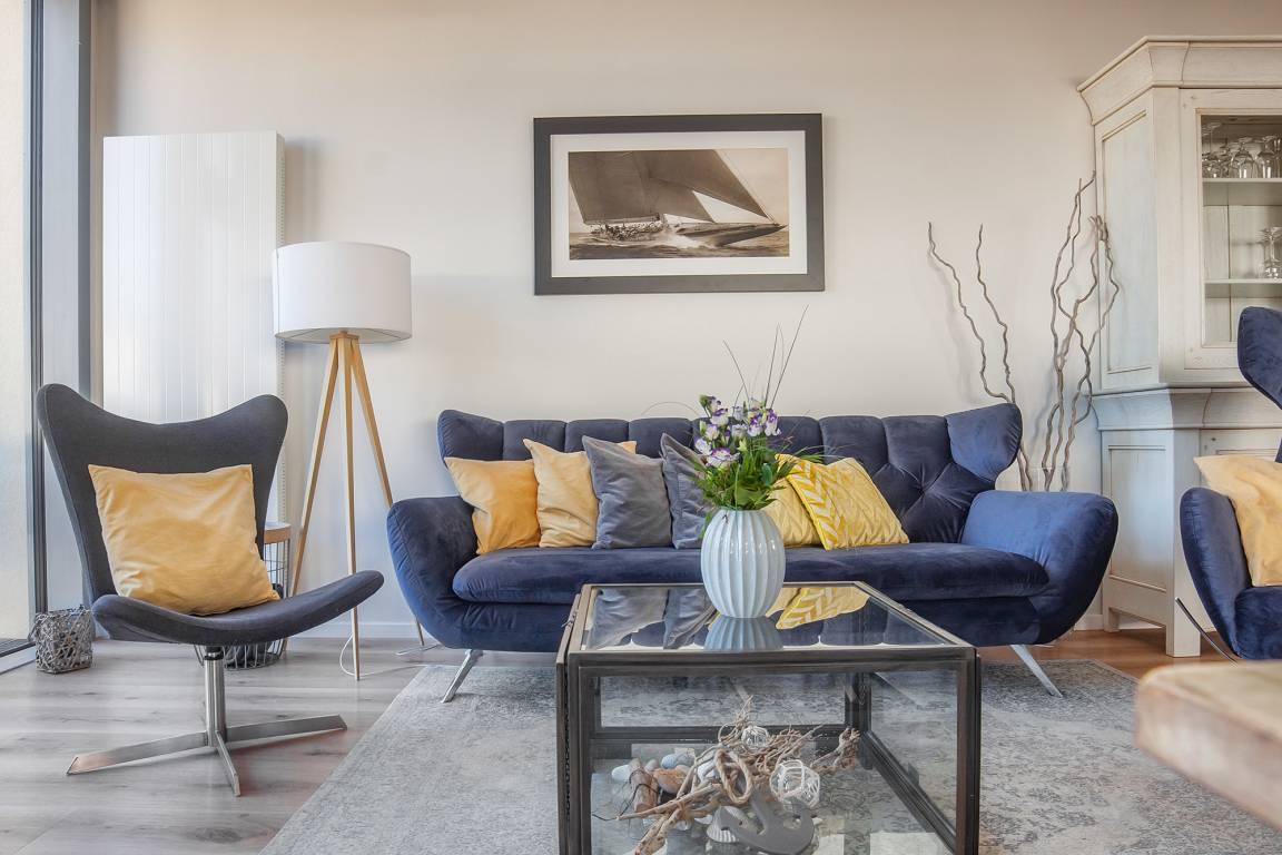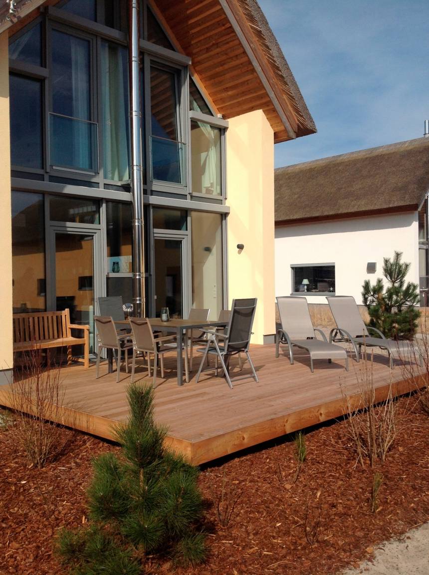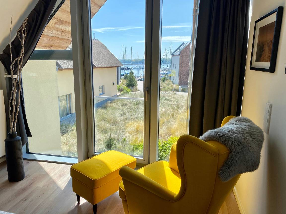 Aus dem Wohnzimmer gelangen Sie auf die große, möblierte Terrasse (Sitzgruppe, Sonnenliegen, Grill) mit herrlichem Blick auf die Dünenlandschaft und den Marina Yachthafen. Sonne von mittags bis zum Sonnenuntergang, rundet dieses wunderschöne Urlaubsdomizil in ruhiger und erster Standlage, angrenzend an das Naturschutzgebiet (Halbinsel-Graswader), ab. Genießen Sie nach einem erholsamen Tag, bei einem Glas Wein oder nach dem Saunagang, die Abendsonne auf der Terrasse.