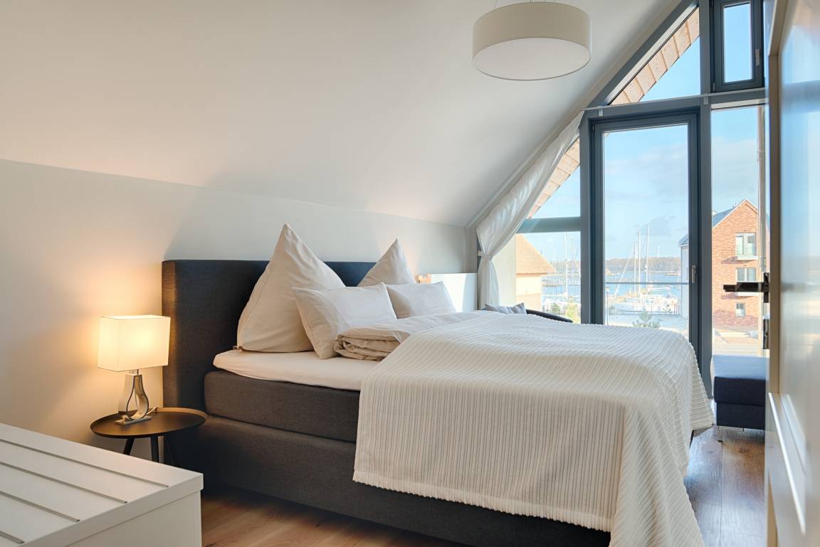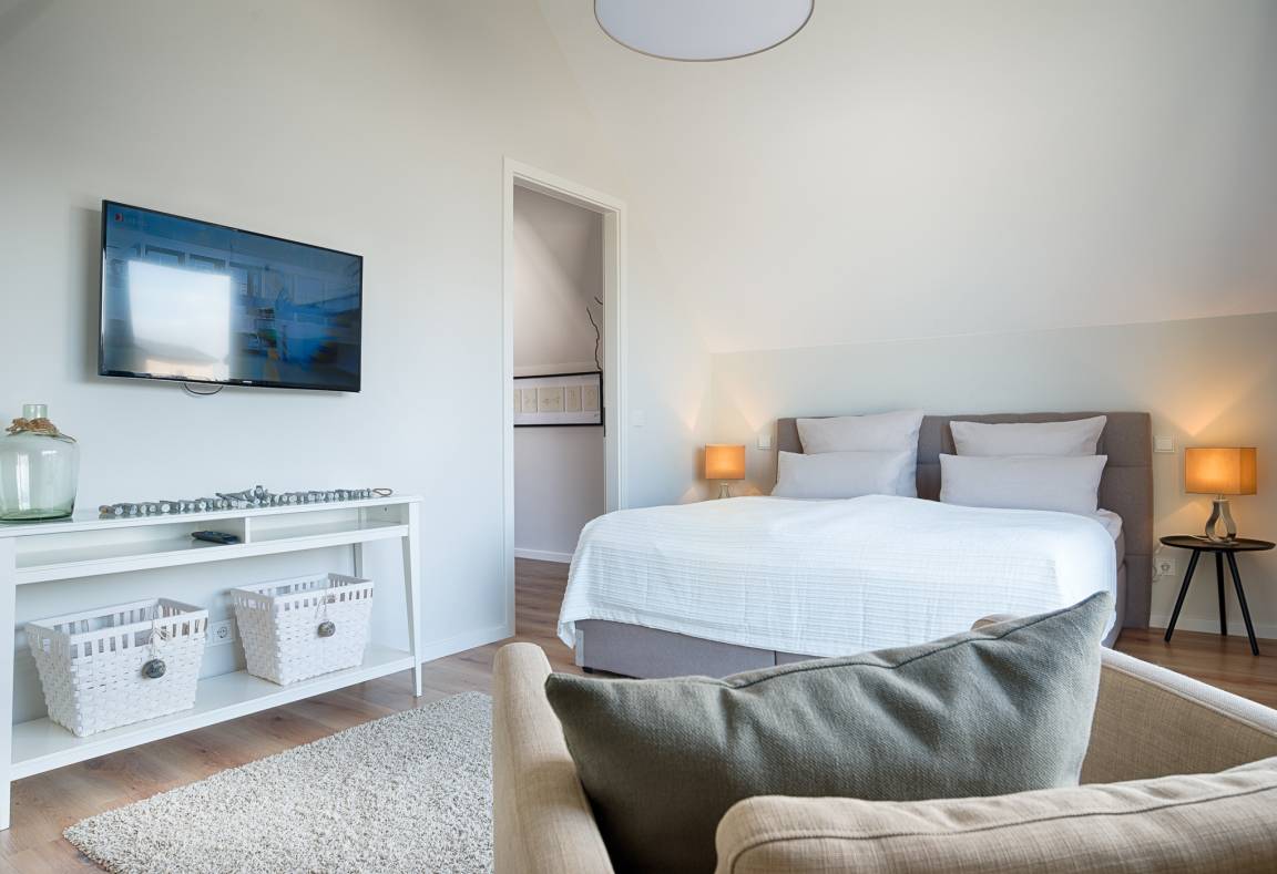 Drei separate Schlafzimmer befinden sich im Obergeschoss und bieten Platz für bis zu sechs Personen. Zwei Schlafzimmer verfügen über ein Doppel-Boxspring-Bett (180 cm x 200 cm) und jeweils einem internetfähigen Flat Screen-TV. Das dritte Schlafzimmer ist mit zwei Einzelbetten ausgestattet und verfügt ebenso über einen Flat Screen-TV. Der Masterbedroom bietet Ihnen zudem einen wunderschönen Meerblick, den Sie auch von Ihrem separaten Balkon aus genießen können. Die beiden anderen Schlafzimmer, ausgestattet mit Panoramafenstern, erlauben Ihnen die Aussicht in die Dünenlandschaft und auf den Marina-Yachthafen. Das Ferienhaus verfügt im Obergeschoss zudem über eine Diele mit Schreibtisch, ein großes Badezimmer mit bodengleicher Dusche und großem Waschtisch. Darüber hinaus befindet sich dort angrenzend auch eine Wachmaschine mit integriertem Trockner.