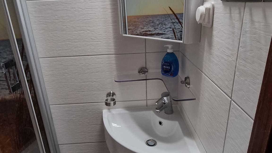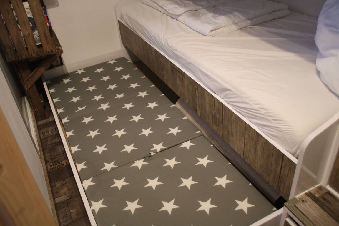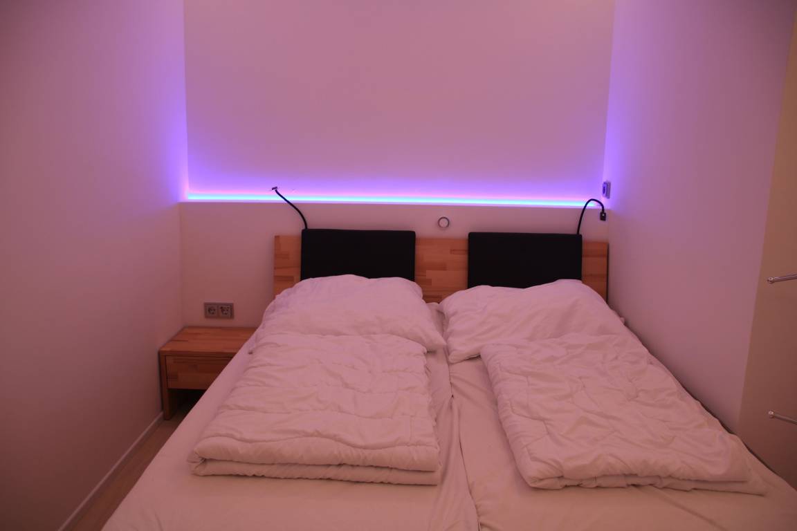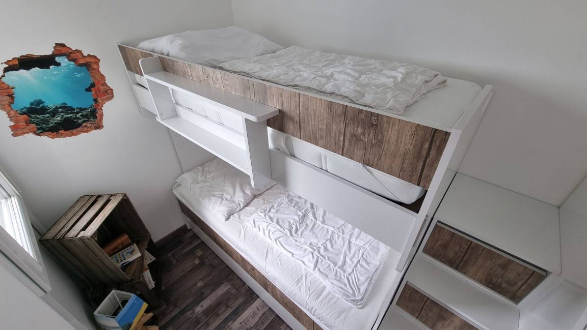 Zur Wohnung gehört ein Schlafzimmer mit Doppelbett (160×200m), ein Kinderzimmer mit Etagenbett, ein Badezimmer mit WC und Dusche sowie eine offene Küche mit Wohnbereich. Für eine weitere erwachsene Person steht ein Schlafsofa zur Verfügung. Sollte ein weiteres Kind mit anreisen, kann dieses auch auf einer Schlafmatratze im Kinderzimmer nächtigen.