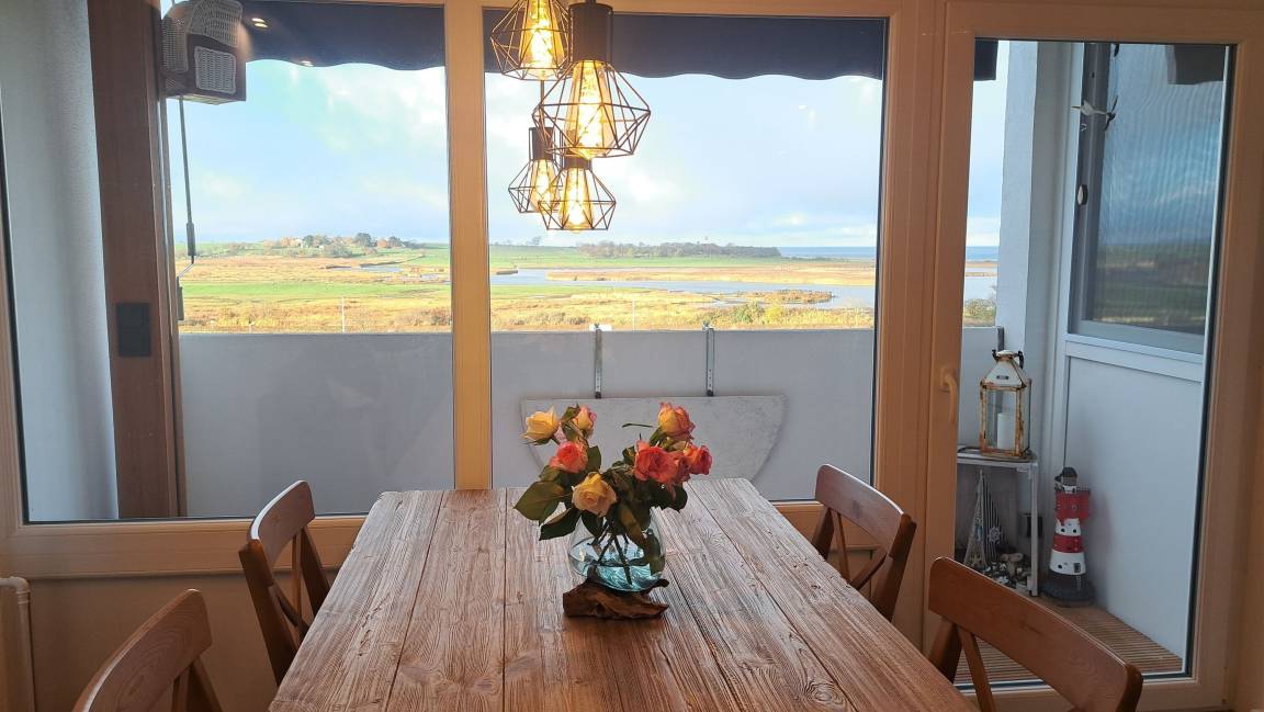 Im Wohnzimmer sitzt man an einem rustikalen Holztisch und schaut über die Salzwiesen mit ihren Gallowayrindern zum Leuchtturm und Ostsee.