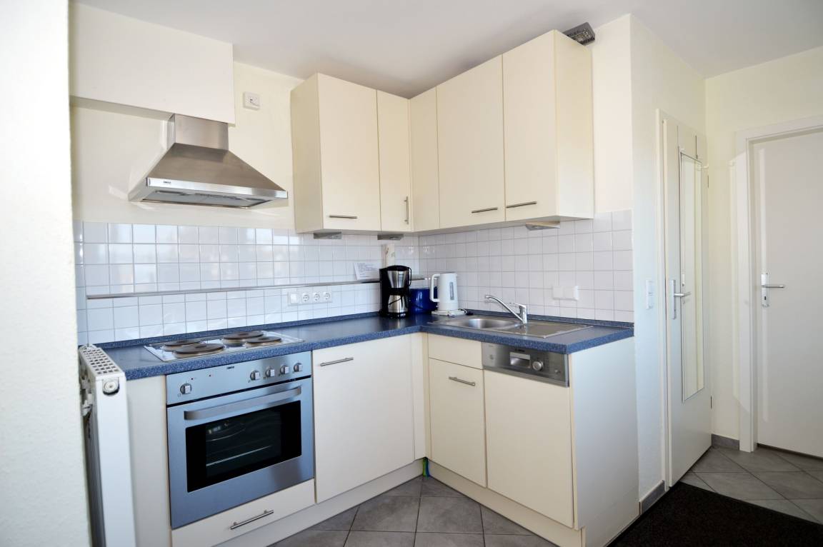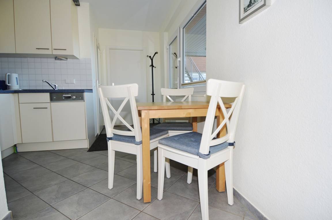 Die Küche ist funktional und ausgestattet für die Selbstversorgung während des Aufenthalts. Der angrenzende Essbereich ist in den Wohnbereich integriert.