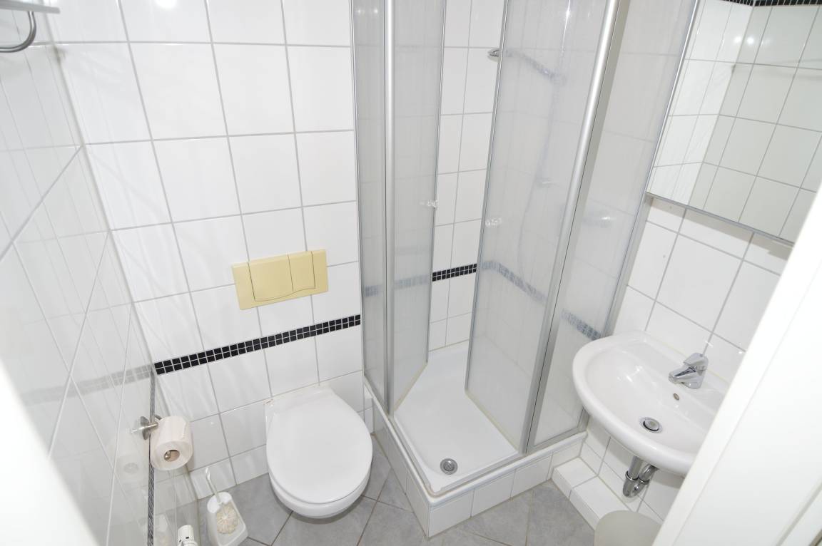 Das Badezimmer ist mit Dusche, Waschbecken und WC ausgestattet.