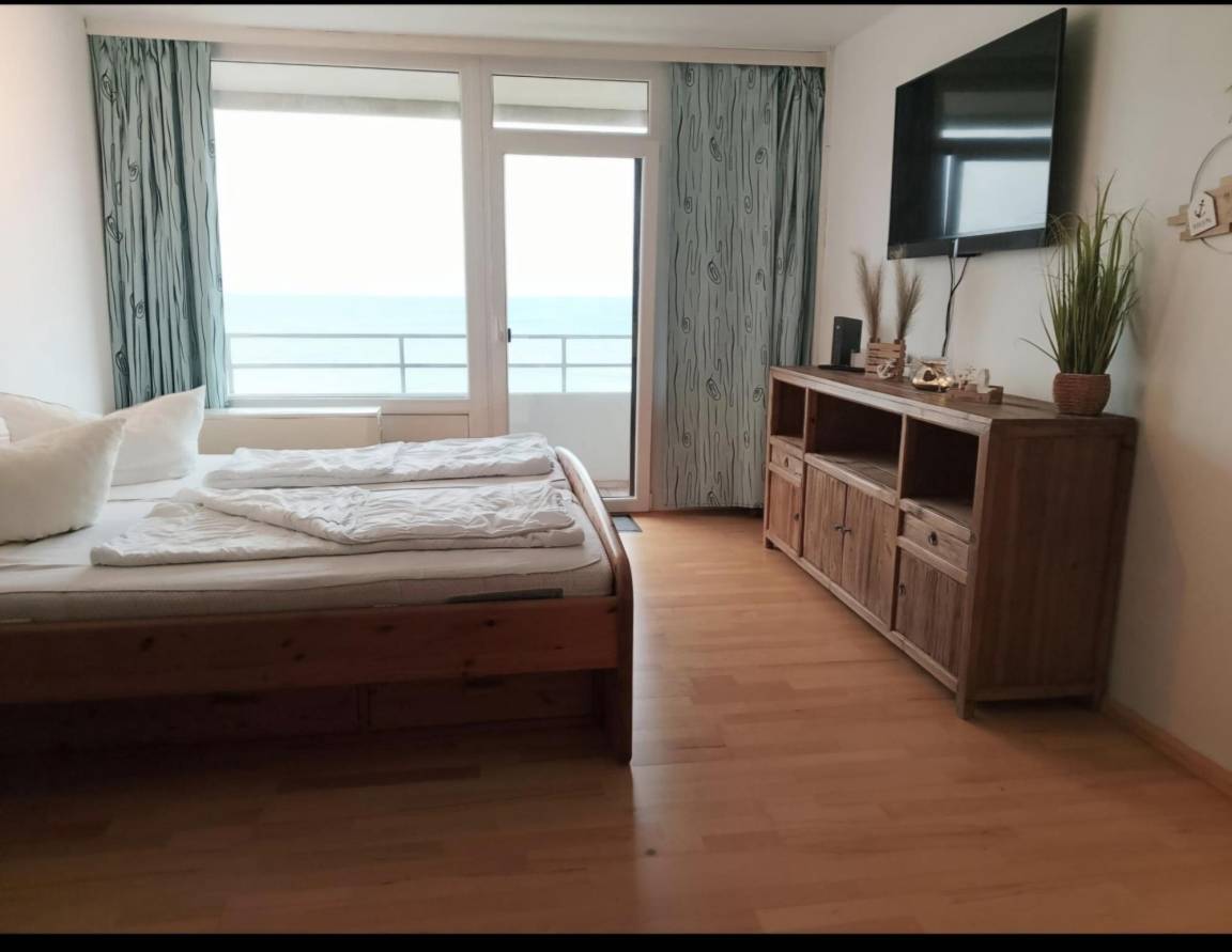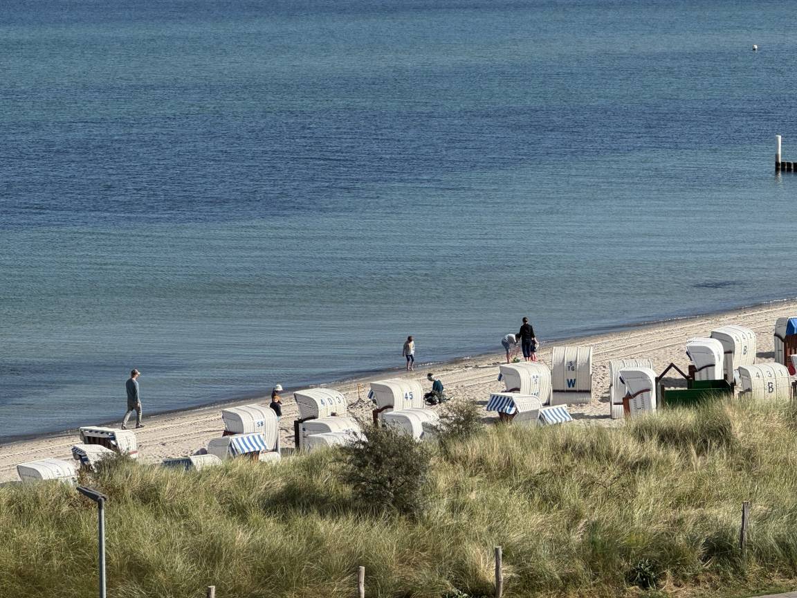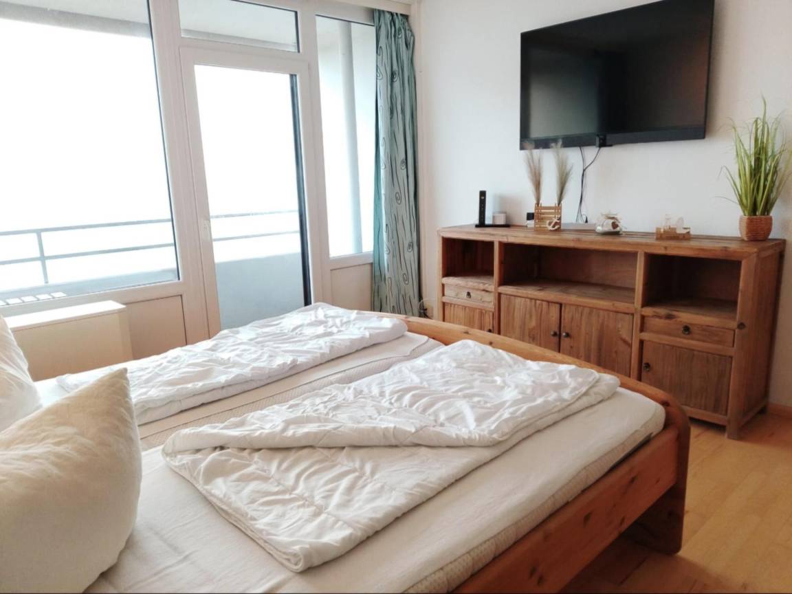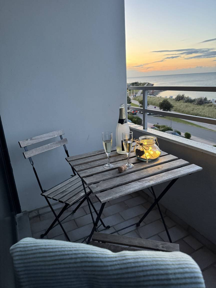 Der Balkon in der 4. Etage bietet einen herrlichen Ostseeweitblick, der zum Verweilen und Seele baumeln lassen einlädt. Das Doppelbett mit zwei getrennten Matratzen sorgt für erholsame Nächte – kein Schrankklappbett, sondern echtes Komfort-Schlafen.