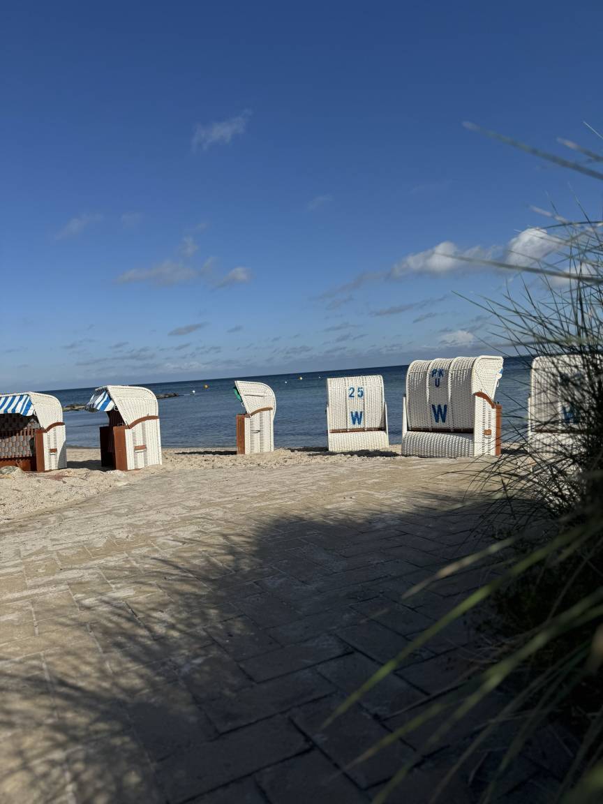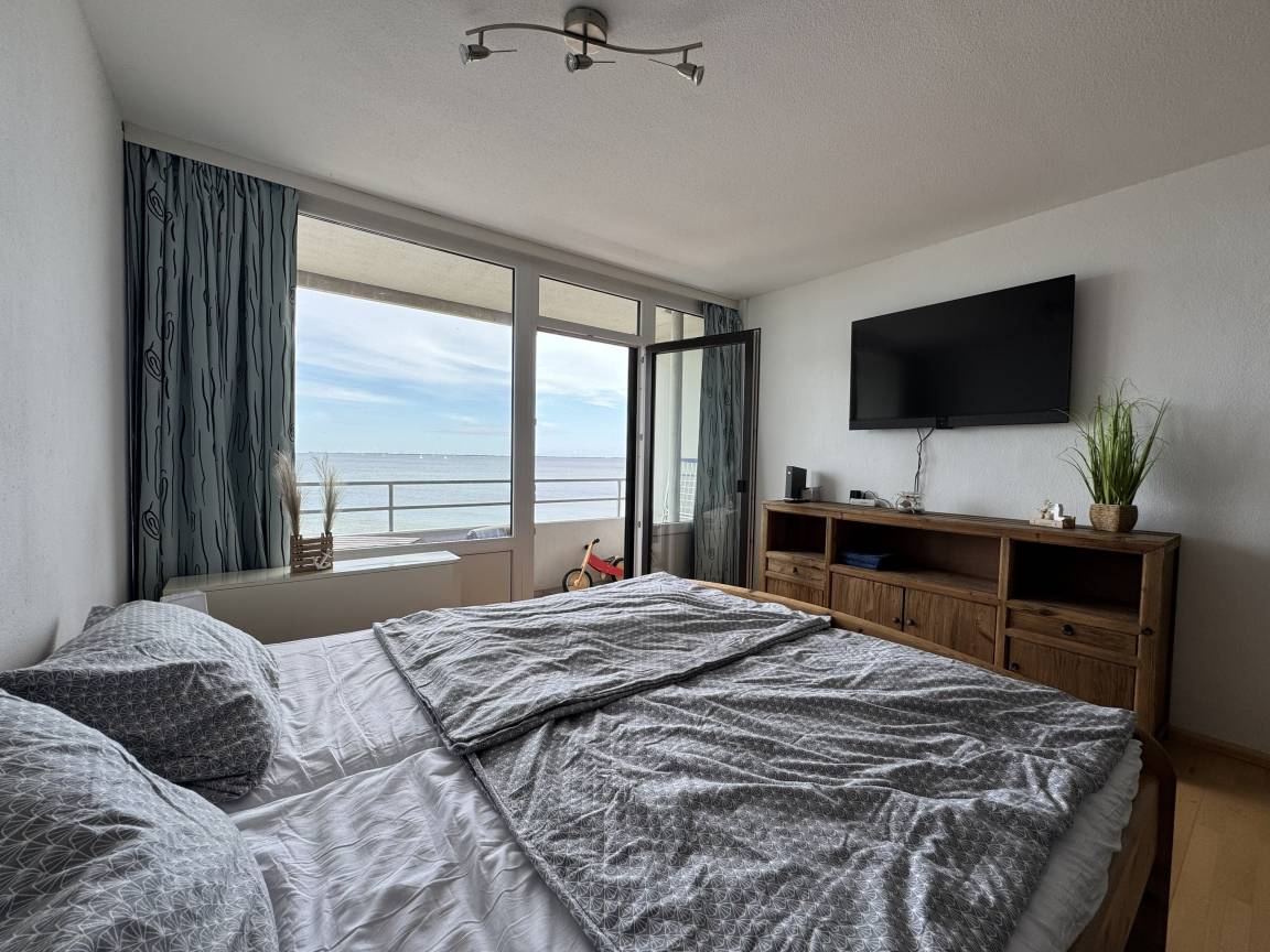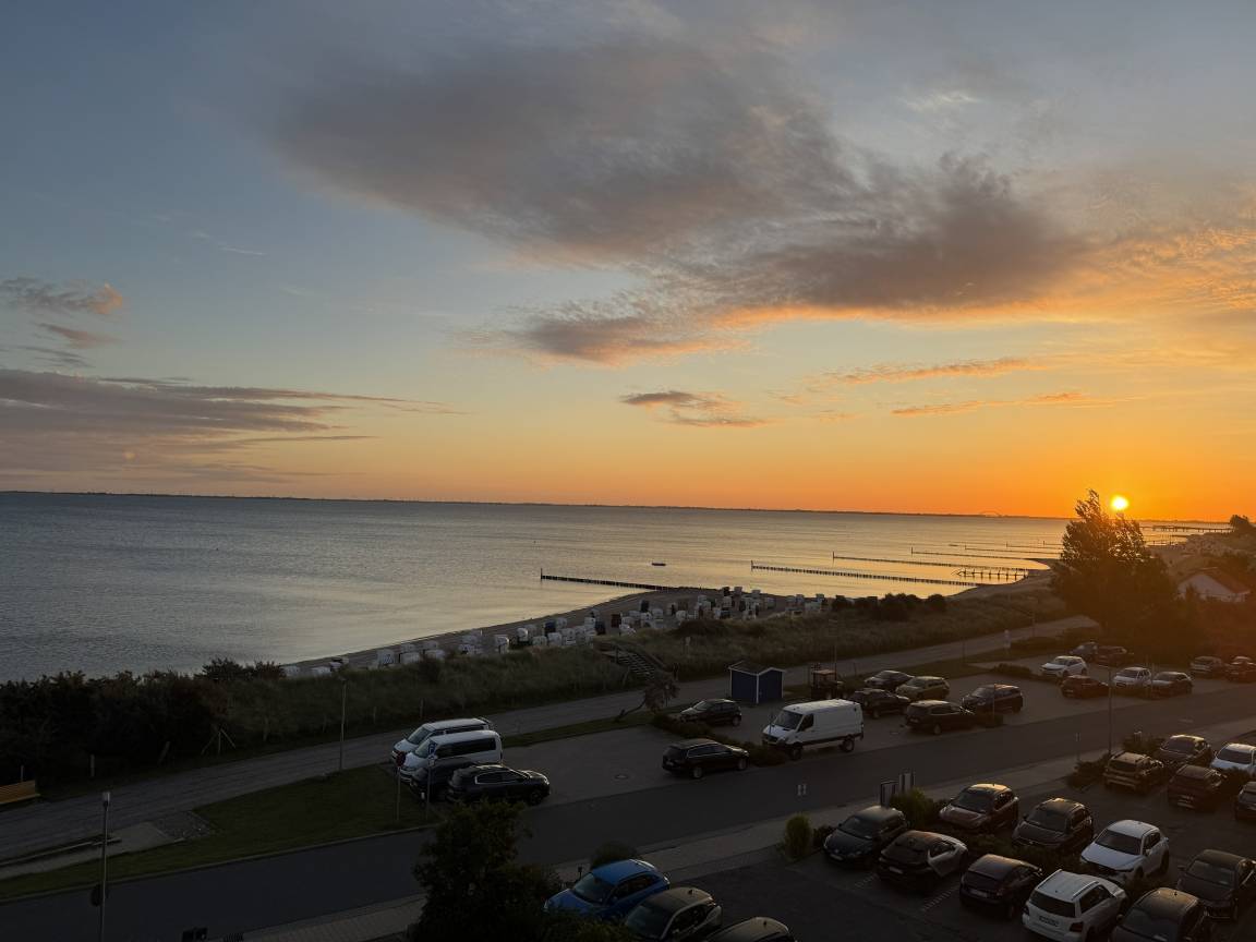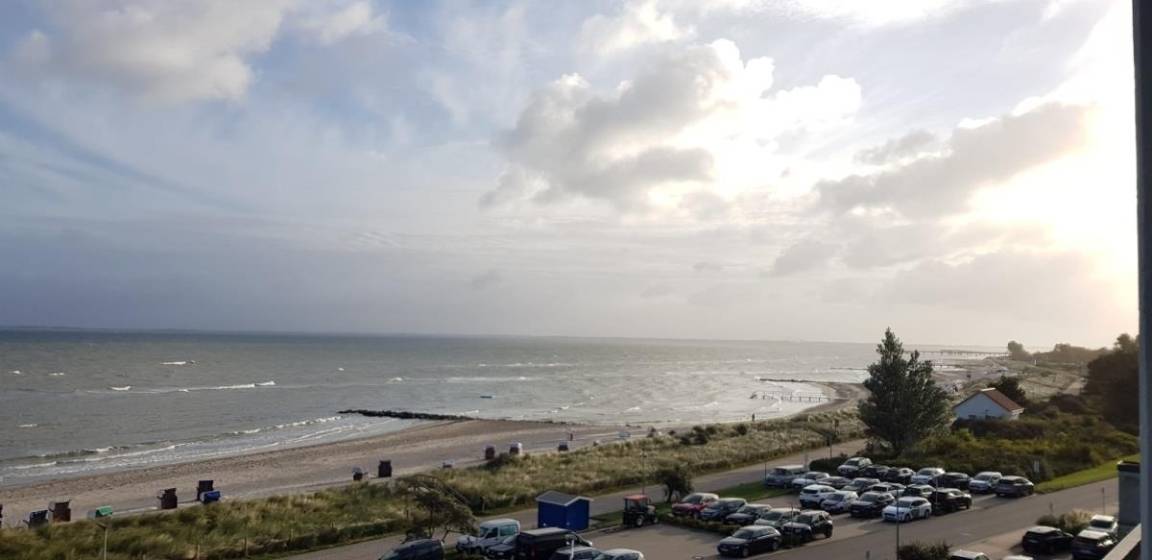 Der Balkon in der 4. Etage bietet einen herrlichen Ostseeweitblick, der zum Verweilen und Seele baumeln lassen einlädt. Das Doppelbett mit zwei getrennten Matratzen sorgt für erholsame Nächte – kein Schrankklappbett, sondern echtes Komfort-Schlafen.