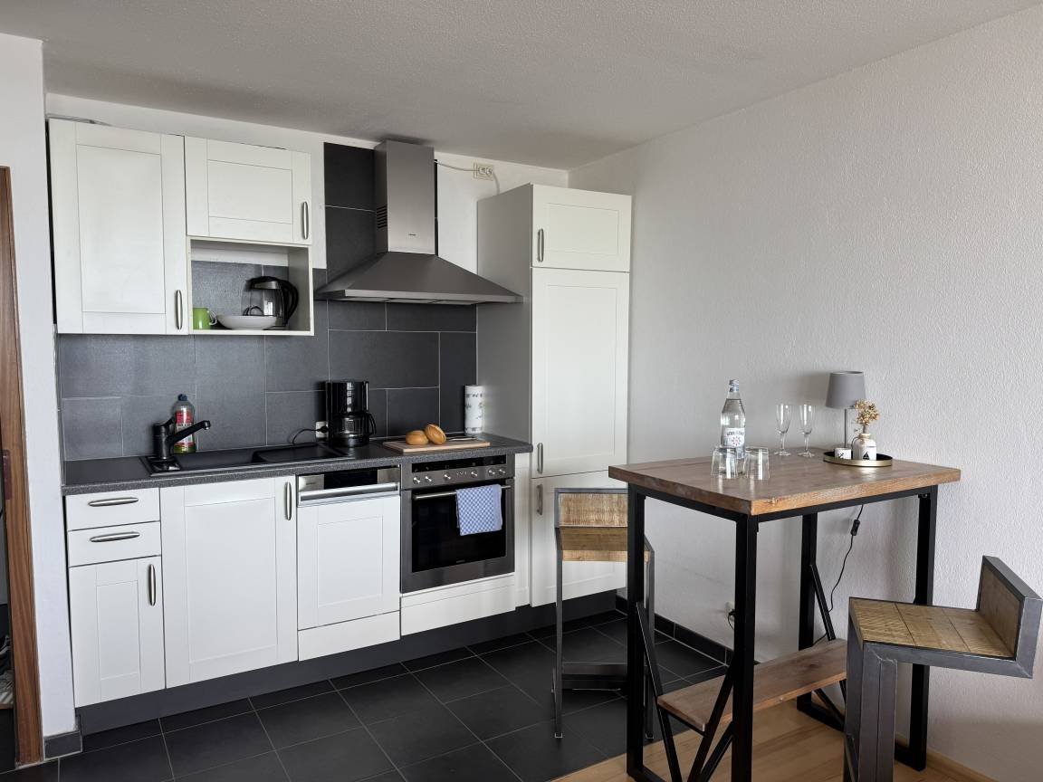 Der Wohn- und Schlafbereich ist komfortabel eingerichtet und verfügt über ein gemütliches Doppelbett mit zwei getrennten Matratzen, das für einen erholsamen Schlaf sorgt. Die moderne Küchenzeile lässt keine Wünsche offen: Ausgestattet mit Ceranfeld, Geschirrspüler und Gefrierfach bietet sie alles, was Sie für die Zubereitung Ihrer Mahlzeiten benötigen. Somit eignet sich das Studio sowohl für kurze Aufenthalte als auch für längere Urlaube.