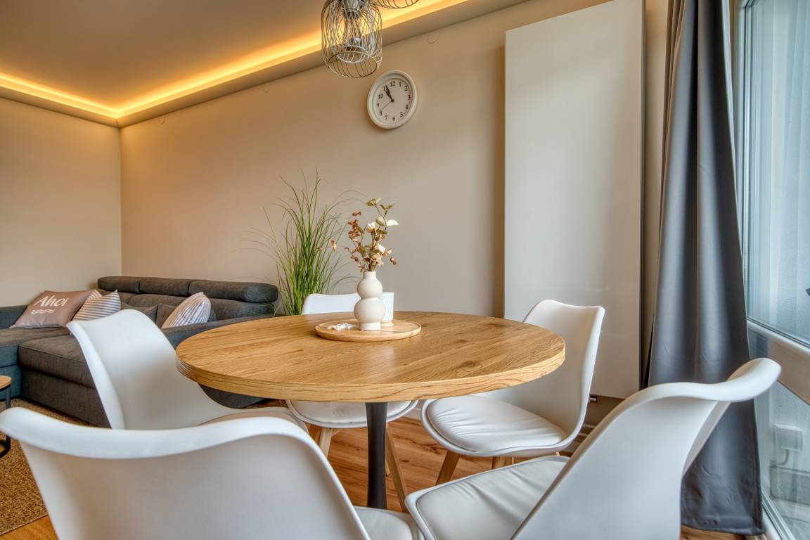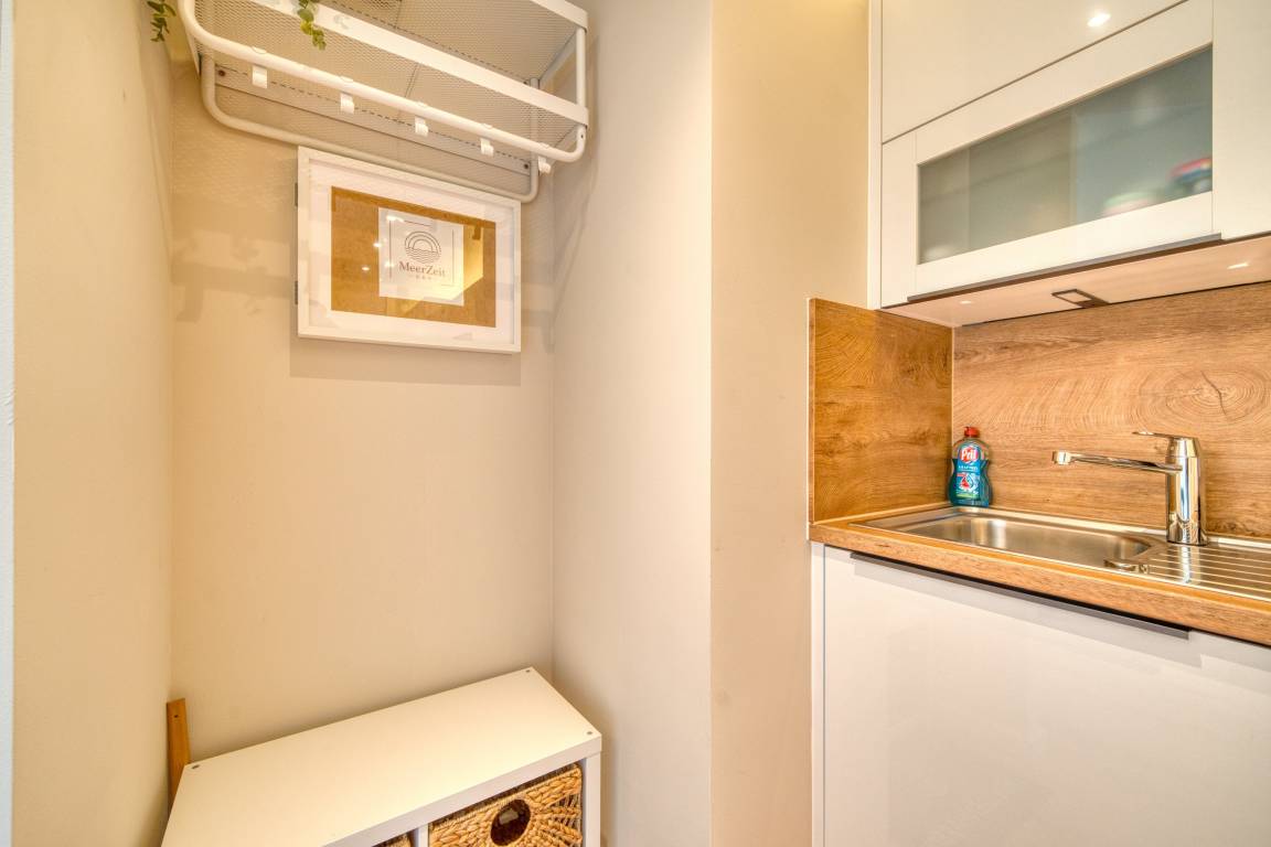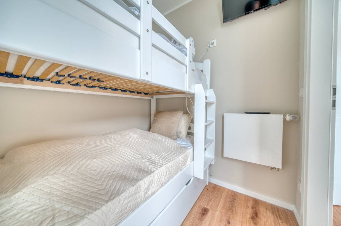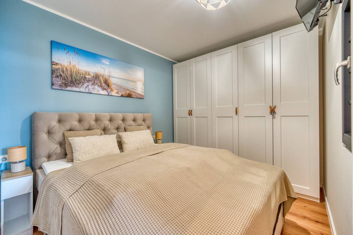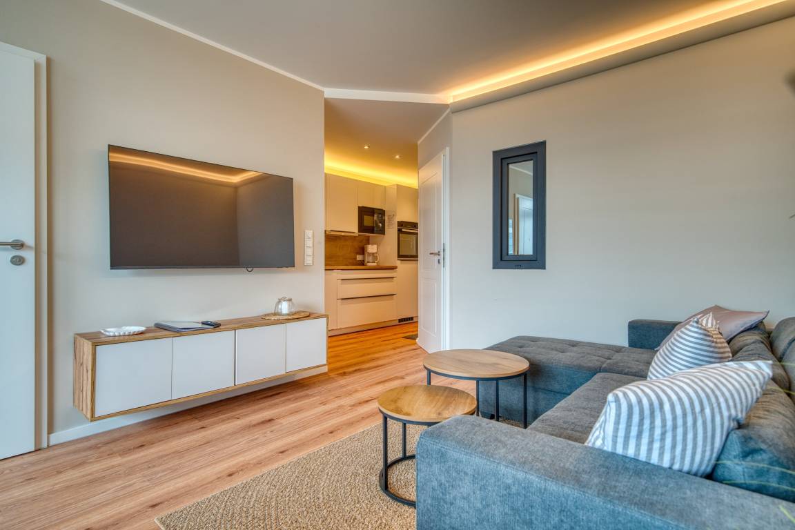 Offener Wohnbereich mit Sofa, Essplatz für 5 Personen und Flachbild-TV. Elternschlafbereich mit Doppelbett (1,60x2,00 m) und eigenem TV, Kinderzimmer mit Doppelbett für 2 Personen. Moderne Laminatböden. Küche mit Ceranfeld, Backofen, Geschirrspüler, Mikrowelle, Kühlschrank mit Gefrierfach, Kaffeemaschine, Wasserkocher und allen Küchenutensilien. Bad mit Dusche und WC. Bonus: WLAN, Freikarte für die Kinderspielwelt „Schatzinsel". Nichtraucherwohnung, keine Haustiere, Fahrstuhl, Fahrradräume, ca. 300 m zum Strand, kostenloser Parkplatz.
