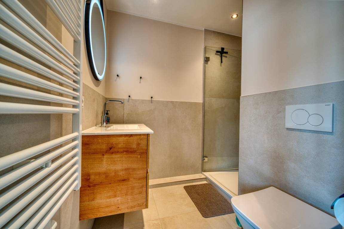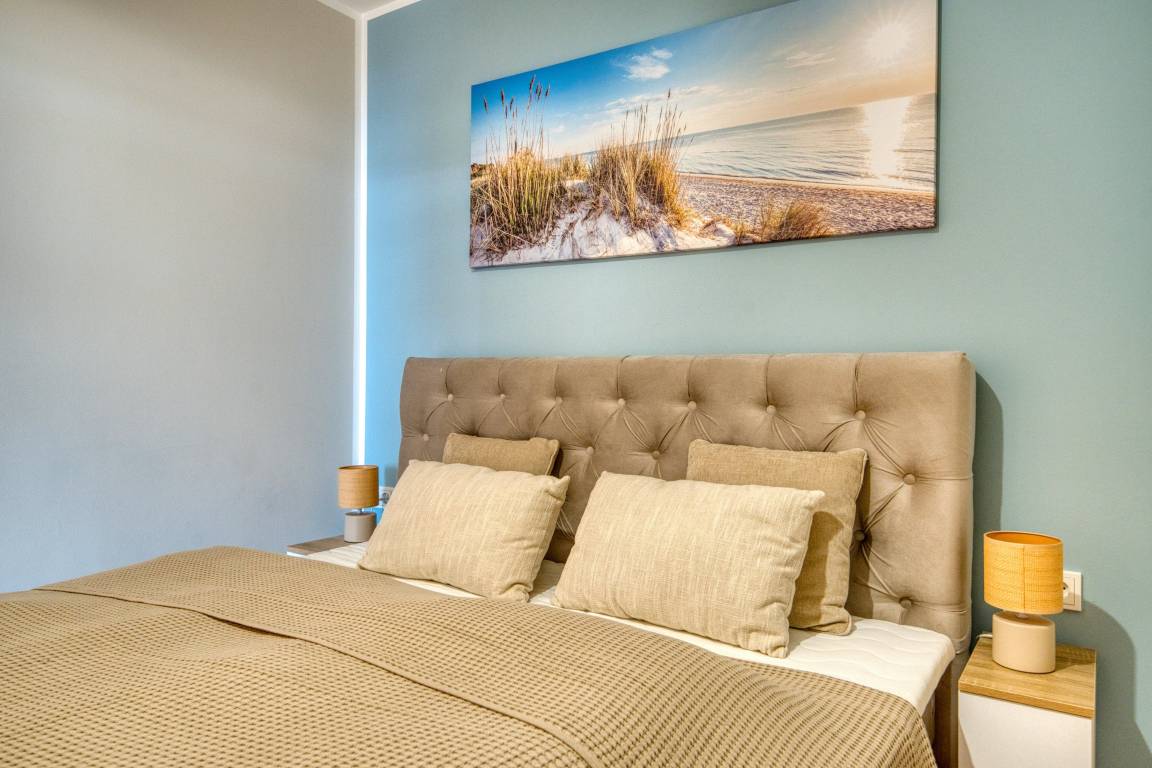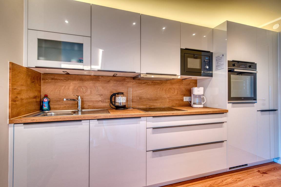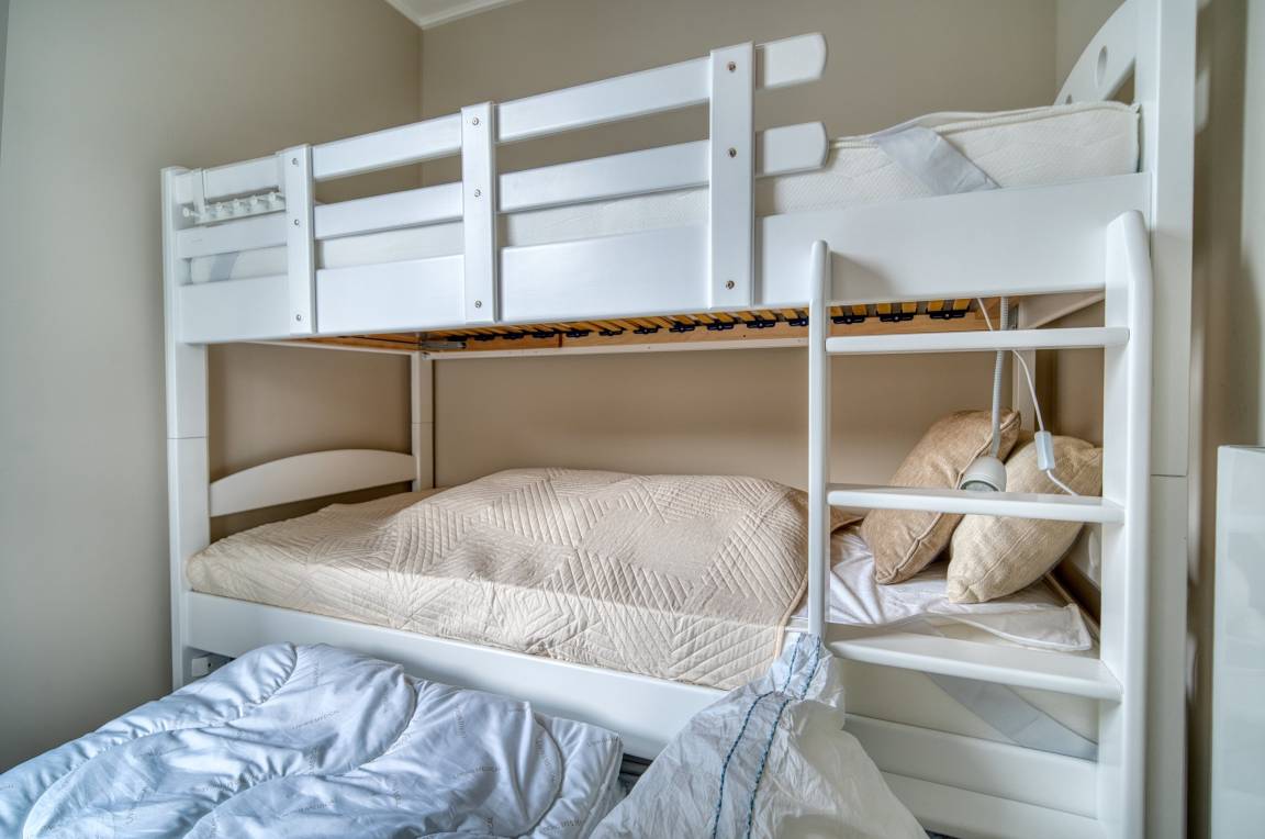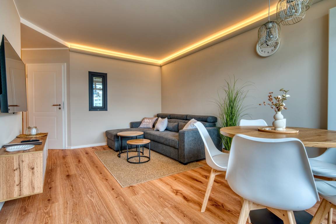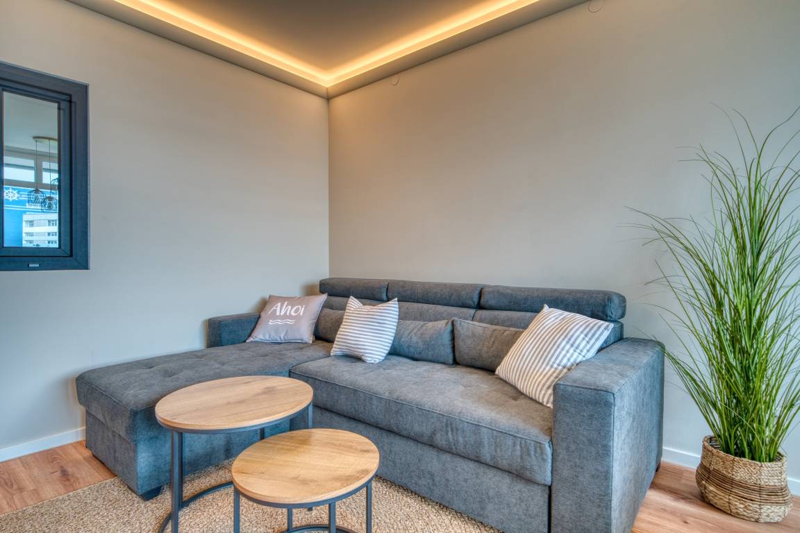 Offener Wohnbereich mit Sofa, Essplatz für 5 Personen und Flachbild-TV. Elternschlafbereich mit Doppelbett (1,60x2,00 m) und eigenem TV, Kinderzimmer mit Doppelbett für 2 Personen. Moderne Laminatböden. Küche mit Ceranfeld, Backofen, Geschirrspüler, Mikrowelle, Kühlschrank mit Gefrierfach, Kaffeemaschine, Wasserkocher und allen Küchenutensilien. Bad mit Dusche und WC. Bonus: WLAN, Freikarte für die Kinderspielwelt „Schatzinsel". Nichtraucherwohnung, keine Haustiere, Fahrstuhl, Fahrradräume, ca. 300 m zum Strand, kostenloser Parkplatz.