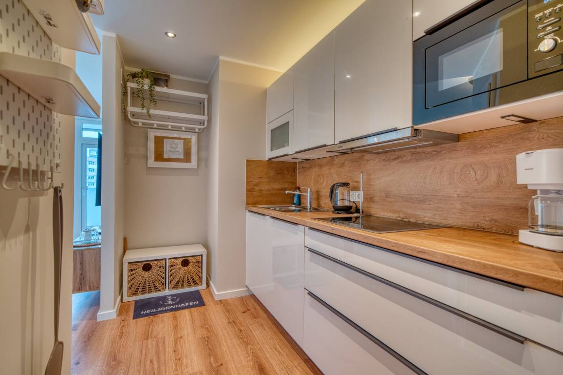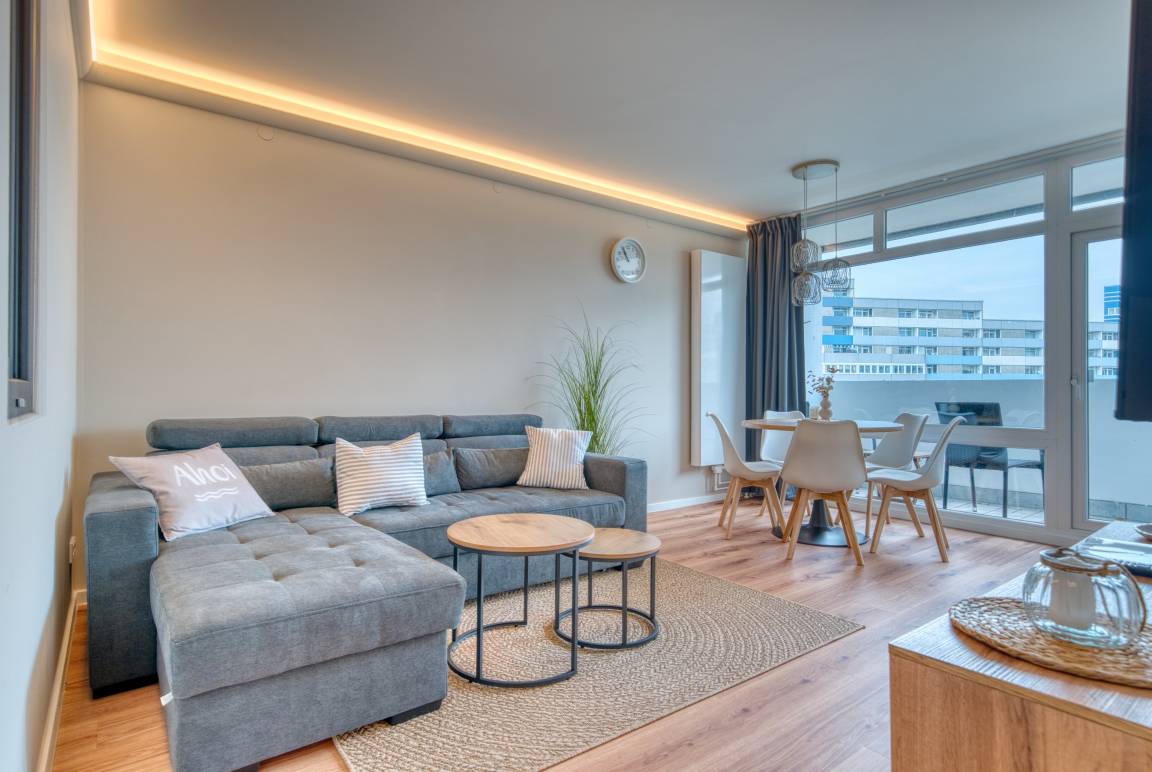 Diese im Jahr 2026 komplett sanierte Ferienwohnung liegt in der 6. Etage des Hauses Q im Ferienpark Heiligenhafen. Auf 45 m² Wohnfläche überzeugt sie durch eine architektonisch durchdachte Raumaufteilung und eine moderne Ausstattung, die keine Wünsche offenlässt. Der Balkon in Nord-Ostlage bietet einen entspannten Blick auf die gepflegten Grünanlagen des Ferienparks, sowie einen seitlichen Meerblick.