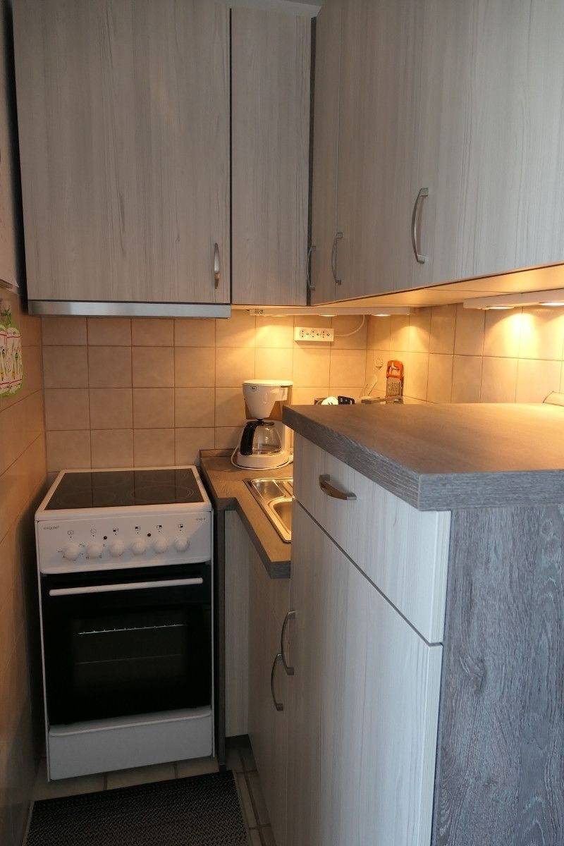 Die moderne Küchenzeile ist voll ausgestattet mit Backofen, Cerankochfeld und einer Mikrowelle mit Heißluftfunktion – ideal für die Selbstversorgung im Urlaub. Das Duschbad mit WC und Waschbecken ist funktional eingerichtet.
