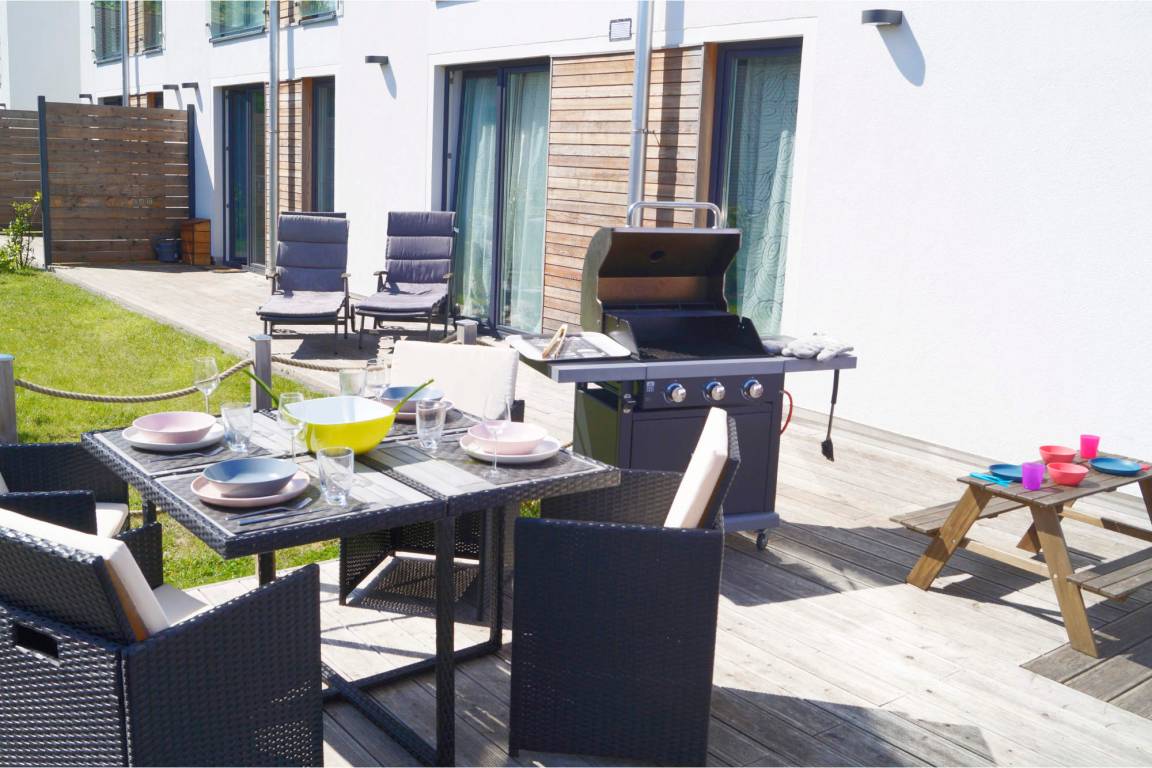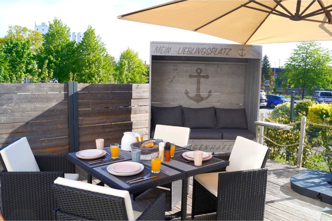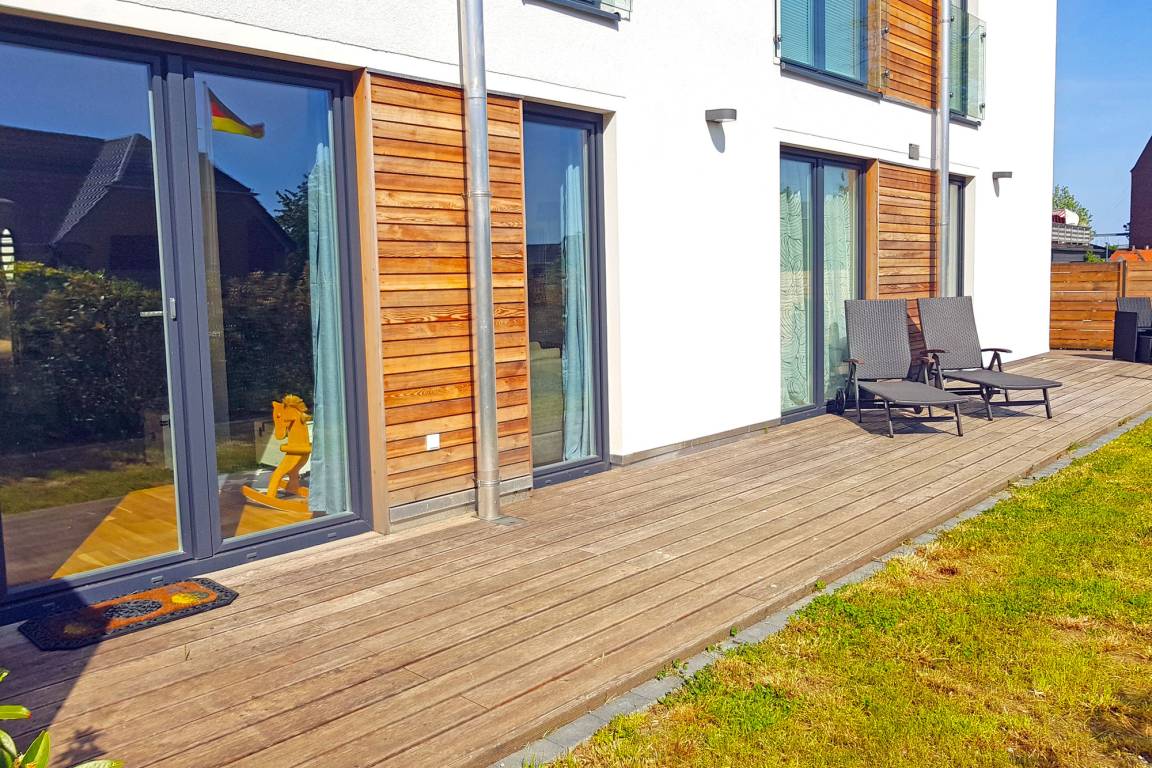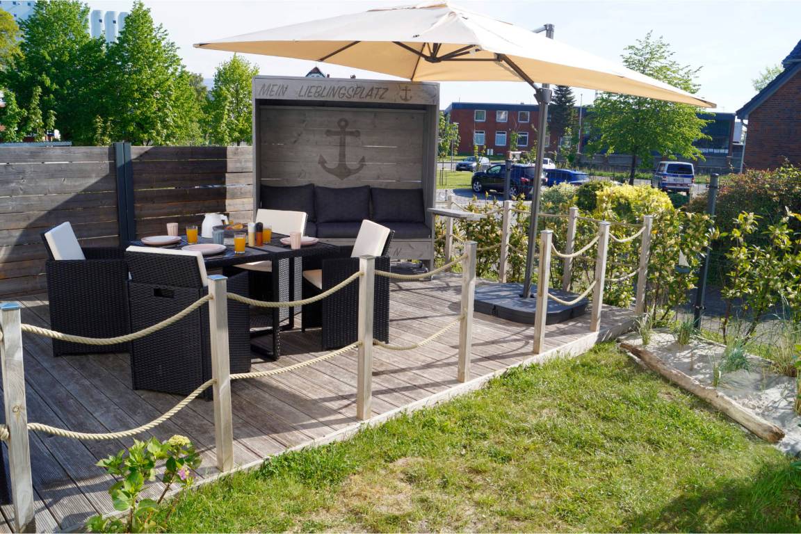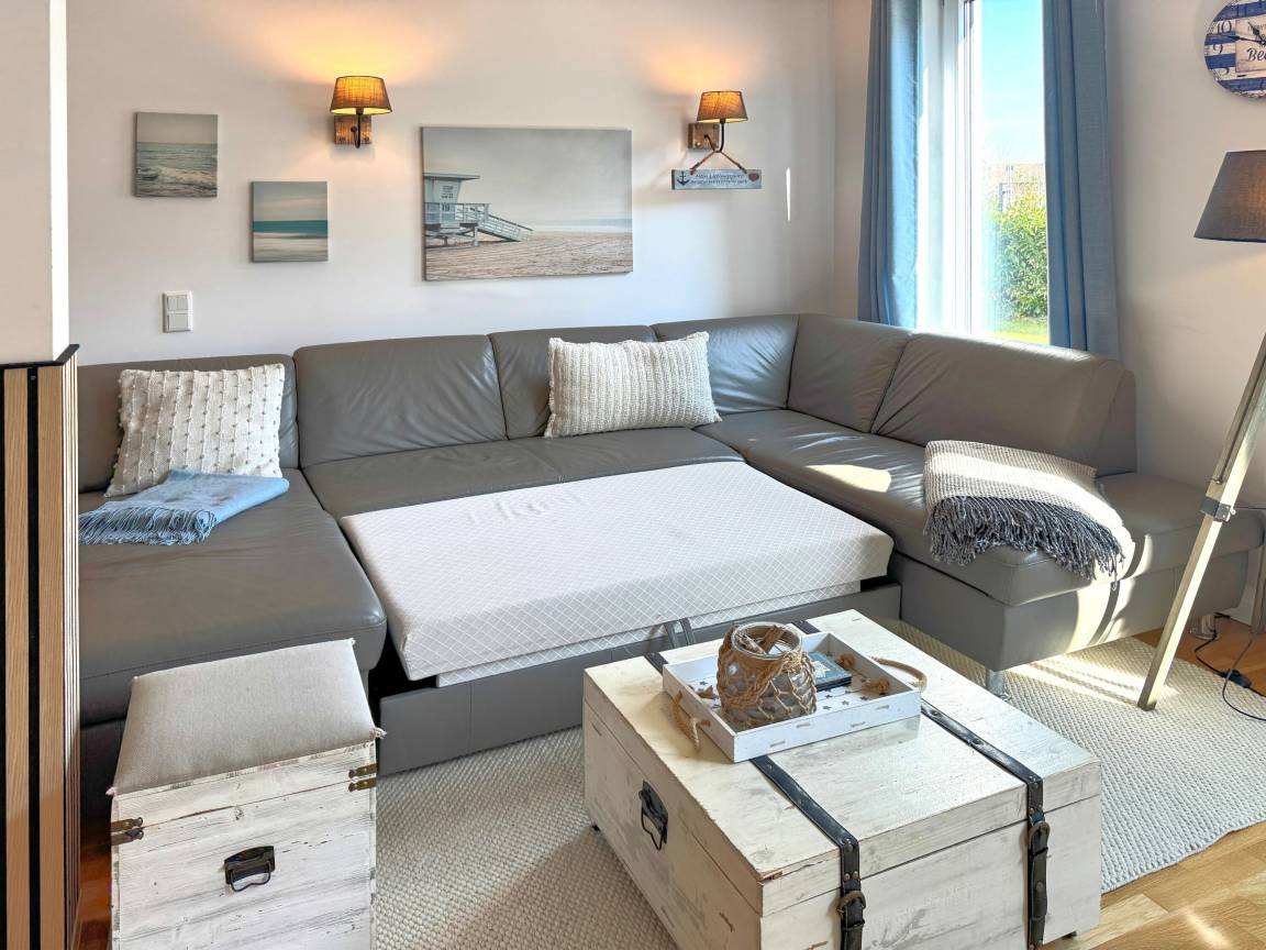 Der offene Wohnbereich lädt mit einer großen, bequemen Couch (Schlaffunktion), TV, DVD-Player, Radio (USB/Bluetooth) und WLAN zum Verweilen ein. Dank bodentiefer Fenster strömt viel Tageslicht in den Raum und gibt den Blick auf die möblierte Terrasse mit Strandkorb, Gasgrill, Sonnenschirm und Gartenbereich frei. Hier können Sie Ihre Mahlzeiten im Freien genießen und den Tag entspannt mit einem Glas Wein in der Abendsonne ausklingen lassen. Alternativ steht Ihnen die offene, voll ausgestattete Küche mit angrenzendem Essbereich zur Verfügung – perfekt für kulinarische Genussmomente.