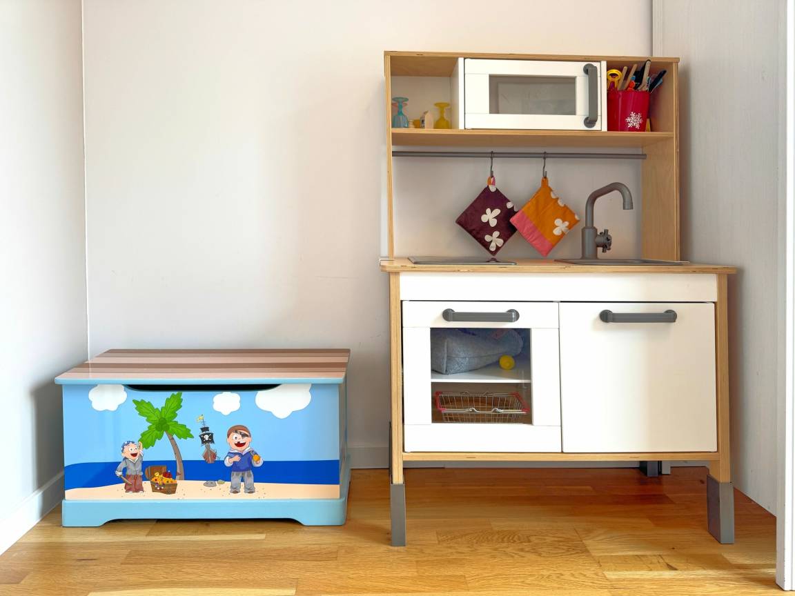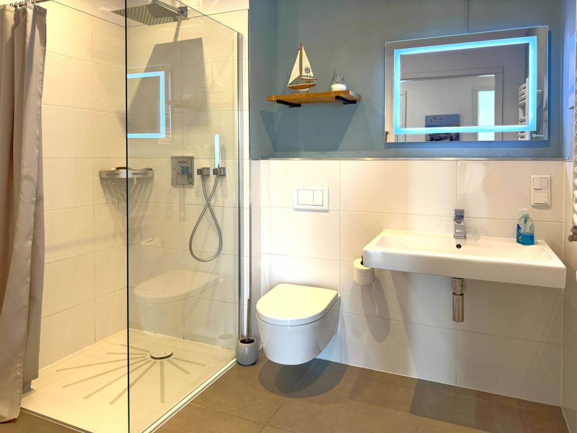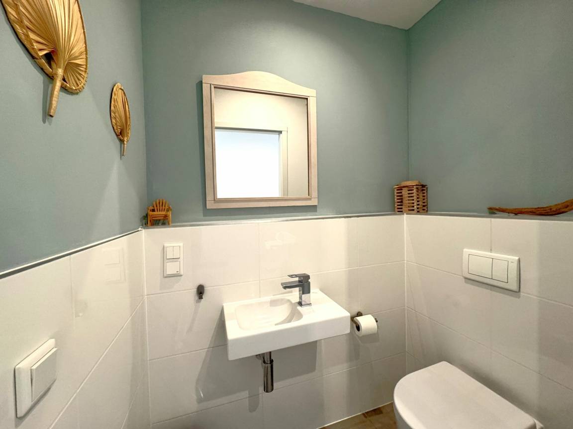 Für Kinder gibt es eine kleine Spielecke mit Spielzeug, Kinderküche und Schaukelpferd. Das moderne Badezimmer mit ebenerdiger Dusche, Handtuchwärmer, Föhn und WC sorgt für Komfort, während ein zusätzliches Gäste-WC für extra Bequemlichkeit sorgt. Ein Abstellraum mit Waschmaschine, Staubsauger und weiteren Haushaltsutensilien erleichtert den Aufenthalt. Zudem gibt es einen separaten Garderobenraum im Flur.