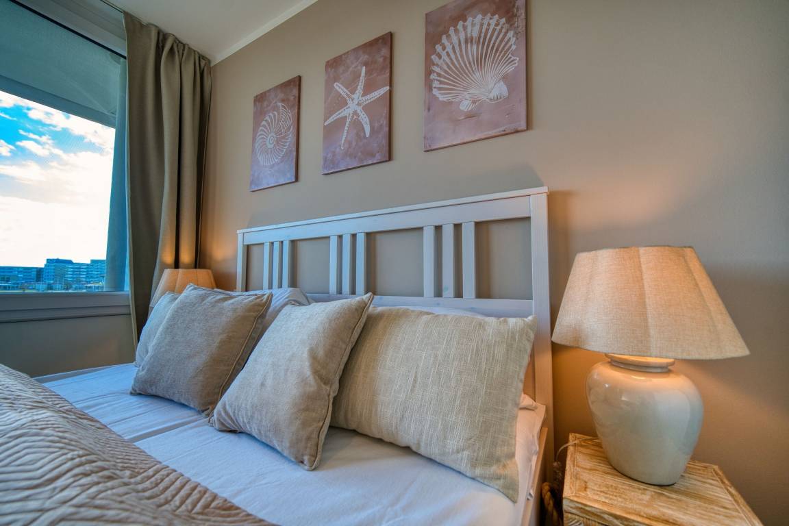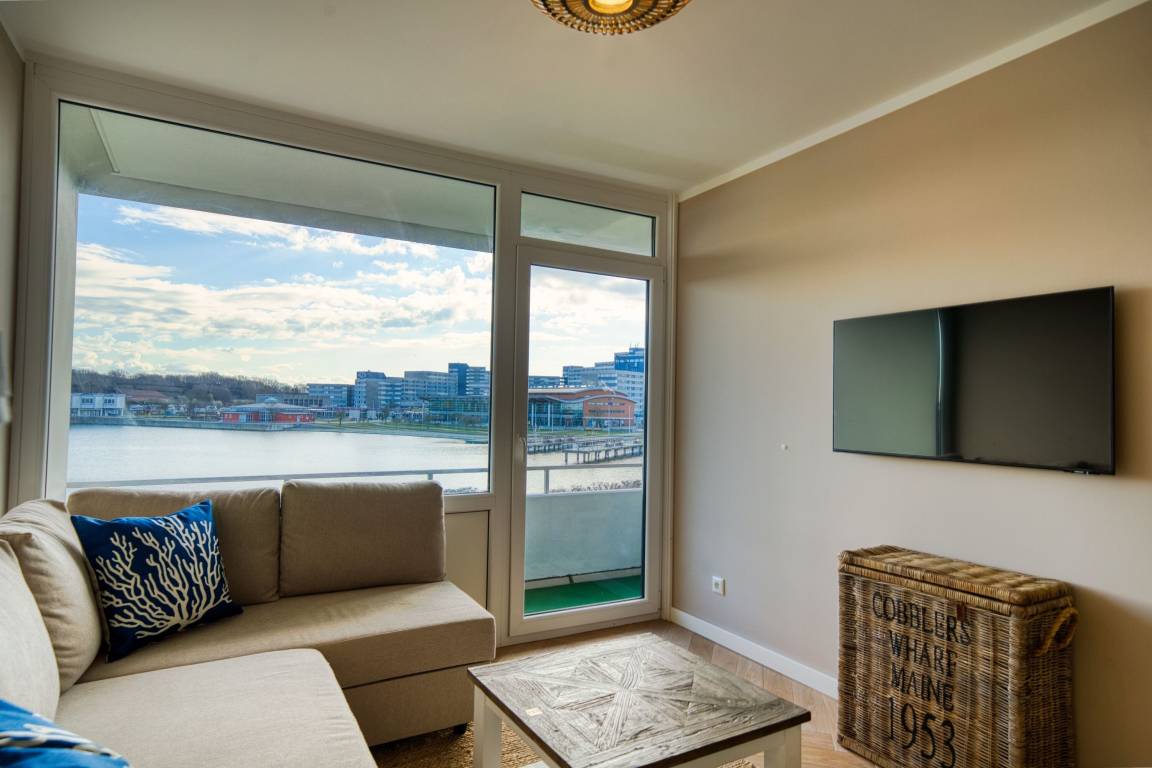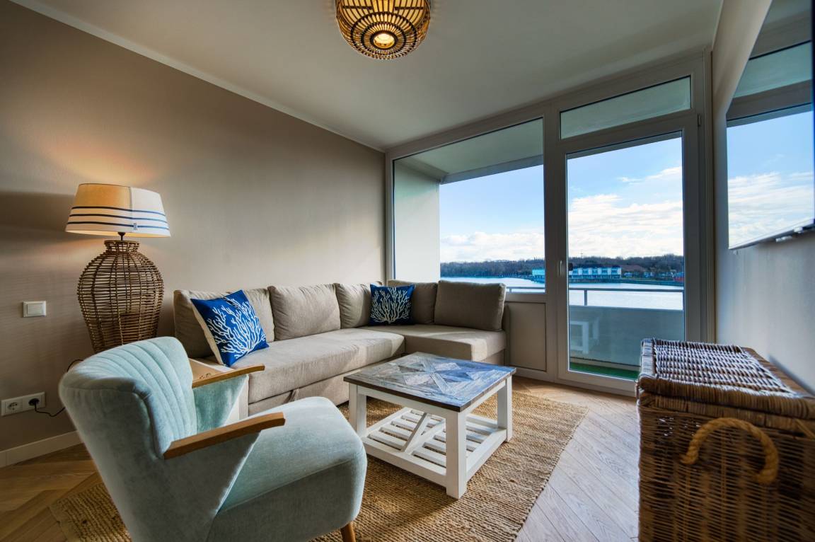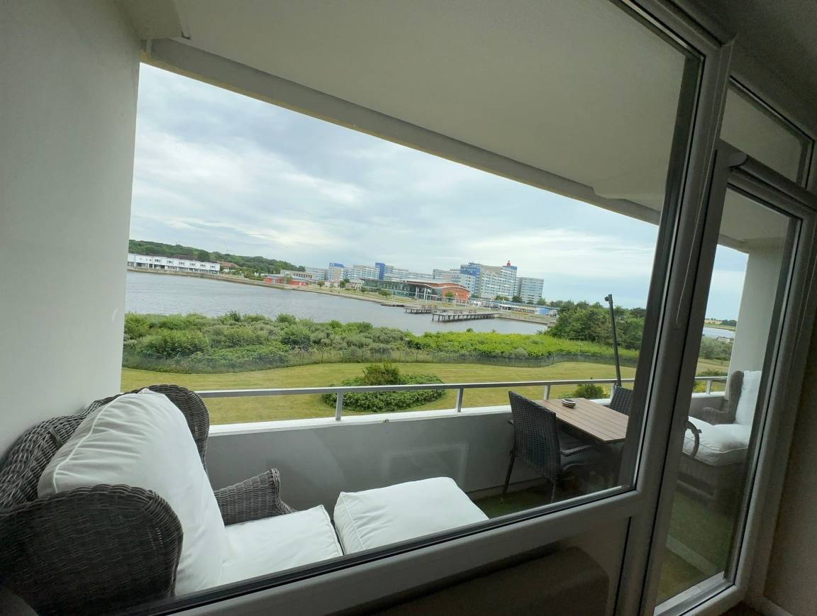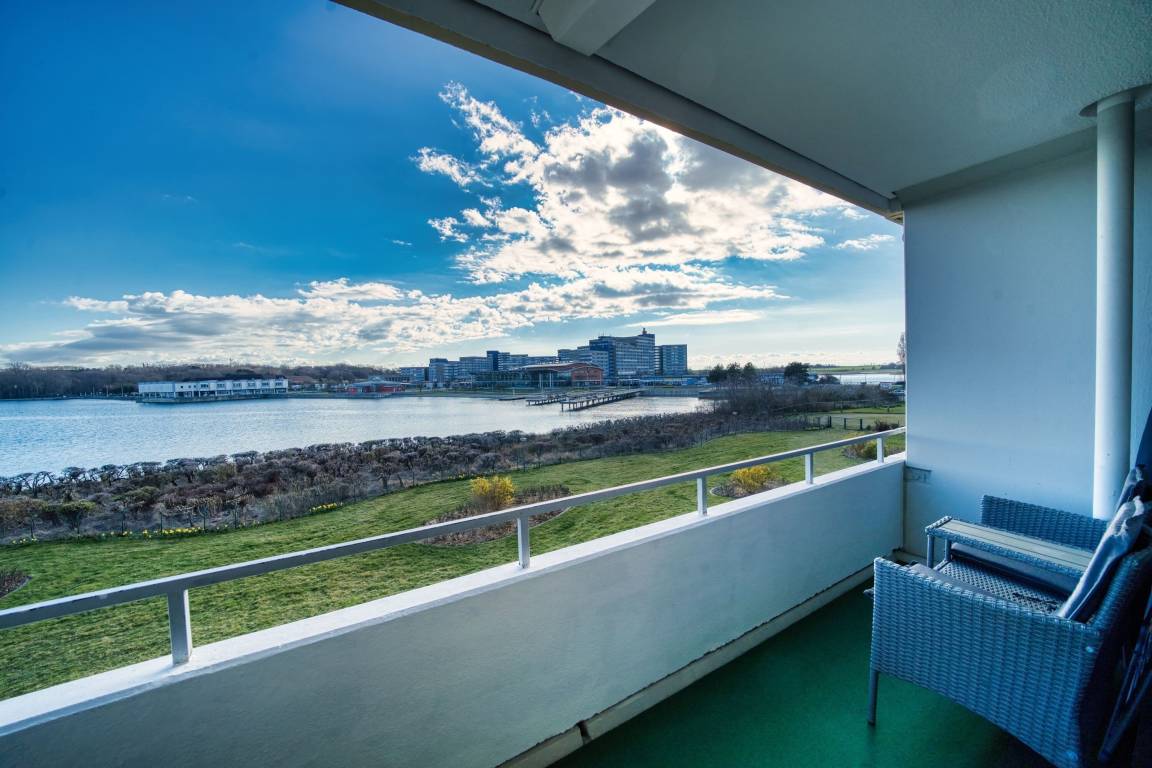 Balkon mit Blick auf den Binnensee, separater Schlafraum mit Doppelbett, Wohnbereich mit Schlafcouch und ausziehbarem Bett. Voll ausgestattete Küche (Ceranfeld, Geschirrspüler, Kühlschrank, Mikrowelle, Kaffeemaschine, Toaster, Wasserkocher). Badezimmer mit Dusche und Handtuchtrockner. WLAN inklusive. Fahrstuhl im Haus, Parkplatz nach Verfügbarkeit.