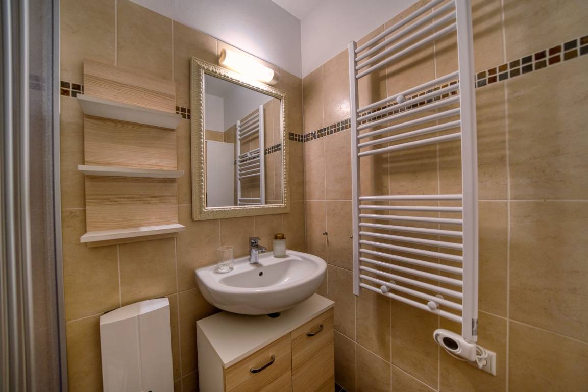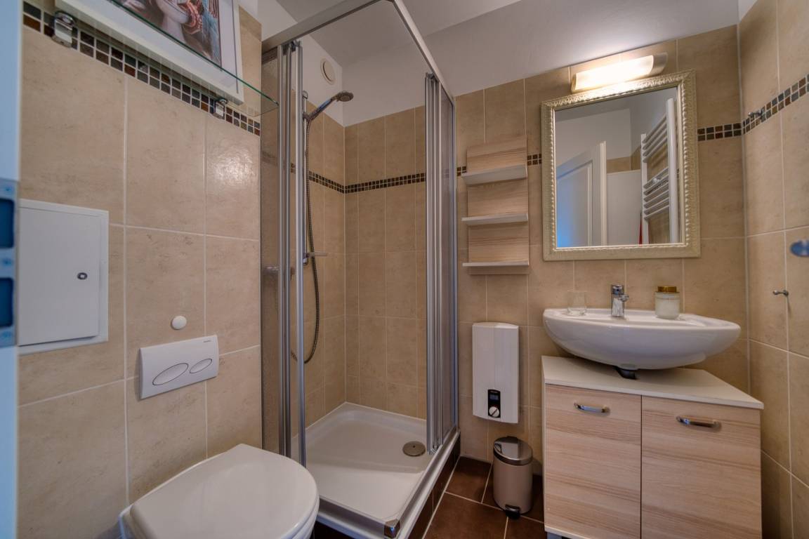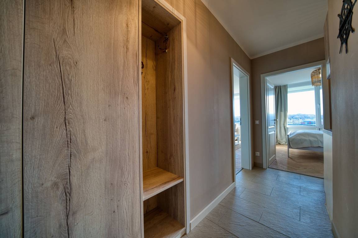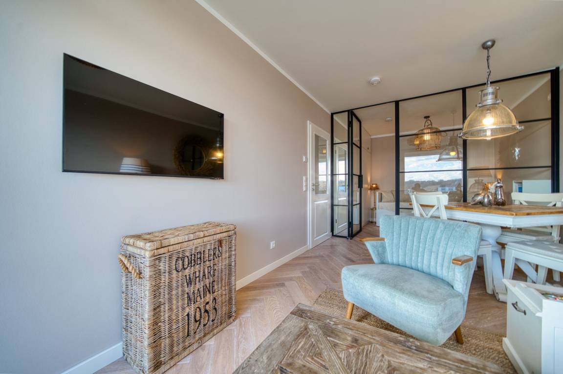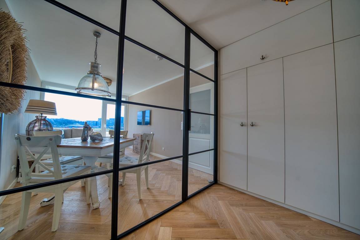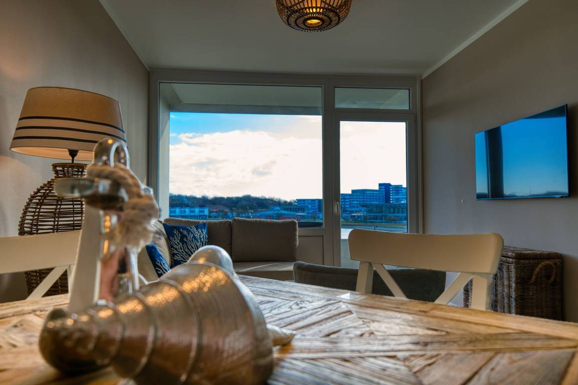 Balkon mit Blick auf den Binnensee, separater Schlafraum mit Doppelbett, Wohnbereich mit Schlafcouch und ausziehbarem Bett. Voll ausgestattete Küche (Ceranfeld, Geschirrspüler, Kühlschrank, Mikrowelle, Kaffeemaschine, Toaster, Wasserkocher). Badezimmer mit Dusche und Handtuchtrockner. WLAN inklusive. Fahrstuhl im Haus, Parkplatz nach Verfügbarkeit.