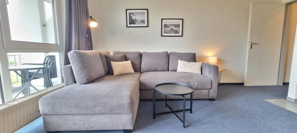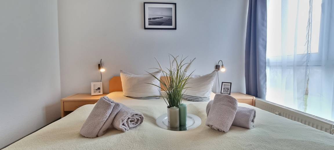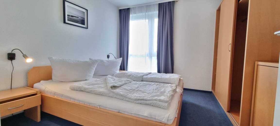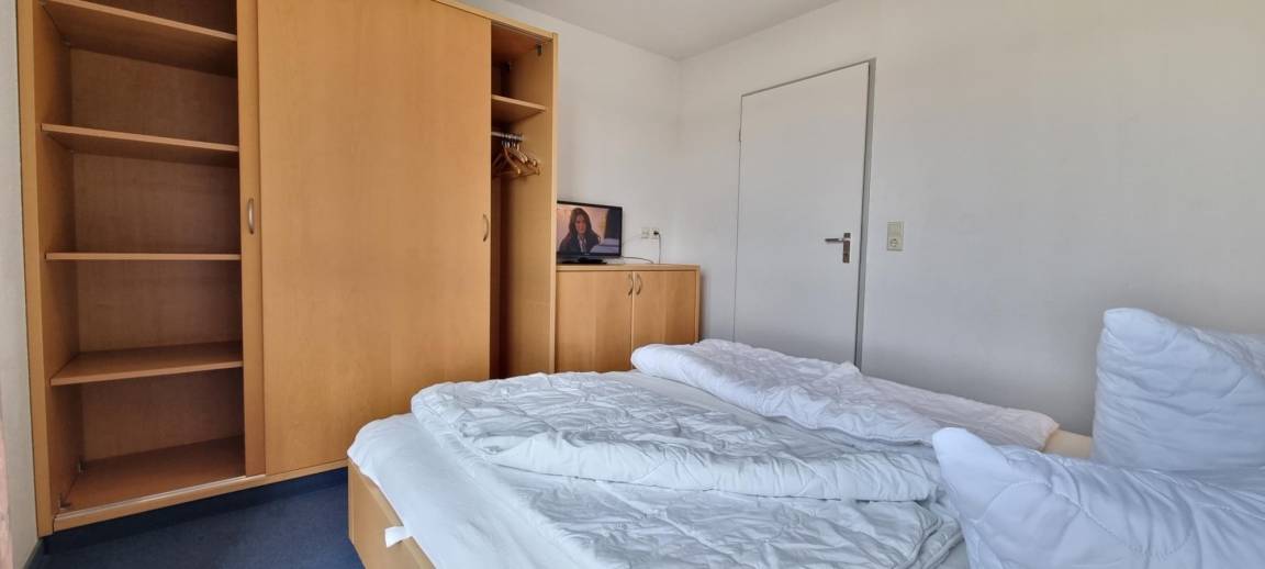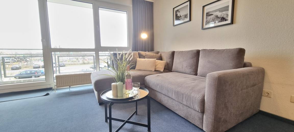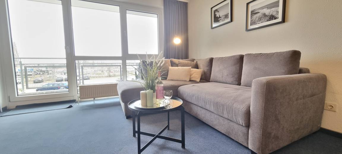 Das separate Schlafzimmer ist ausgestattet mit einem gemütlichen Doppelbett, einem großen Kleiderschrank und einem Fenster mit Blick zum Binnensee – perfekt für erholsame Nächte. Der helle Wohnbereich verfügt über ein komfortables Schlafsofa, das als zusätzliche Schlafgelegenheit oder zum Entspannen genutzt werden kann. Ein moderner Flachbild-TV sorgt für Unterhaltung.