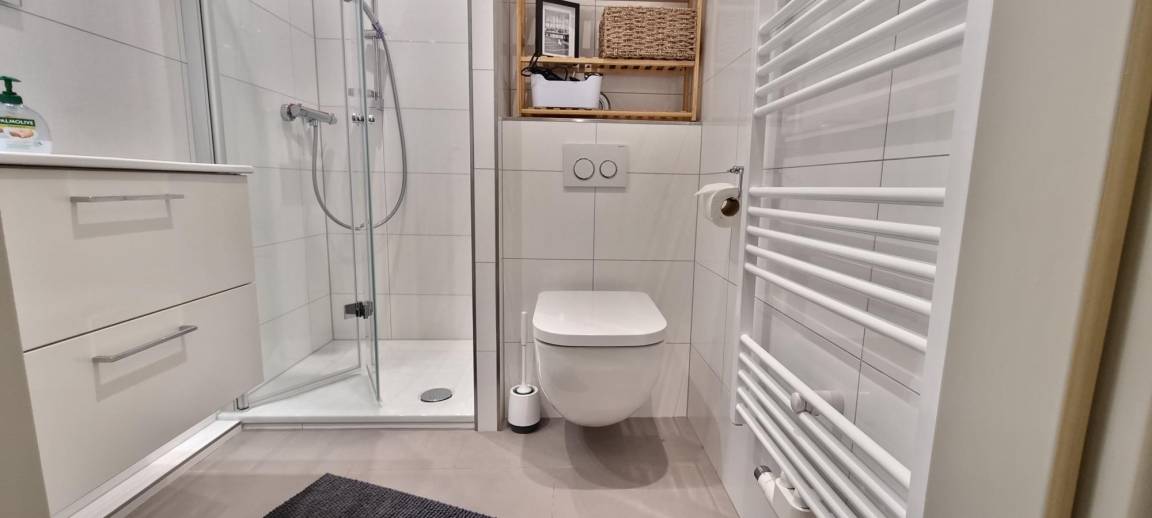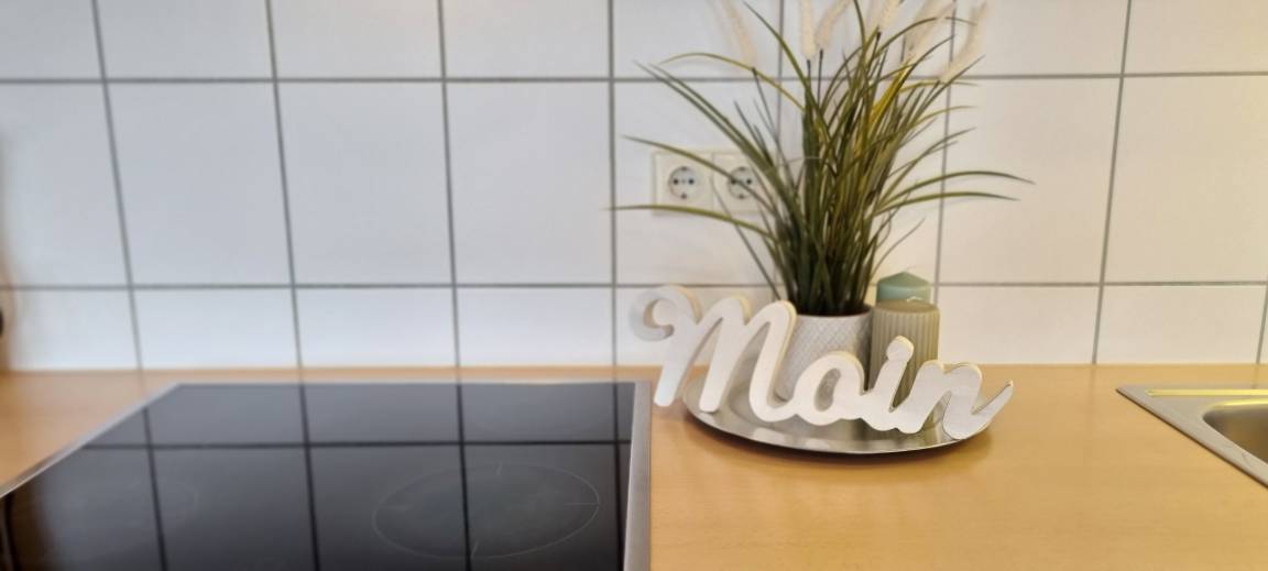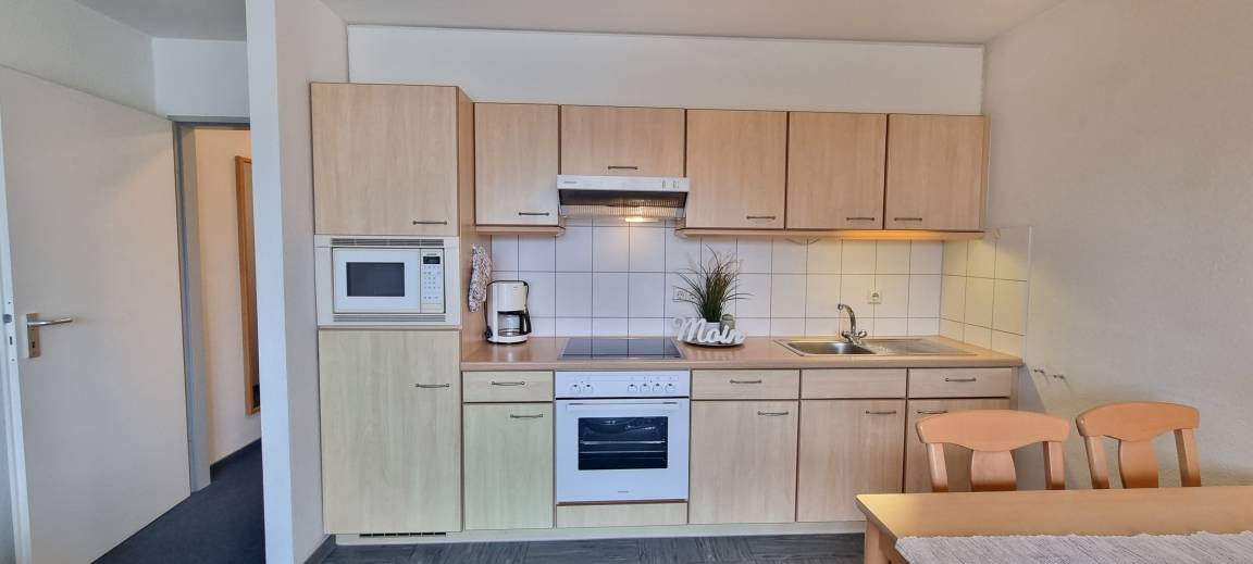 Die integrierte Küchenzeile ist praktisch ausgestattet mit Kochfeld, Kühlschrank, Kaffeemaschine und Wasserkocher, sodass Sie unkompliziert Selbstverpflegung genießen können. Das renovierte Duschbad mit bodentiefer Dusche rundet den modernen Wohnkomfort ab.