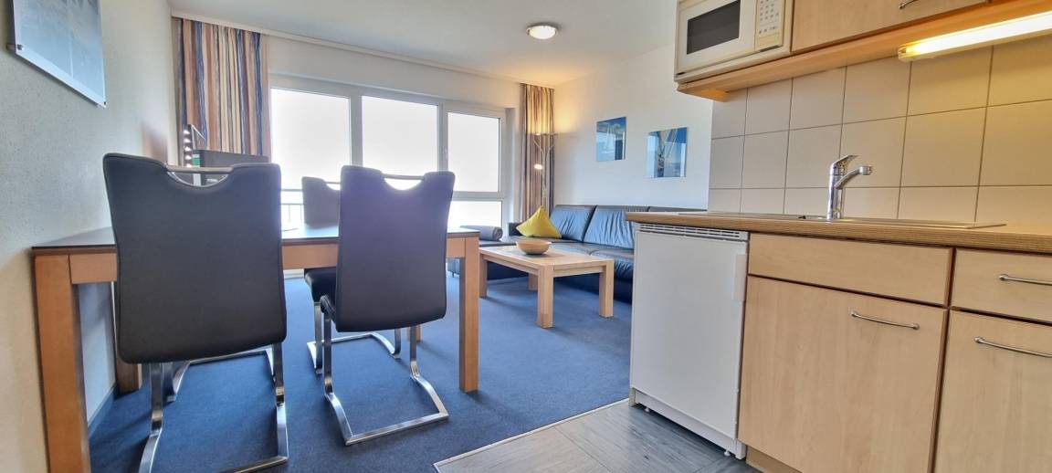Die moderne, offene Küchenzeile ist mit Cerankochfeld, Kühlschrank, Kaffeemaschine, Toaster und Wasserkocher ausgestattet und ermöglicht die Zubereitung von Frühstück, Snacks oder einem gemütlichen Abendessen direkt in der Wohnung. Starten Sie den Tag mit frischem Kaffee und genießen Sie Ihre Mahlzeiten auf dem französischen Balkon mit herrlichem Ostseeblick – ein perfekter Ort für Sonnenaufgänge, frische Seeluft und das maritime Ambiente von Heiligenhafen.