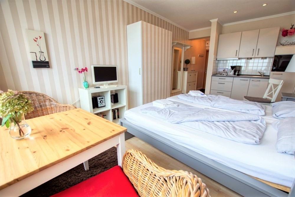 Diese 23 m² große Ferienwohnung in der 3. Etage des Hauses Steinwarder 33 ist ideal für einen entspannten Urlaub zu zweit. Genießen Sie den Meerblick vom Fenster – auch ohne Balkon überzeugt die Wohnung mit heller Raumaufteilung und gemütlicher Ausstattung.